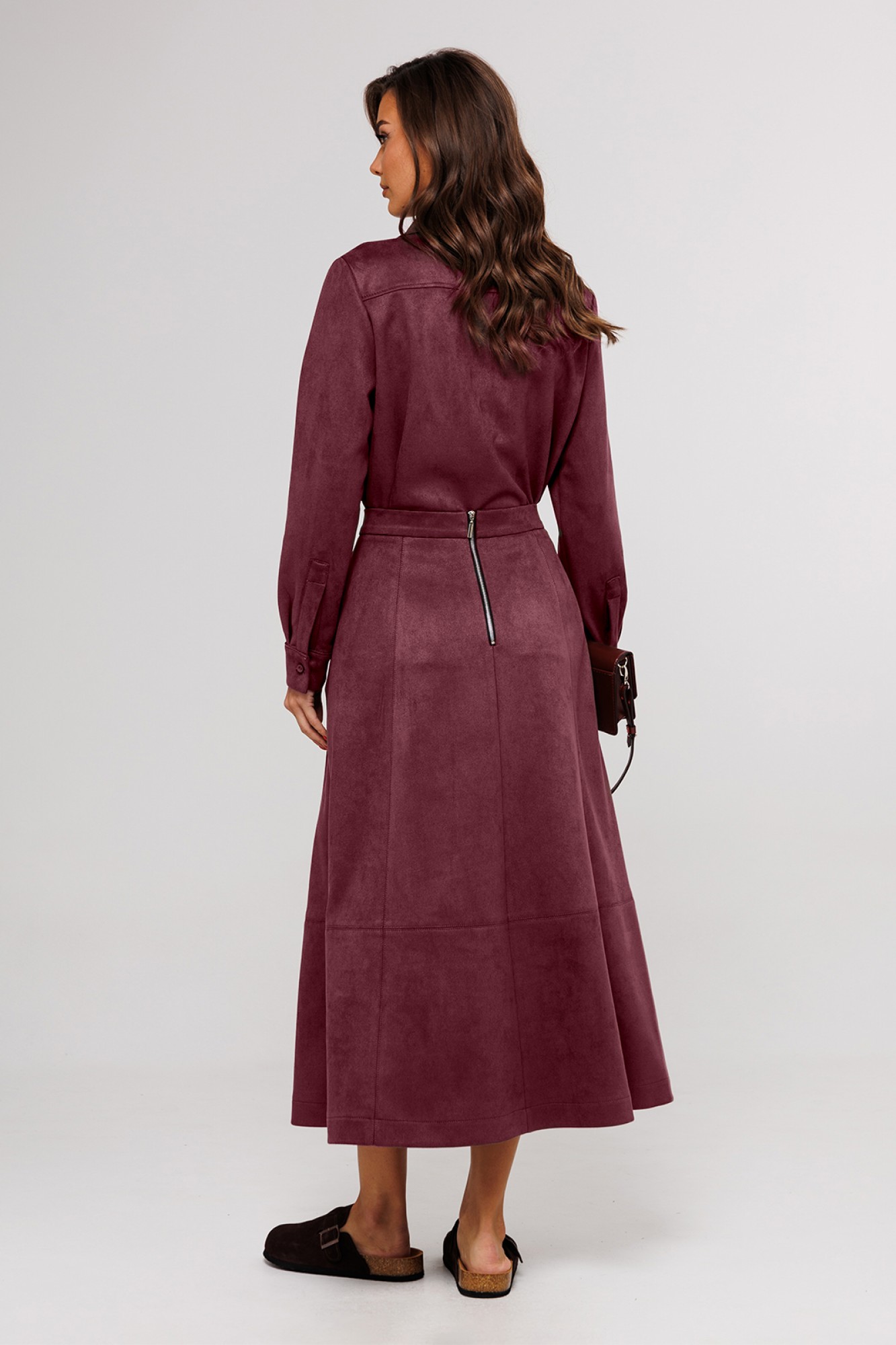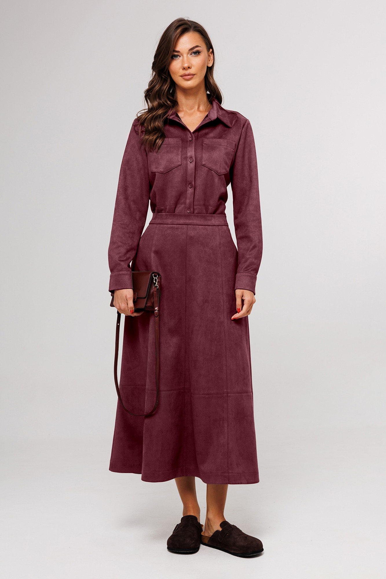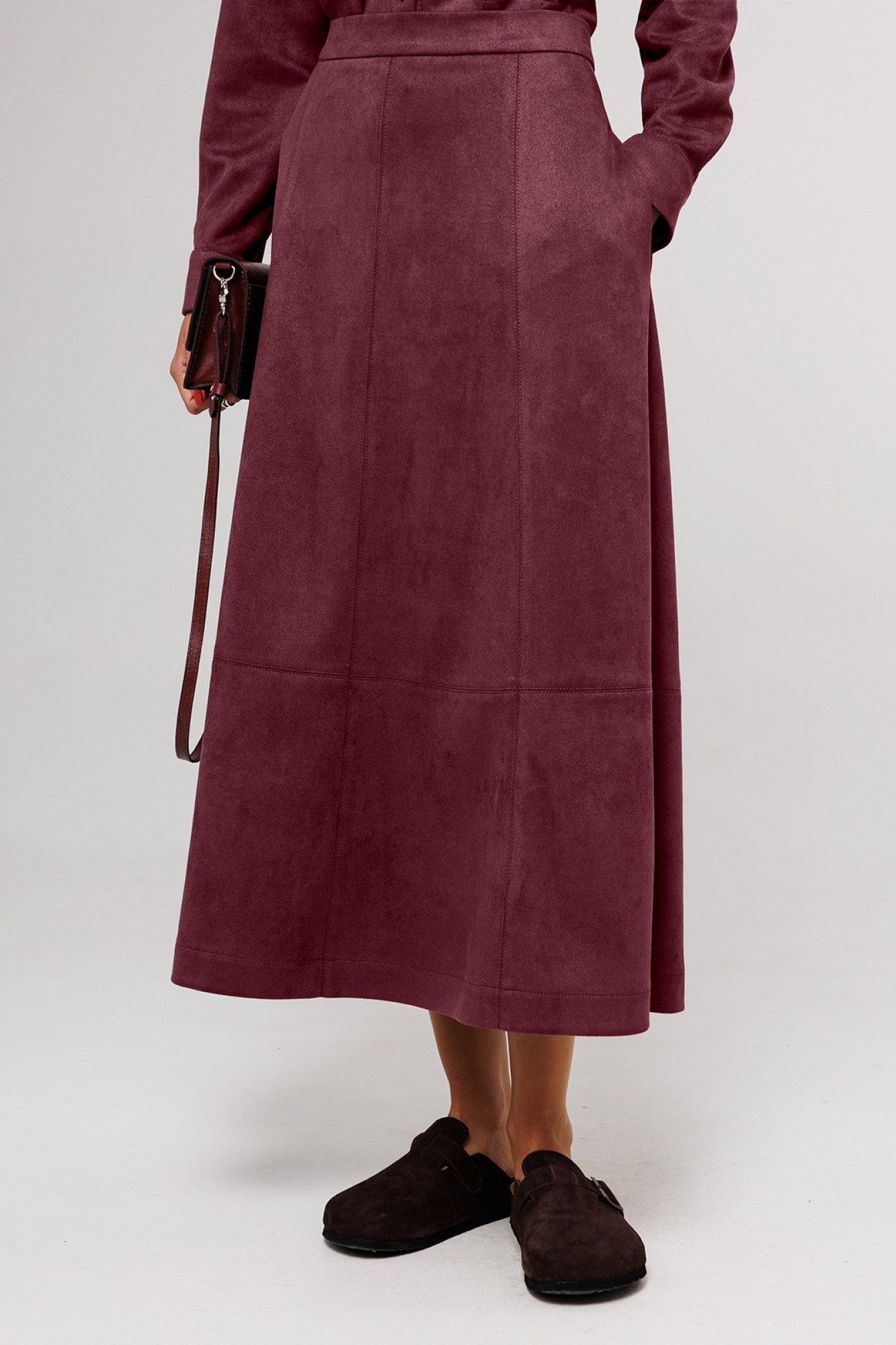 Юбка замшевая длинная А-силуэта на притачном поясе и карманами в боковых швах. Полочка и спинка с центральным швом, рельефами и горизонтальным подрезом. По спинке вверху в центральный шов вставлена металлическая молния. Юбка без подкладки.