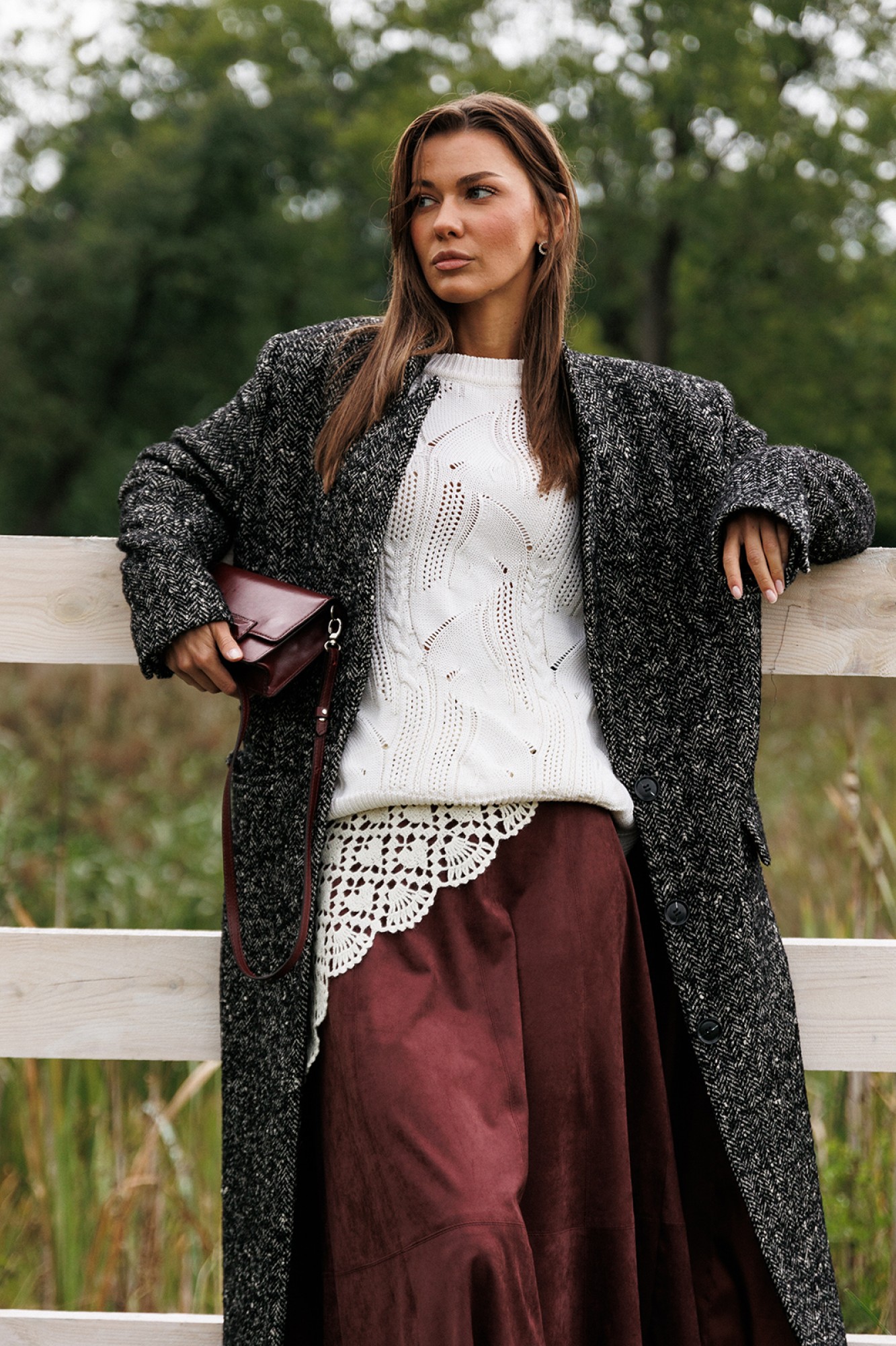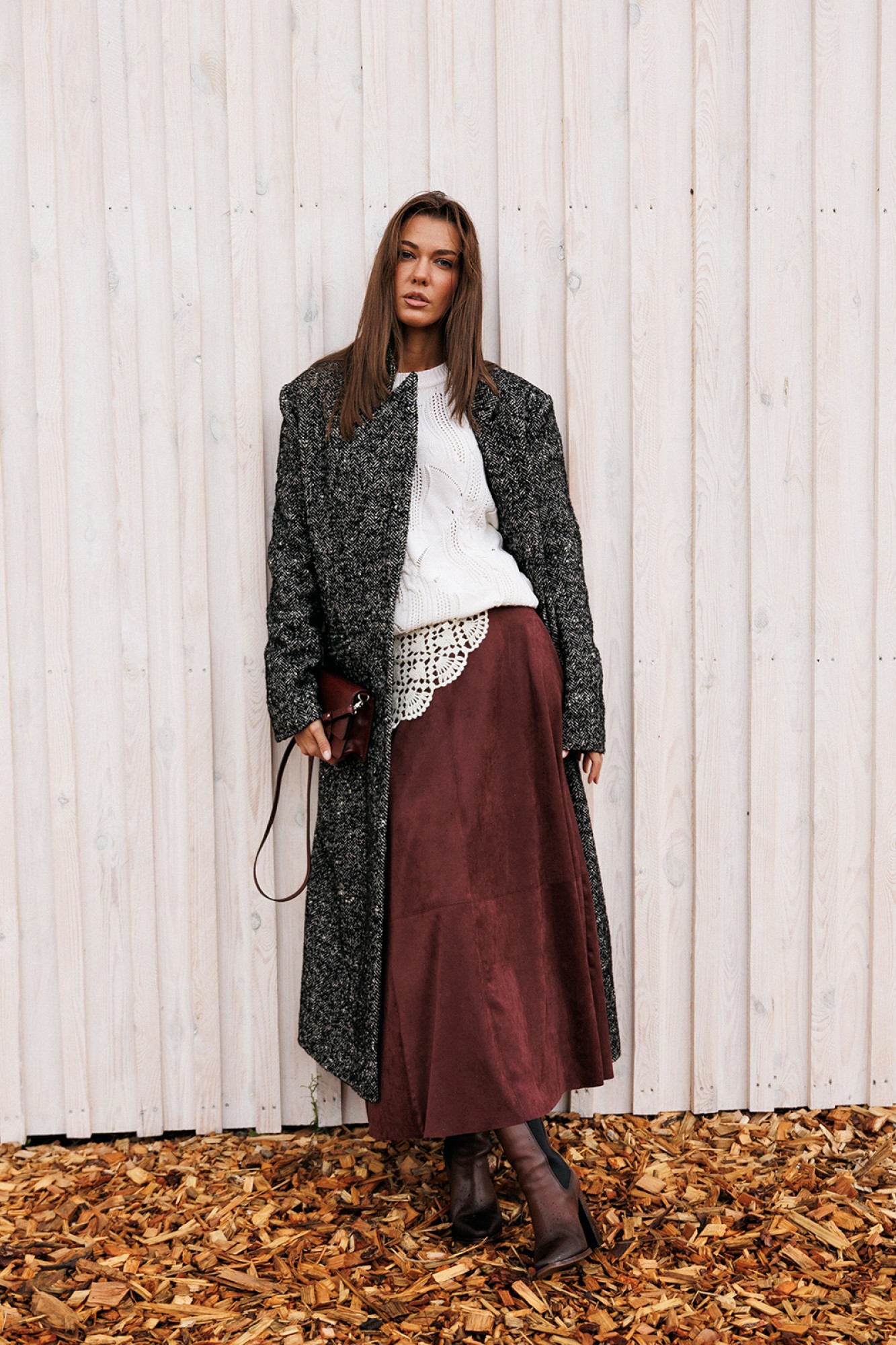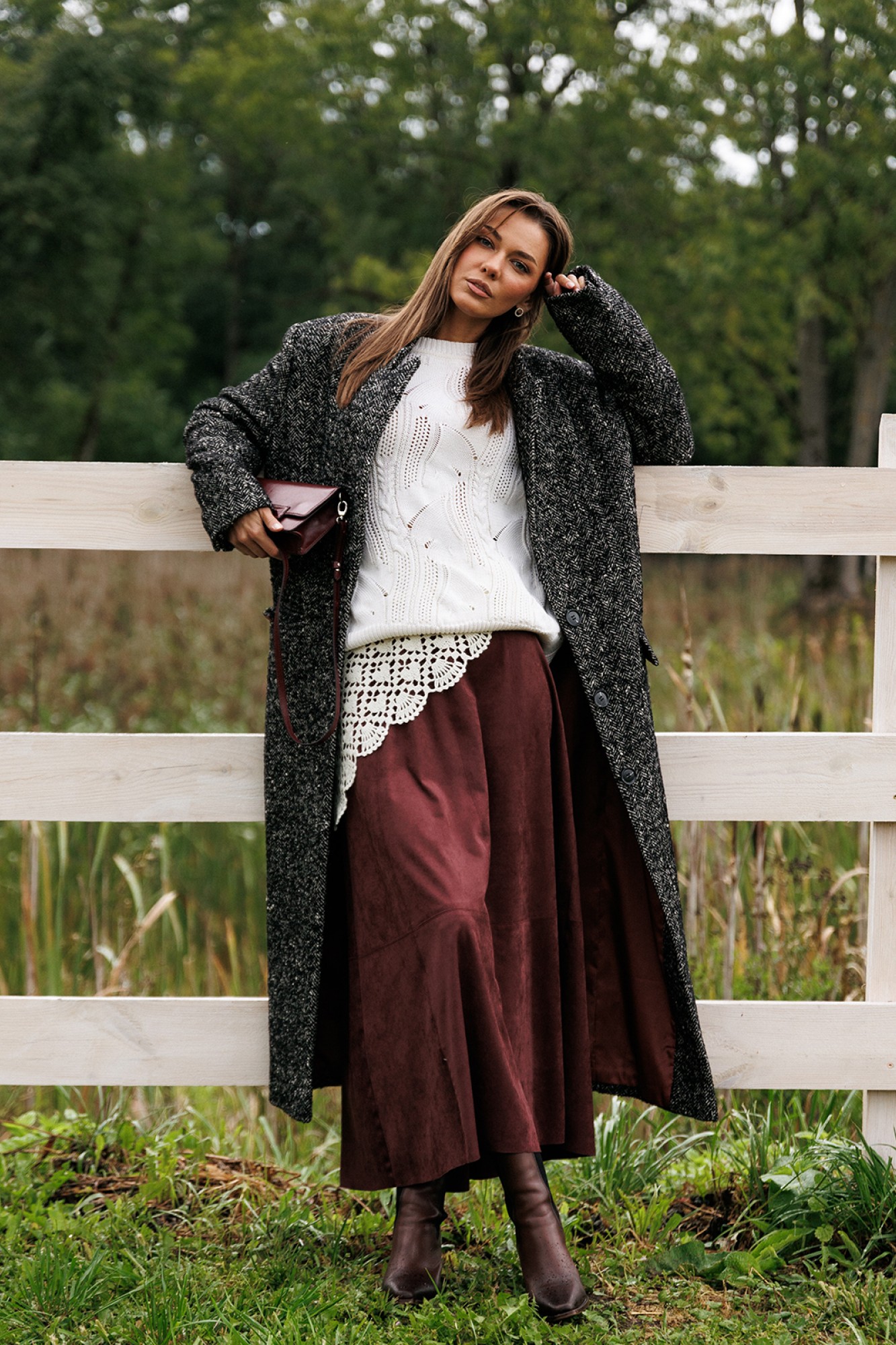 Юбка замшевая длинная А-силуэта на притачном поясе и карманами в боковых швах. Полочка и спинка с центральным швом, рельефами и горизонтальным подрезом. По спинке вверху в центральный шов вставлена металлическая молния. Юбка без подкладки.