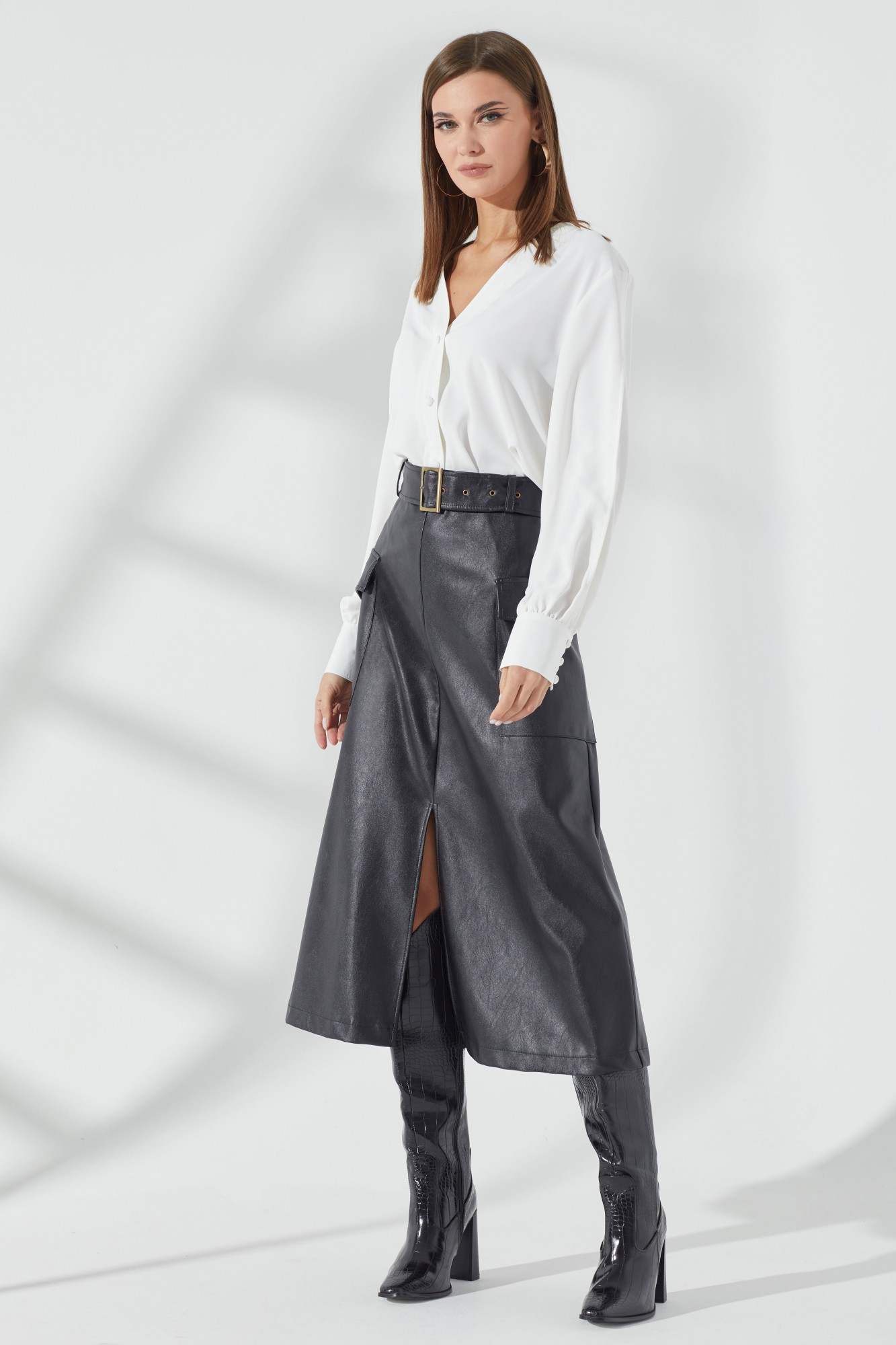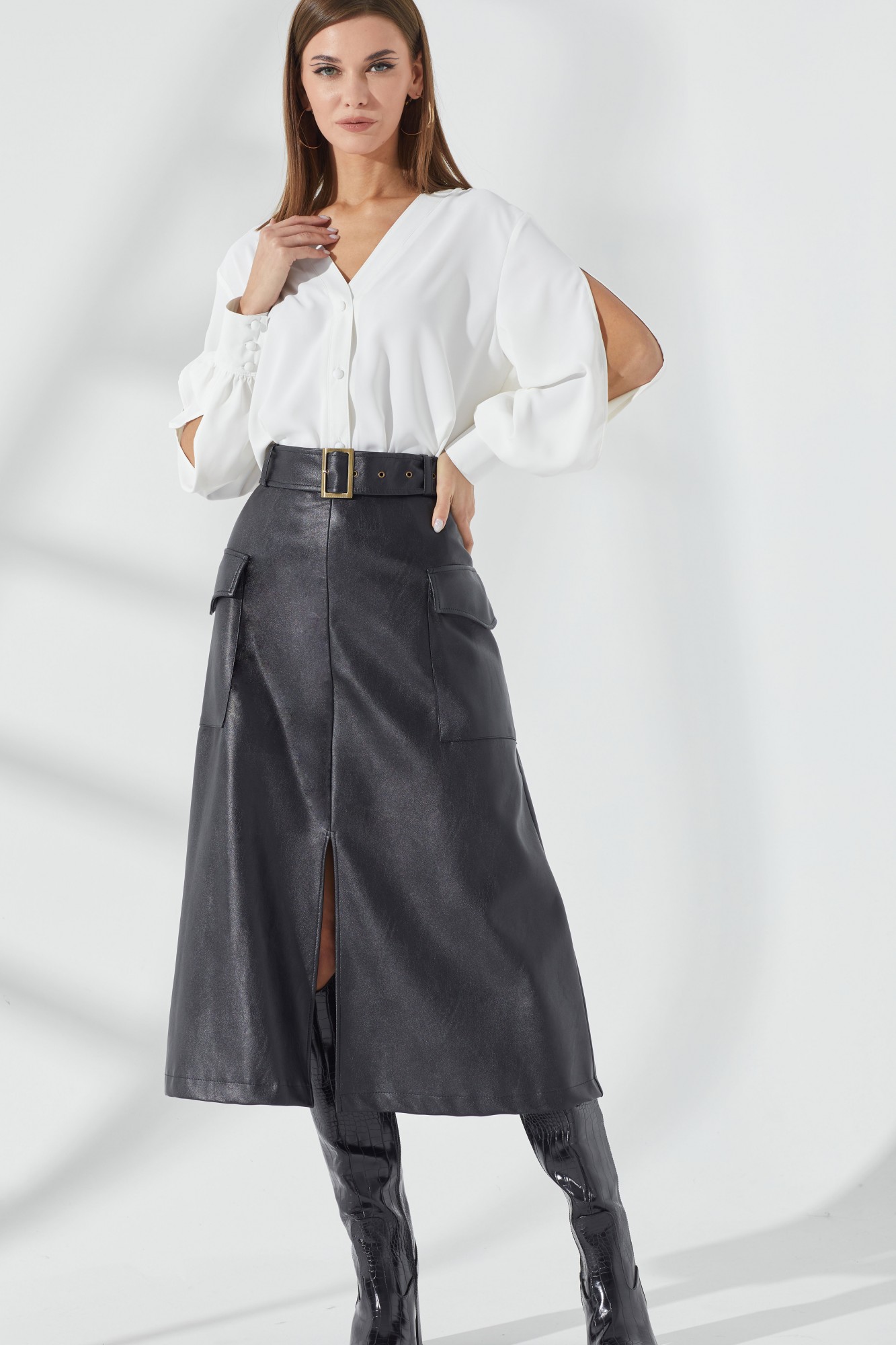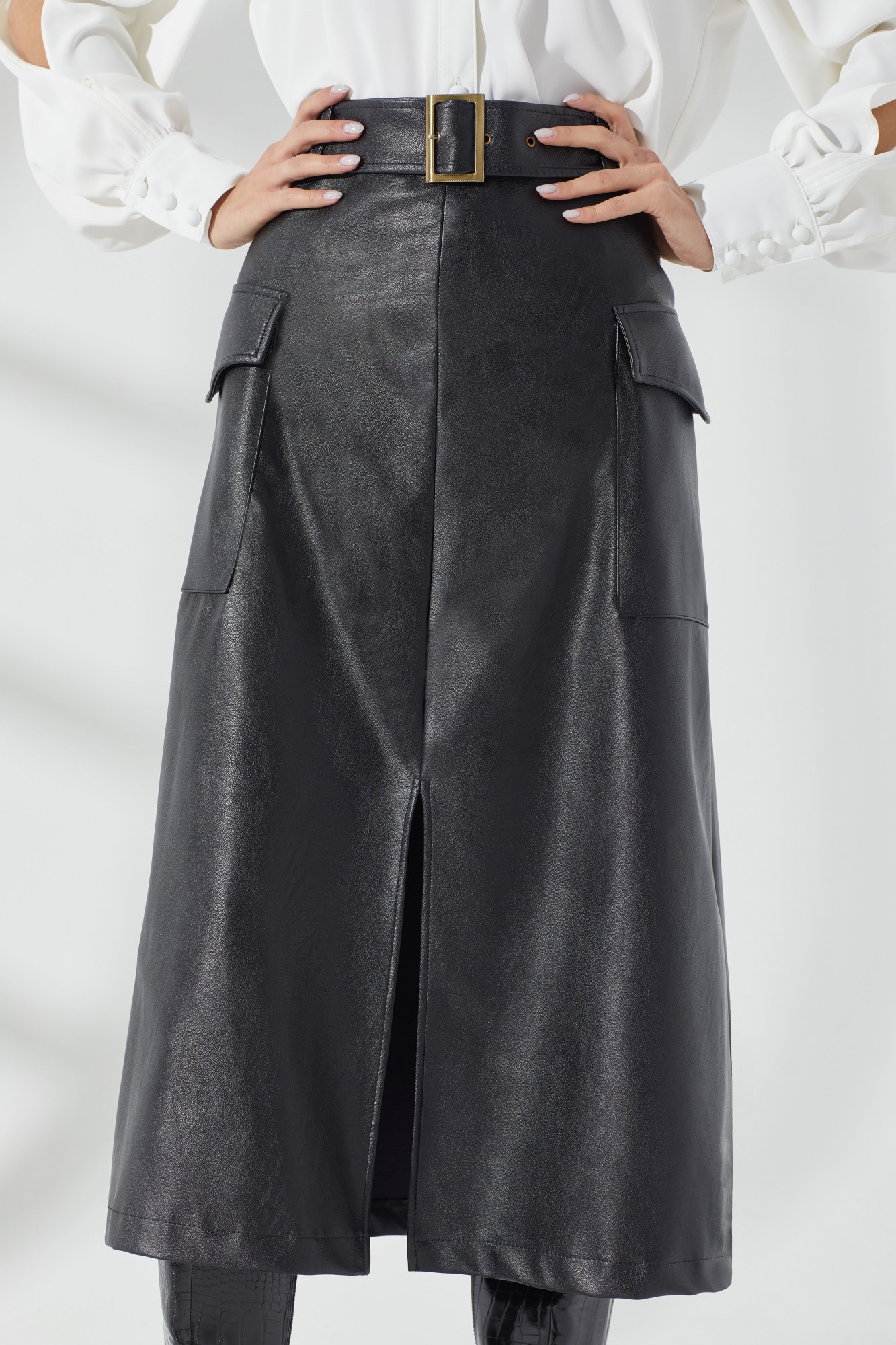 Юбка из эко-кожи на хлопковой основе, расклешенная книзу, на притачном поясе со шлевками для ремня, без подкладки. Переднее полотнище со средним швом, понизу с разрезом. Заднее полотнище с потайной застежкой на молнию в среднем шве. В области бедер обработаны накладные карманы с клапаном. В комплект входит съемный ремень из основной ткани.