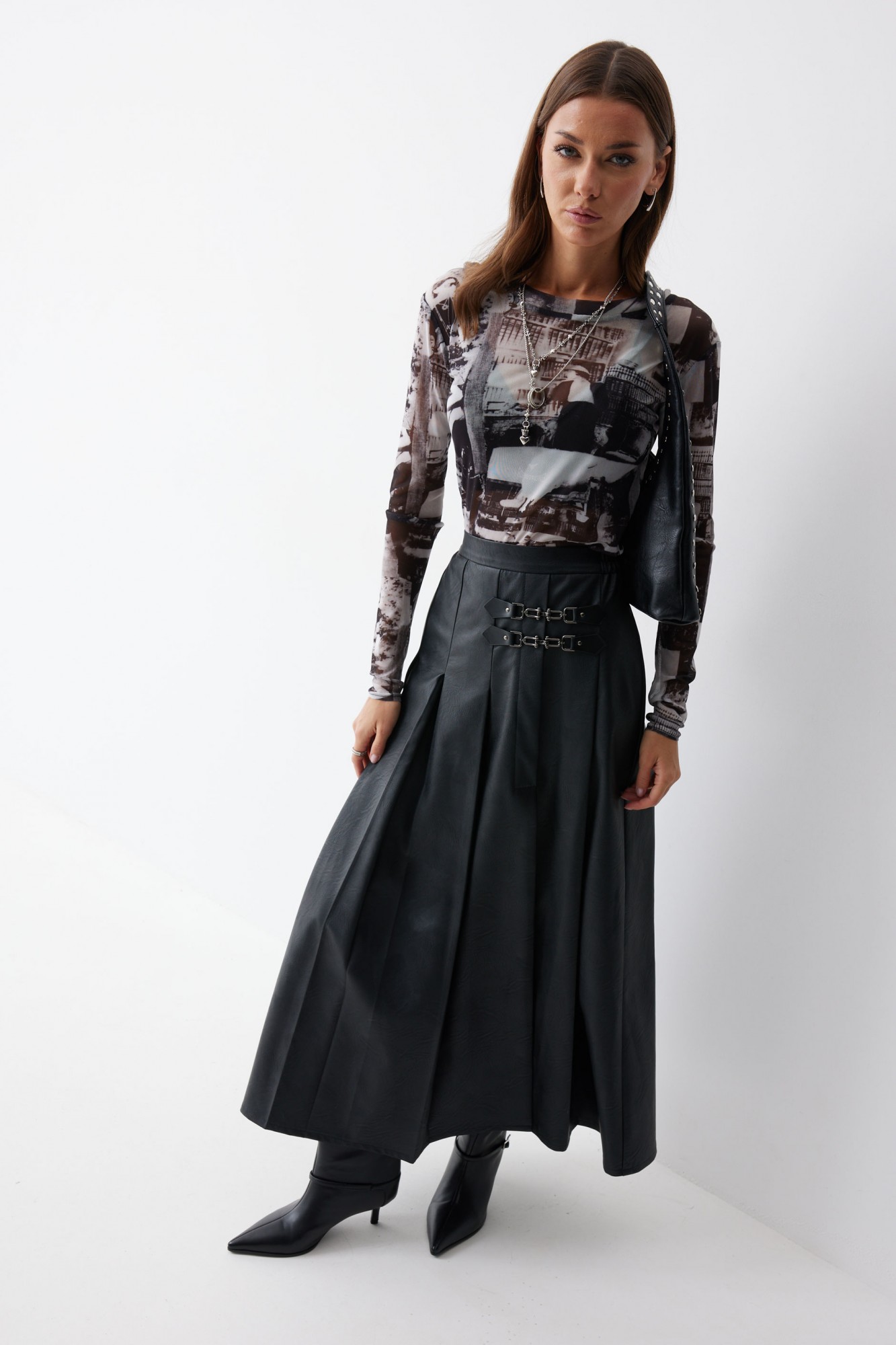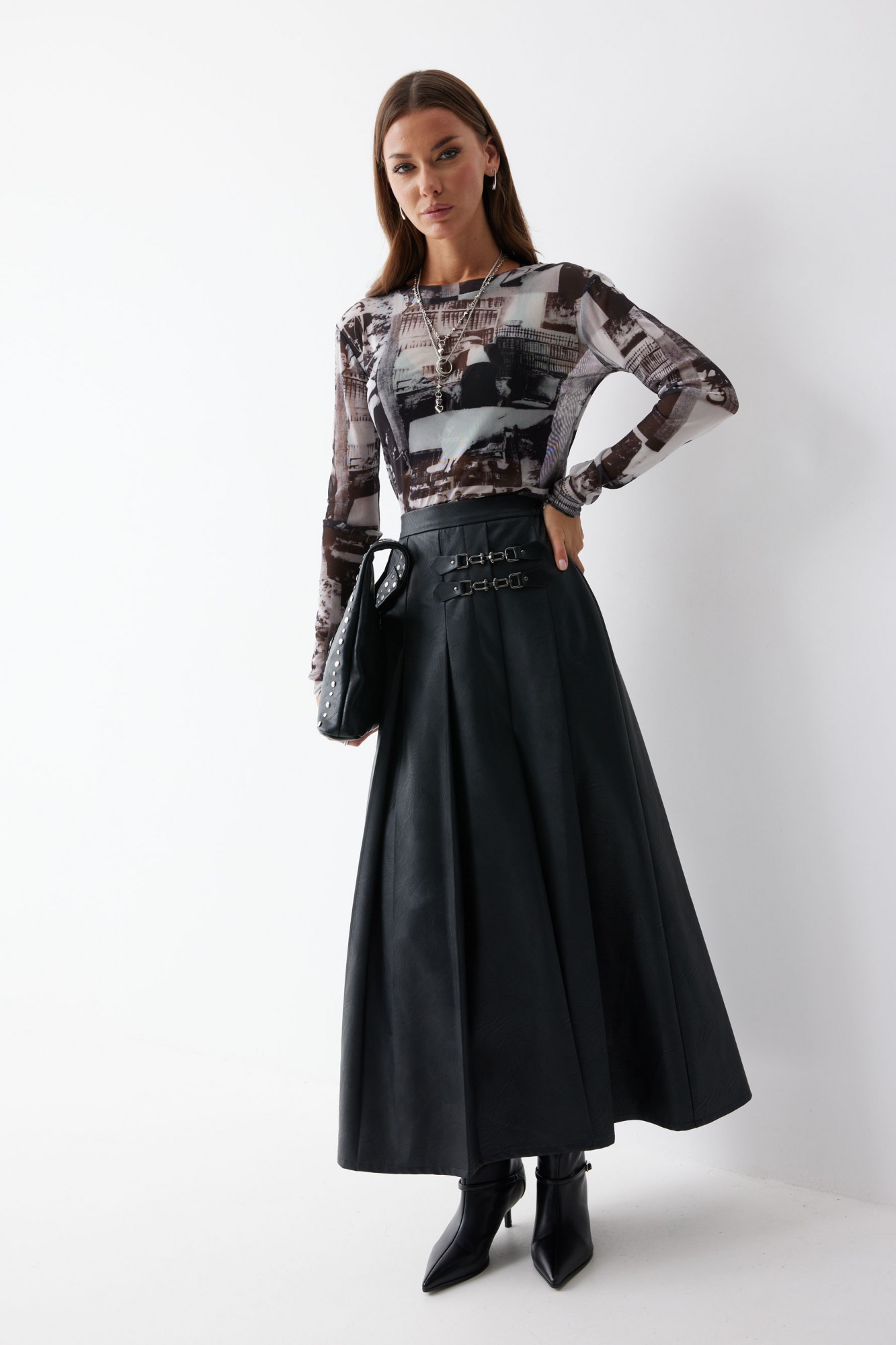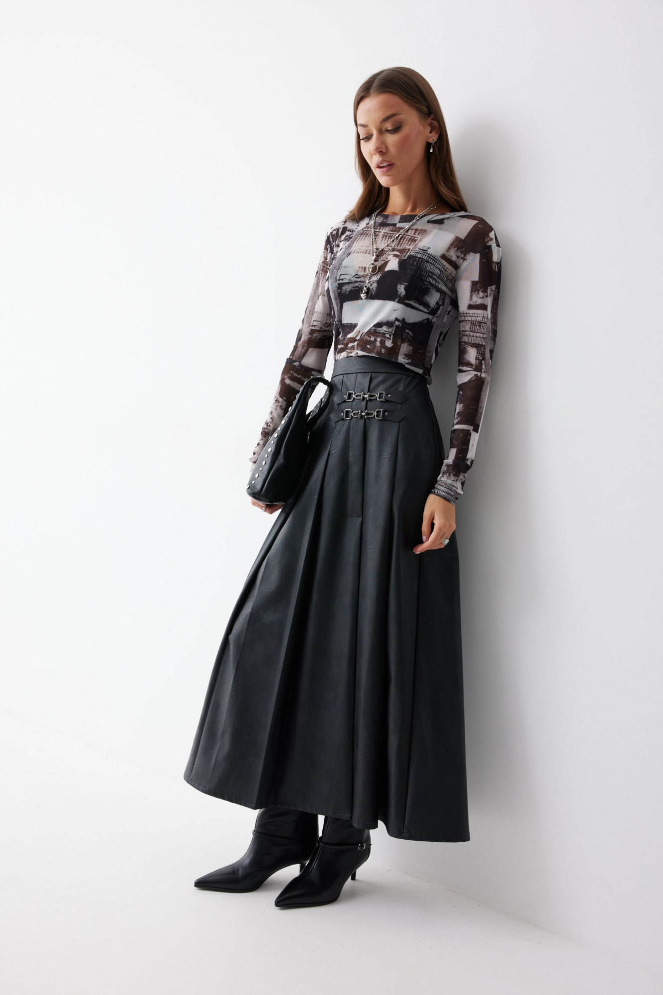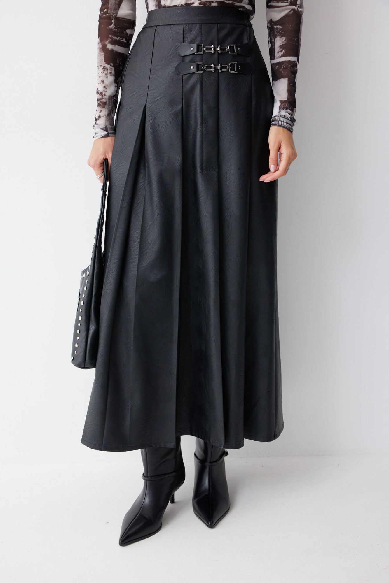 Юбка А-силуэта из экокожи на хлопковой основе длины макси. По верху юбки притачной пояс со шлевками для ремня. Переднее полотнище юбки со складками и шпицей и декоративной фурнитурой. На задних половинках расположены таллиевое вытачки. На спинке в центральном шве потайная молния. По бокам в поясе вставлена резинка от складки до вытачки.