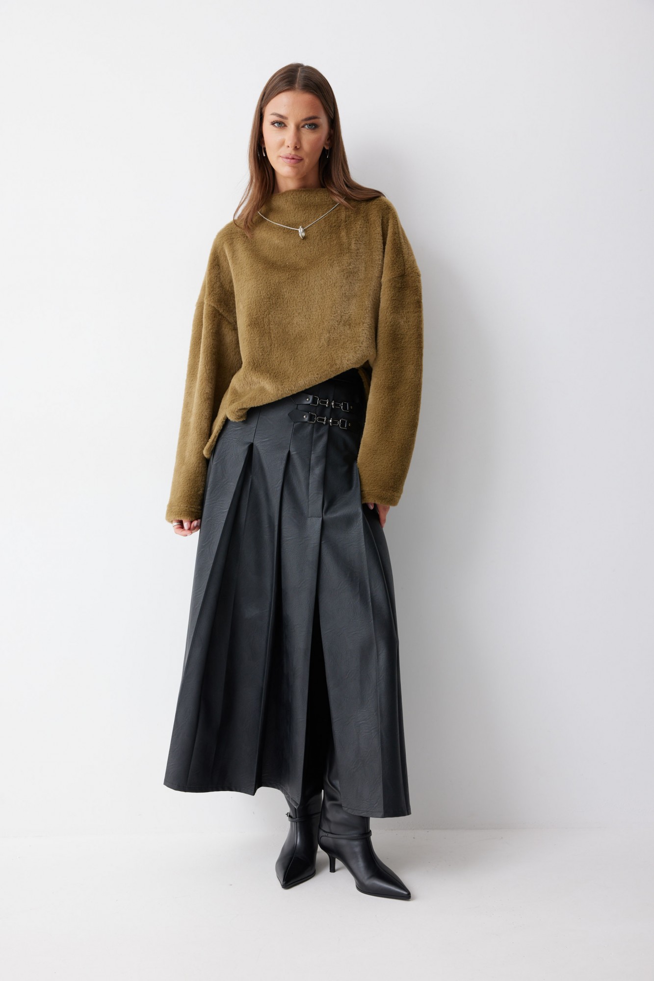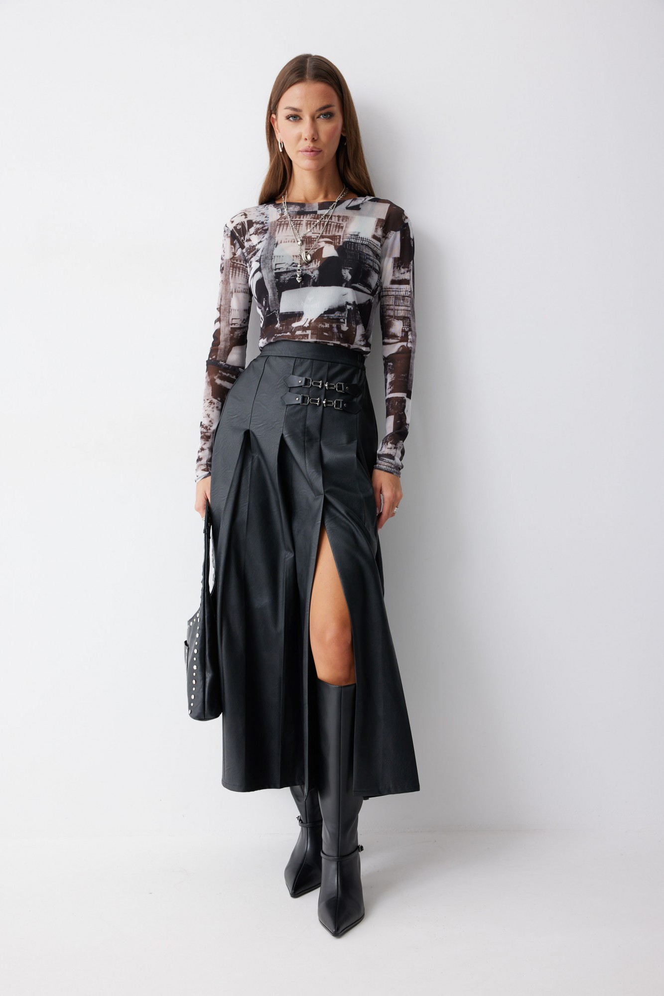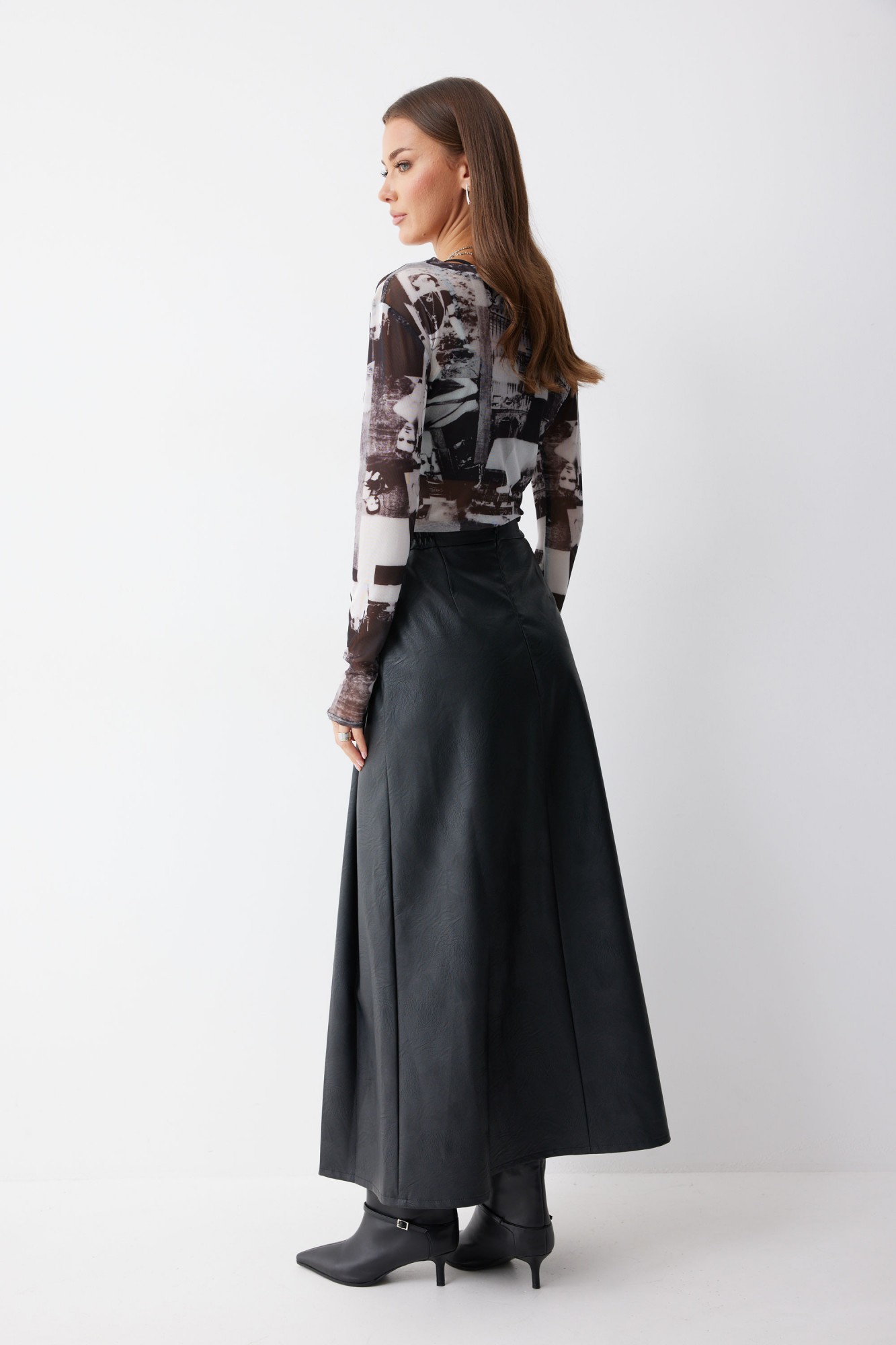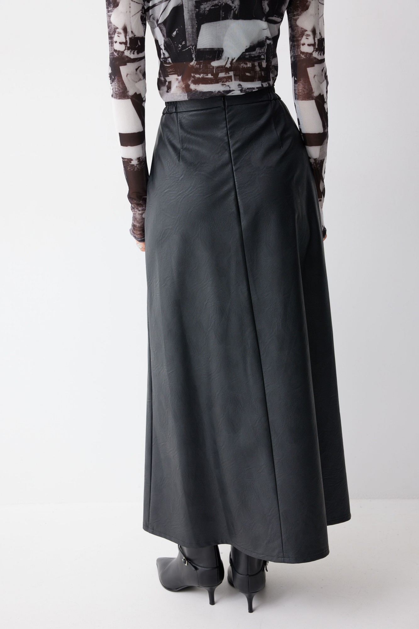 Юбка А-силуэта из экокожи на хлопковой основе длины макси. По верху юбки притачной пояс со шлевками для ремня. Переднее полотнище юбки со складками и шпицей и декоративной фурнитурой. На задних половинках расположены таллиевое вытачки. На спинке в центральном шве потайная молния. По бокам в поясе вставлена резинка от складки до вытачки.