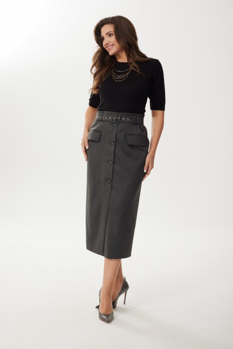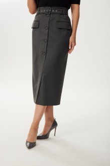 Юбка миди прямого силуэта слегка зауженная книзу. По переду прорезные карманы с клапаном и двумя обтачками. Спереди - застежка на пуговицы. Пояс прямой, сзади резинка. В комплекте ремень из основной ткани с блочками и пряжкой, обтянутой основной тканью