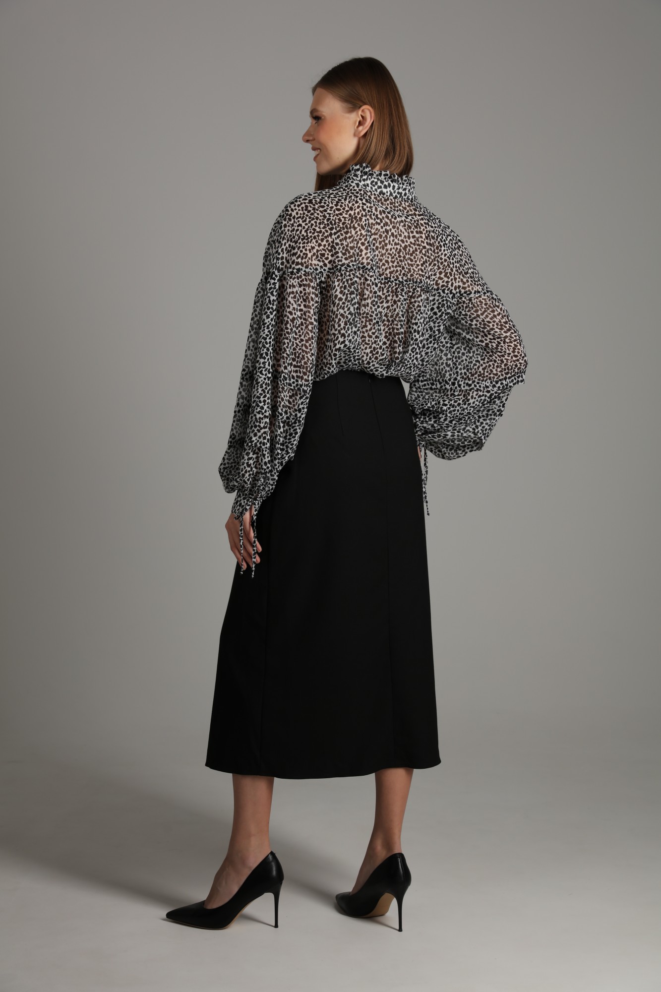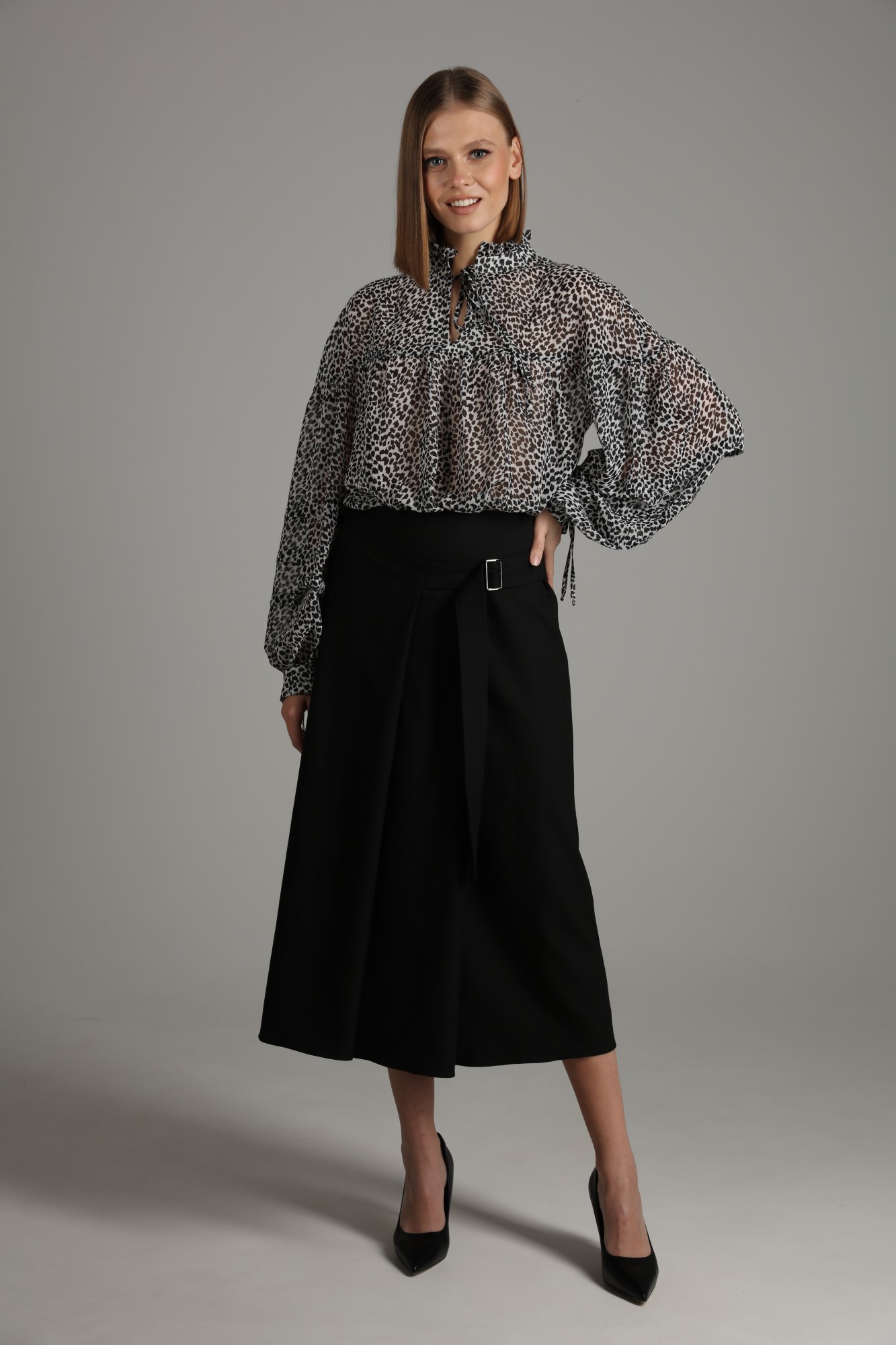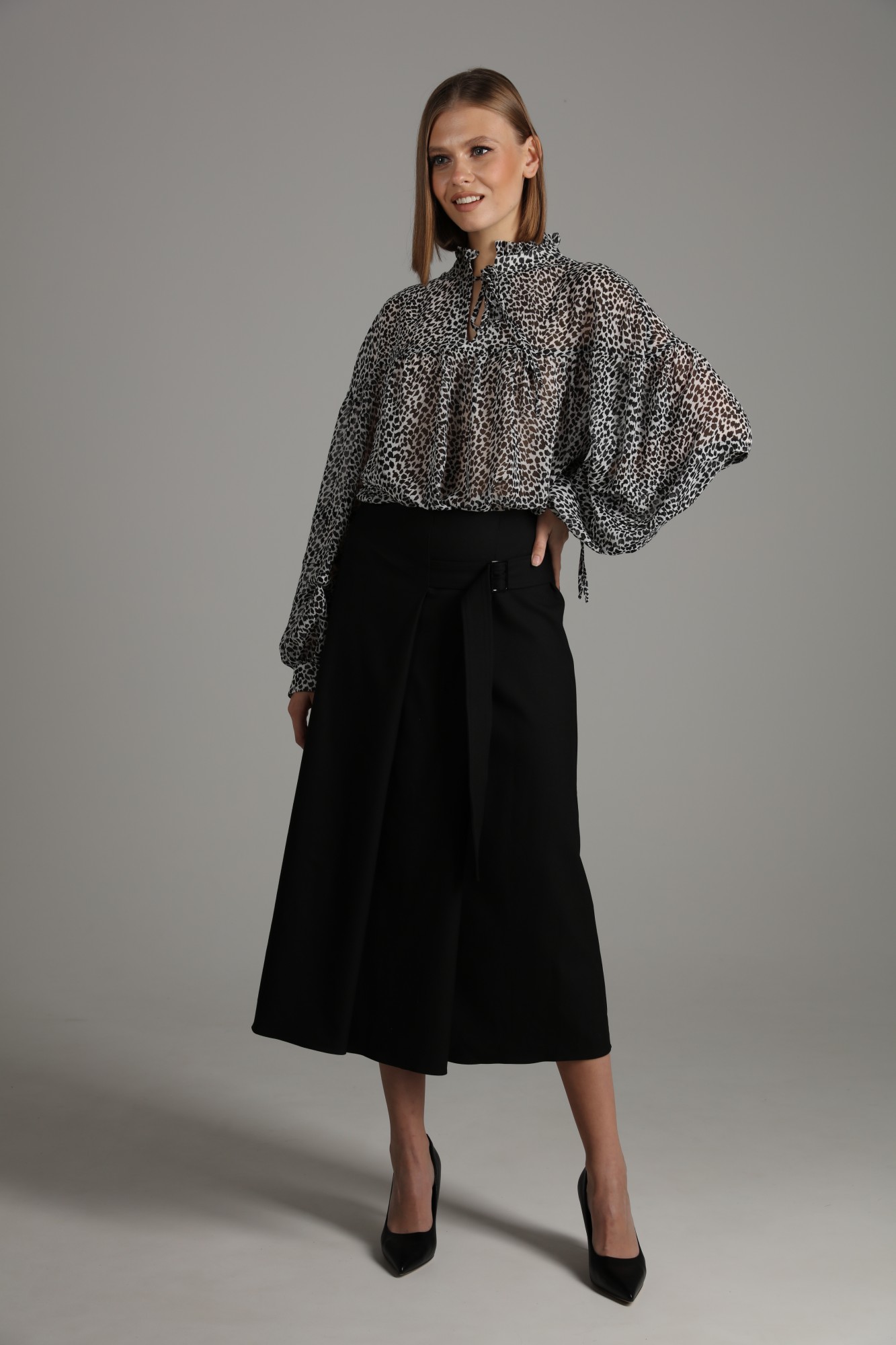 Элегантная юбка миди с запахом полуприлегающего силуэта. Правая часть переднего полотнища с двумя вертикальными односторонними складками и цельнокроеным подбортом. Запах юбки фиксируется поясом с пряжкой. Задняя часть с талиевыми вытачками. Верхний срез юбки обработан обтачками.