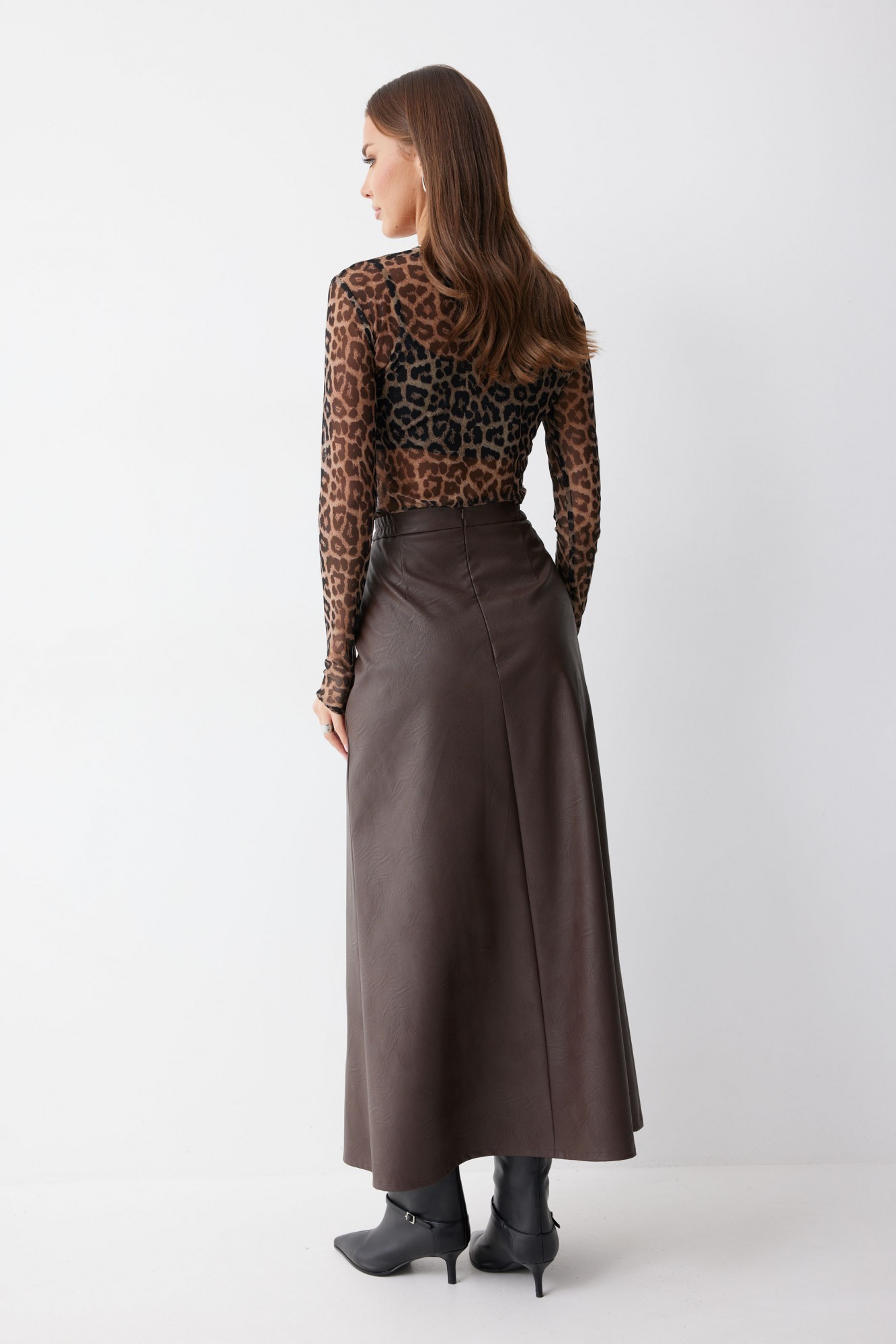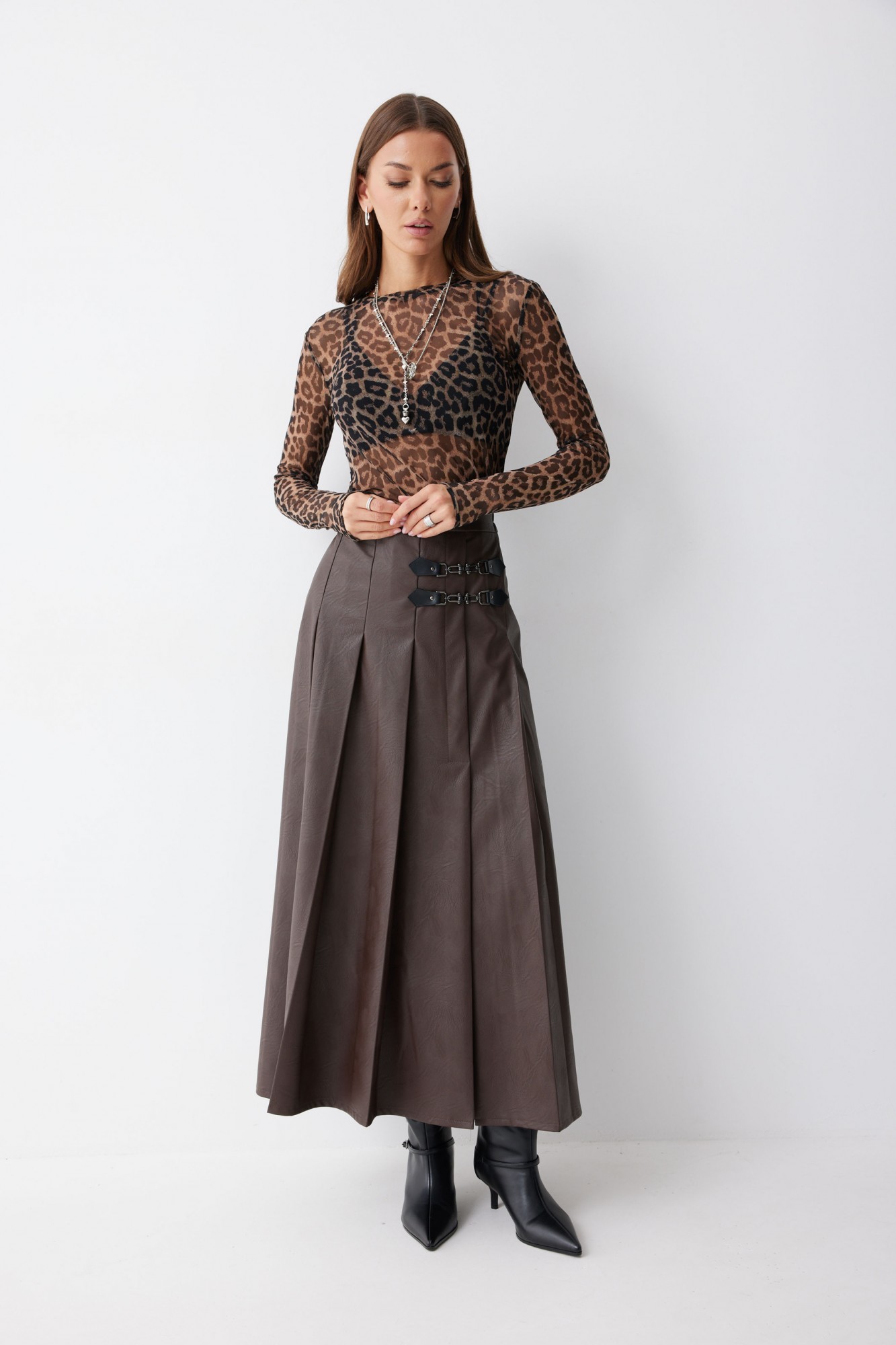 Юбка А-силуэта из экокожи на хлопковой основе длины макси. По верху юбки притачной пояс со шлевками для ремня. Переднее полотнище юбки со складками и шпицей и декоративной фурнитурой. На задних половинках расположены таллиевое вытачки. На спинке в центральном шве потайная молния. По бокам в поясе вставлена резинка от складки до вытачки.