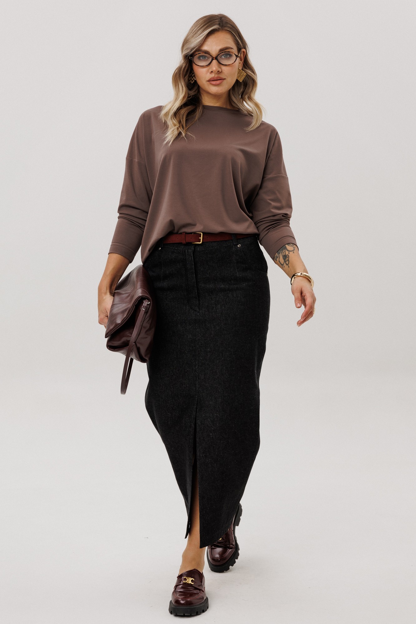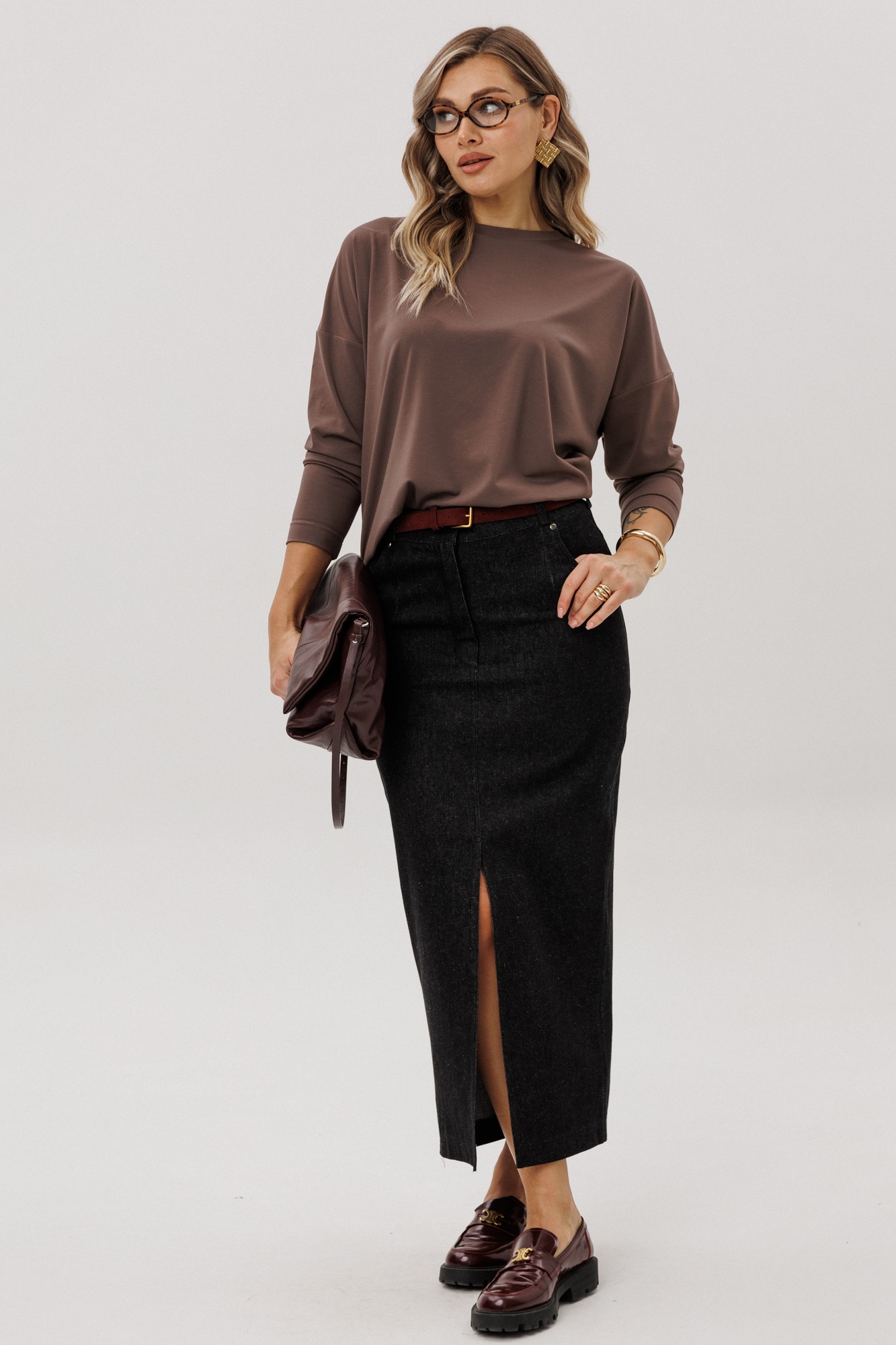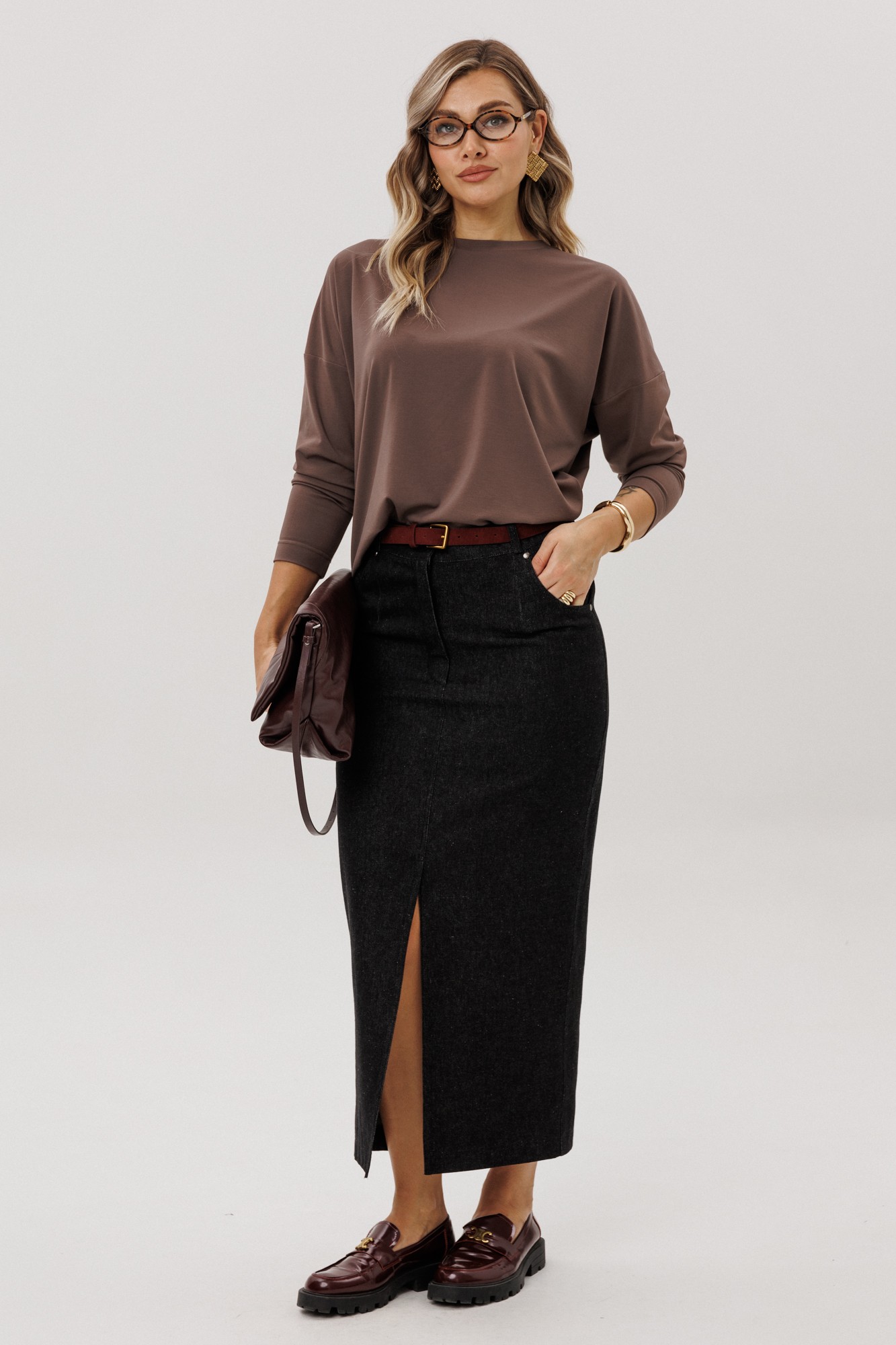 Юбка прямого силуэта из хлопчатобумажной ткани в джинсовом стиле. Застёжка по центру передней половинки на тесьму-молнию. В среднем шве передней половинки разрез.