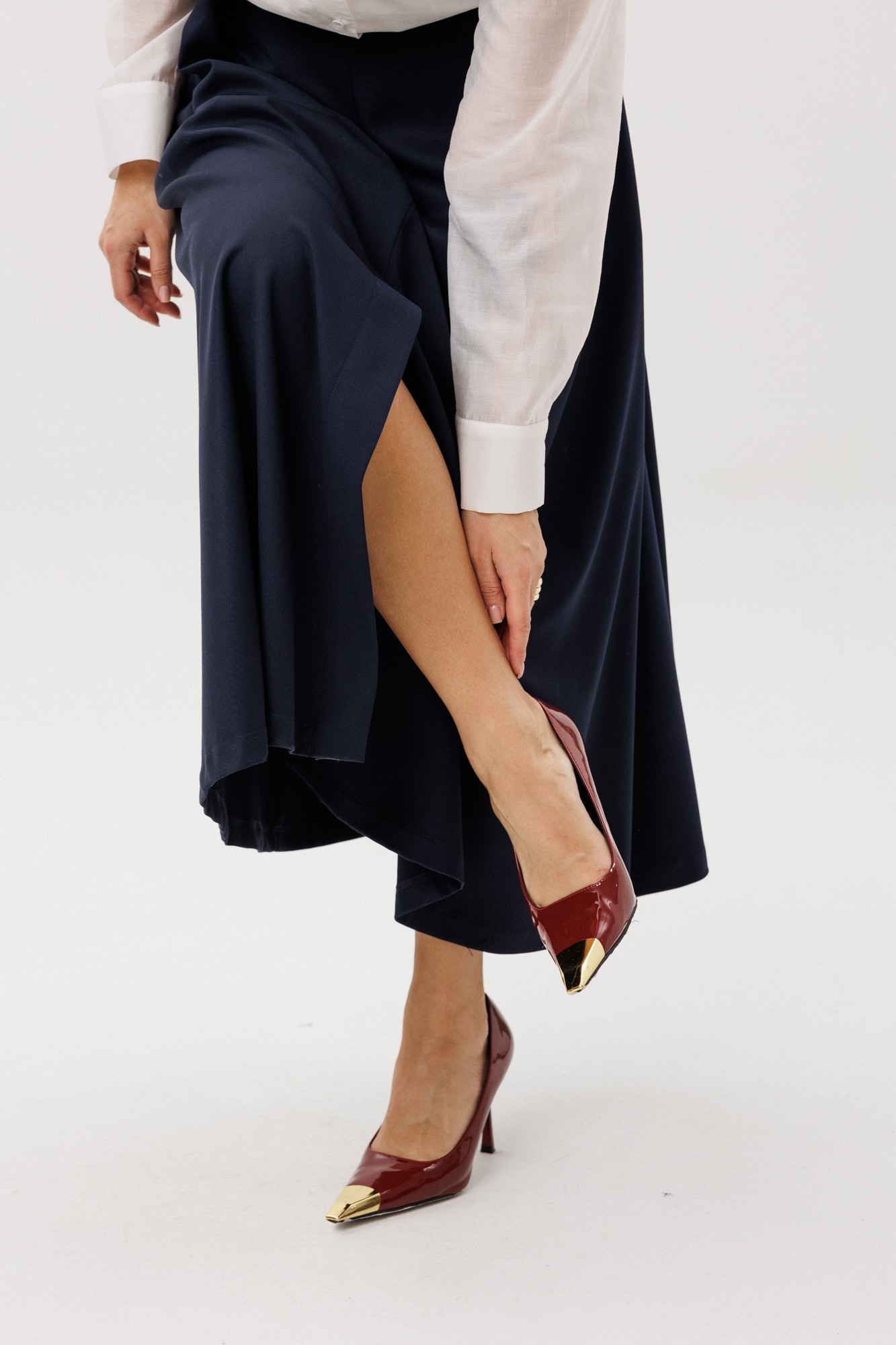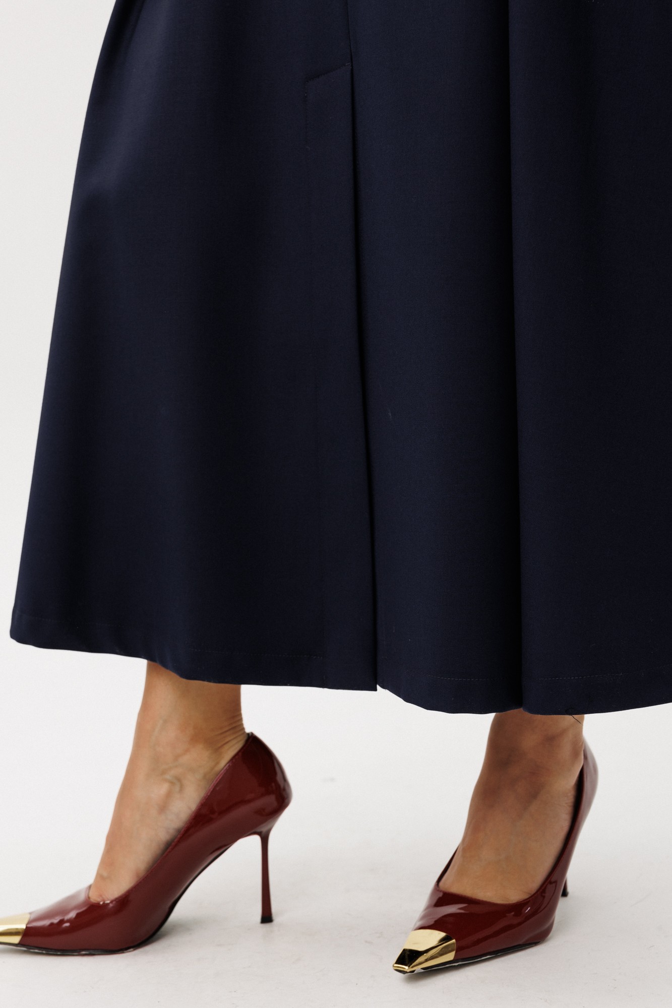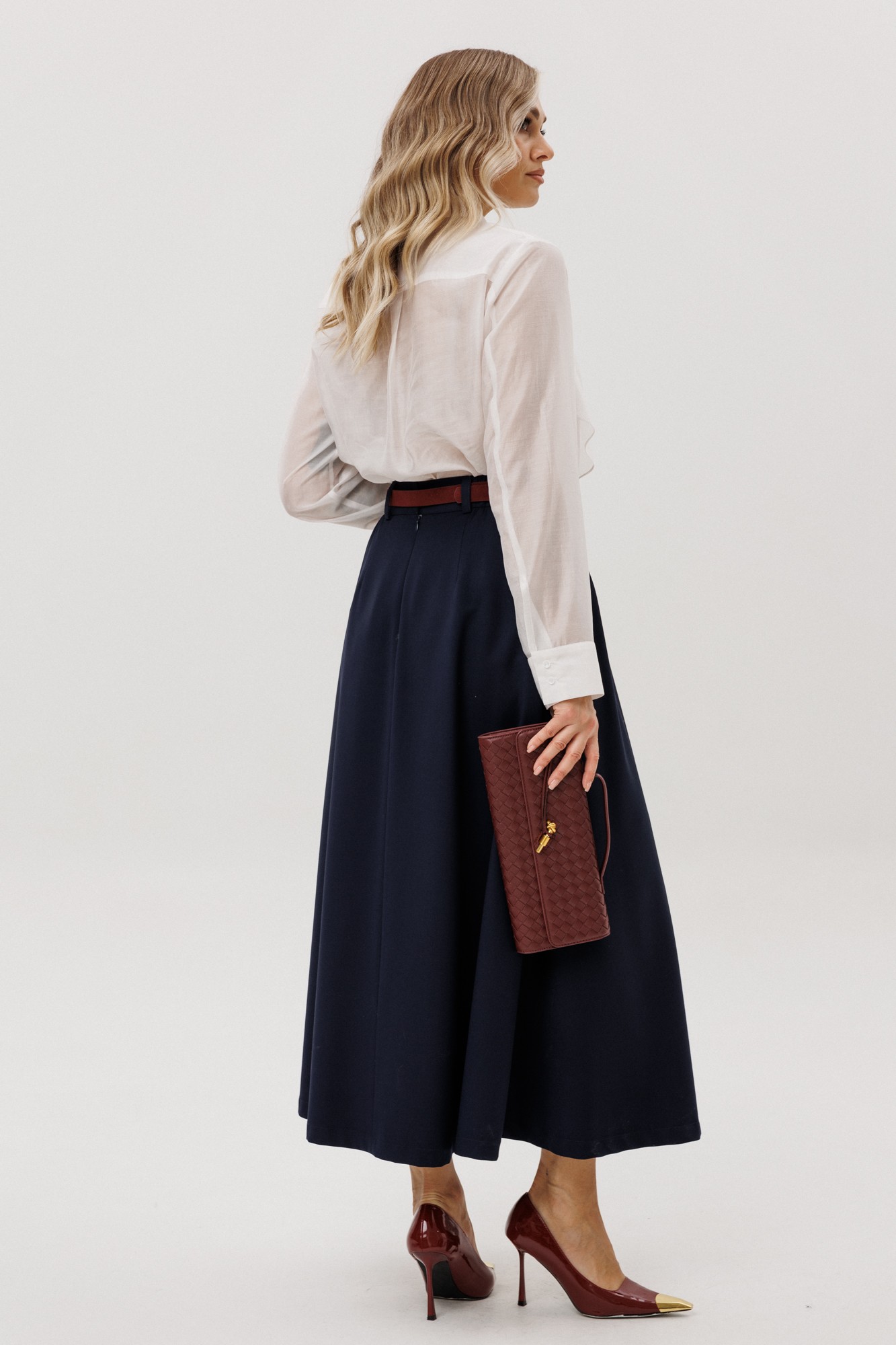 Юбка расклешенная на подкладке. По передней половинке по линии талии складки. По среднему шву передней половинки шлица. В боковых швах карманы. По среднему шву задней половинки по линии талии застежка на потайную тесьму-молнию. Ширина по линии талии регулируется резинкой.
