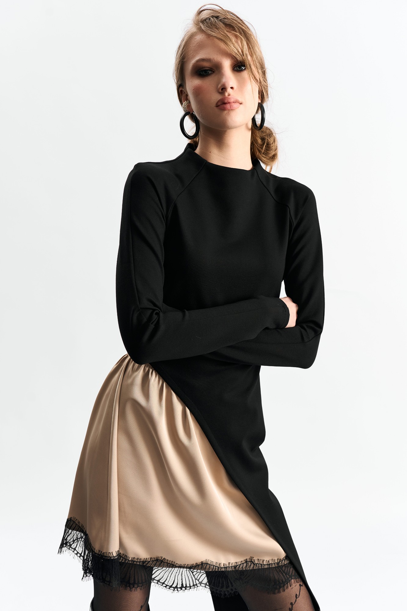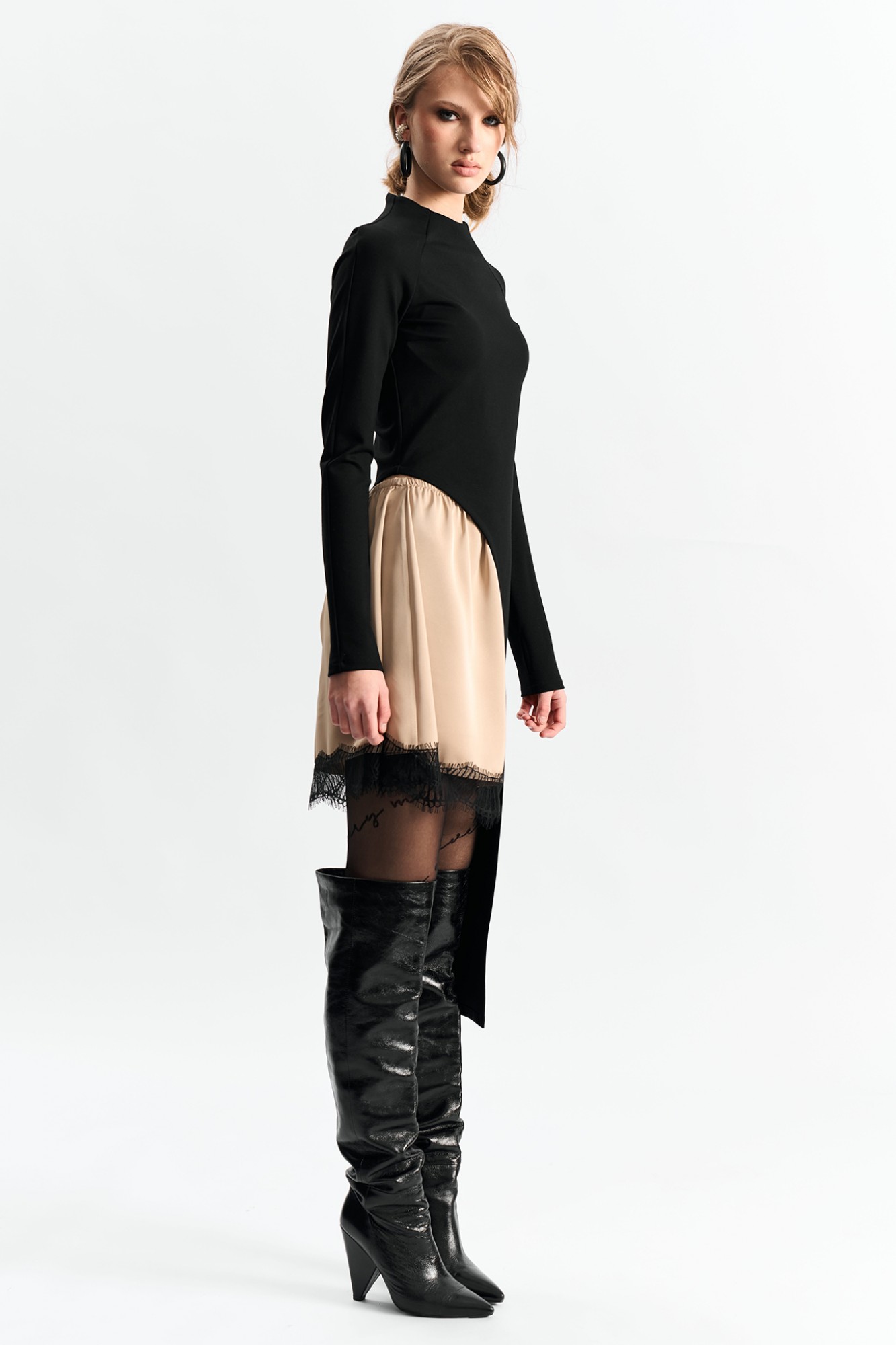 Мини-юбка А-силуэта с французским кружевом по низу. Пояс на резинке. Материал - плотный двусторонний сатин.