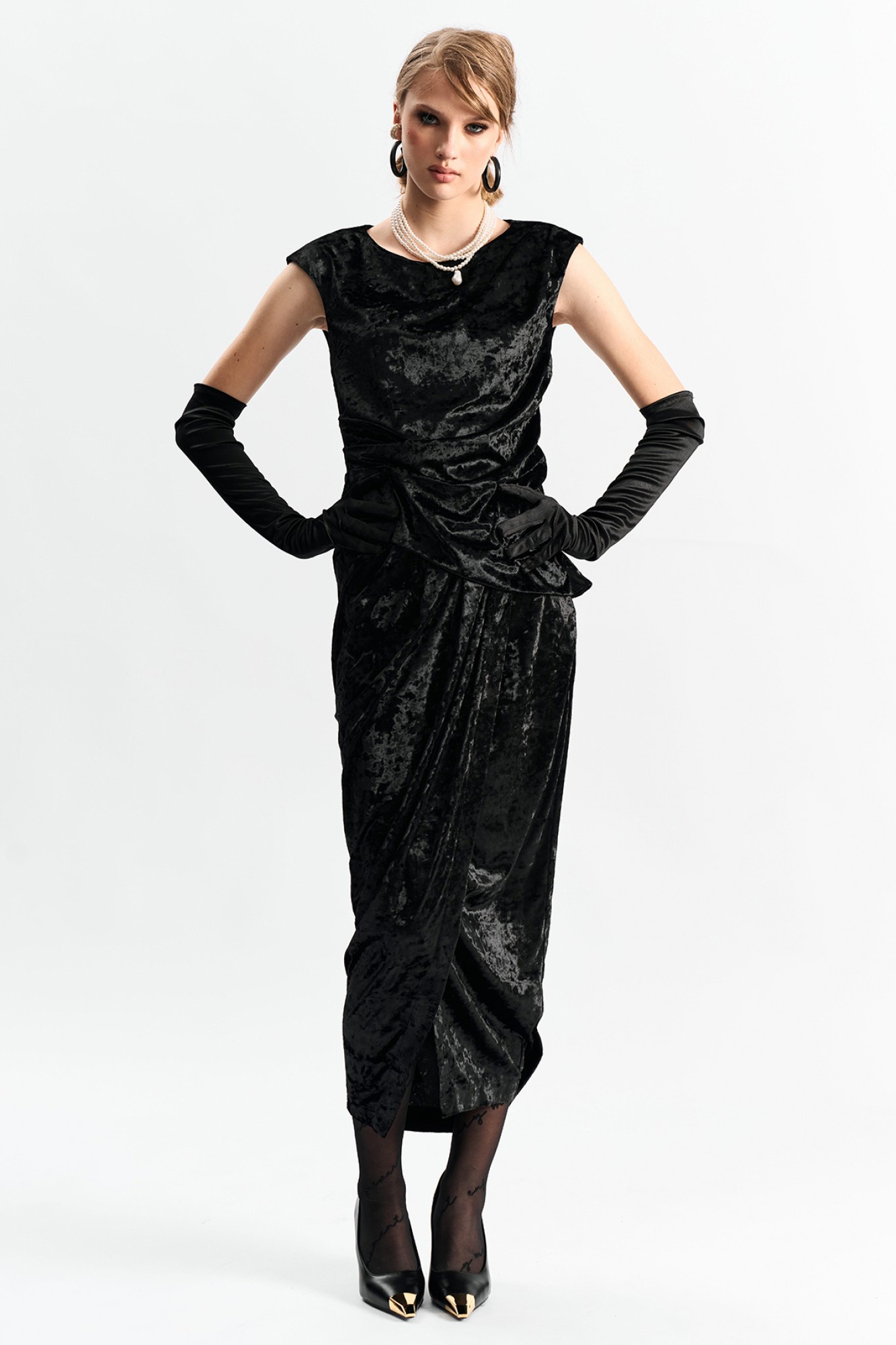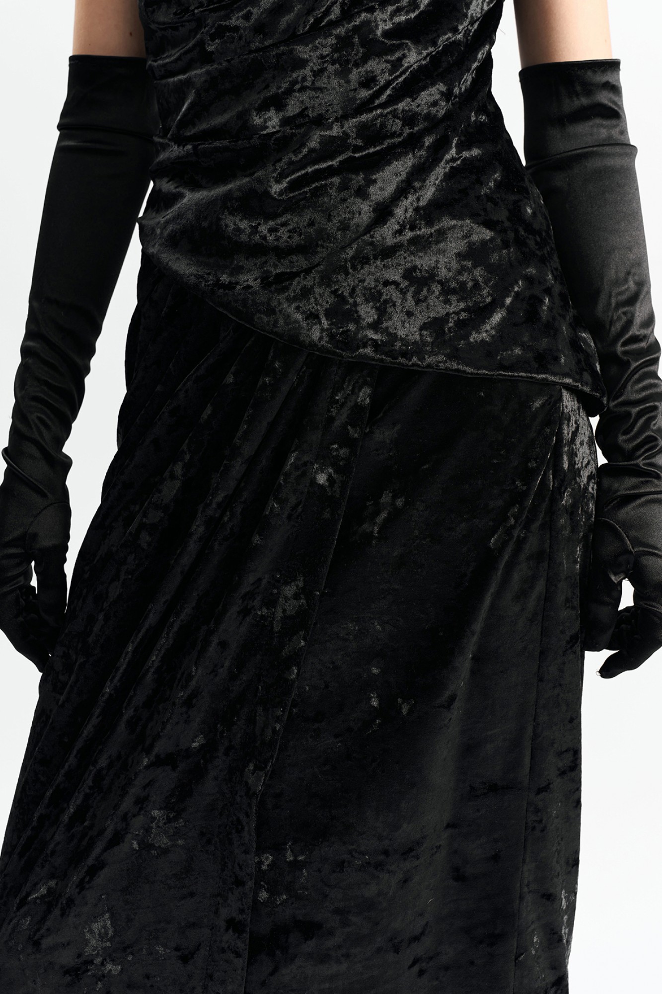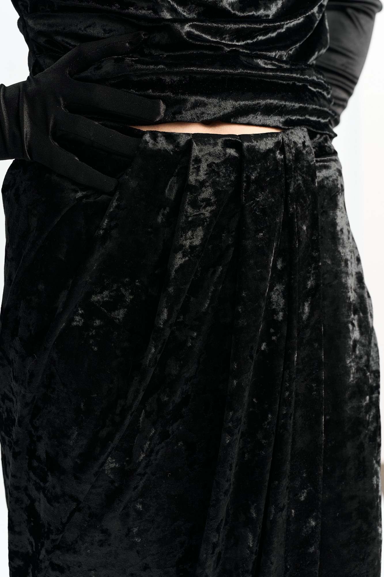 Юбка длины "миди" из фактурного бархата на запАх. По переду в поясе заложены конструктивные складки.