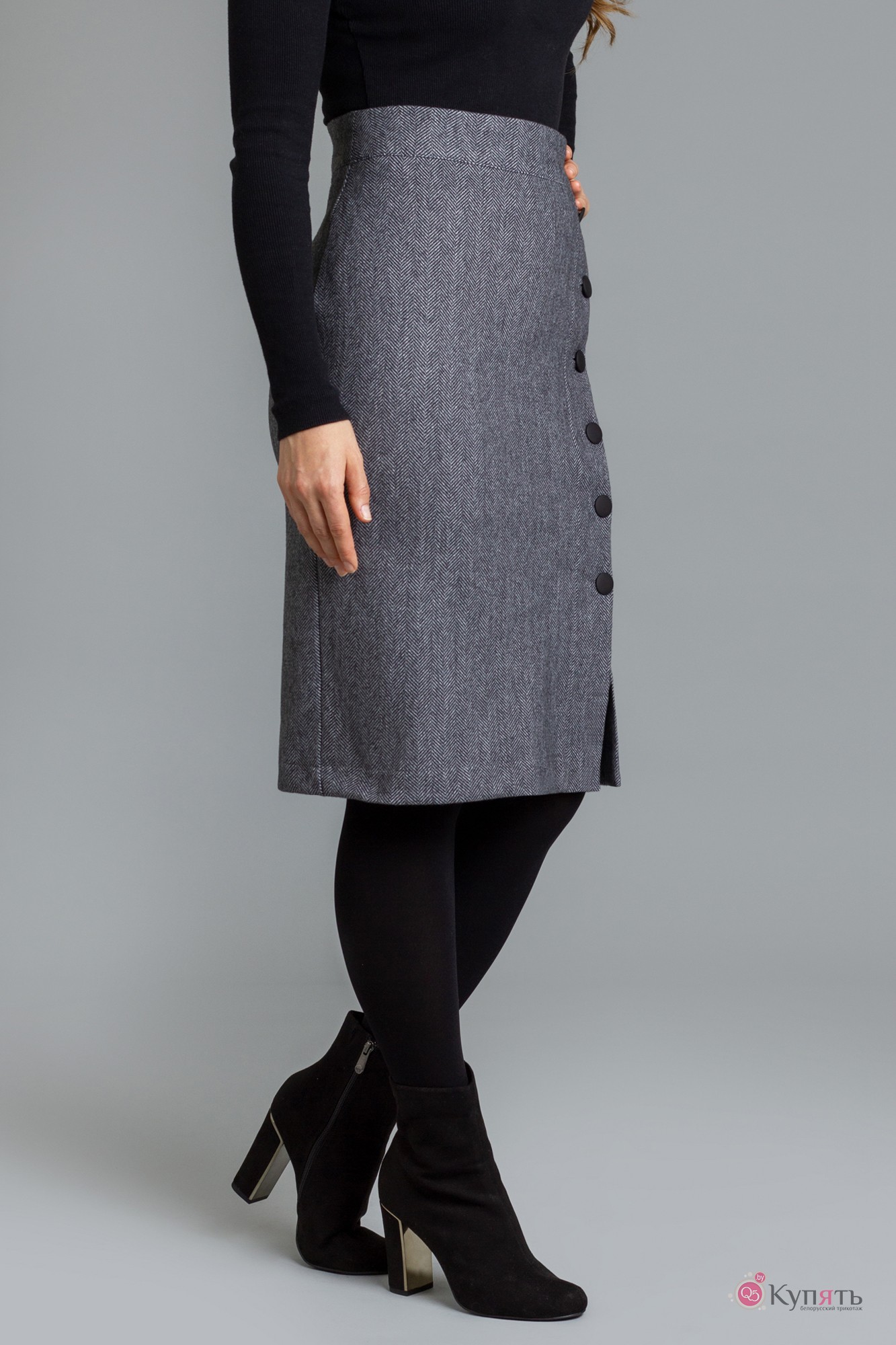 Юбка с рисунком « ёлочка» тёплая, приятная на ощупь , полуприлегающего силуэта осенне-зимнего ассортимента. Сбоку застёгивается на пуговицы. Юбка на подкладке.