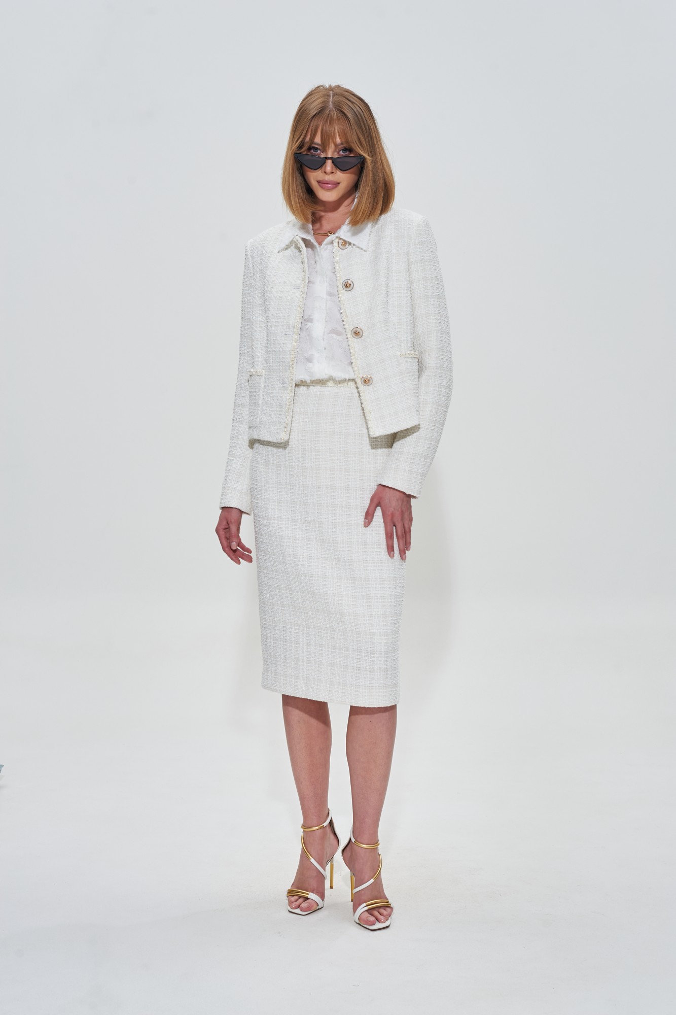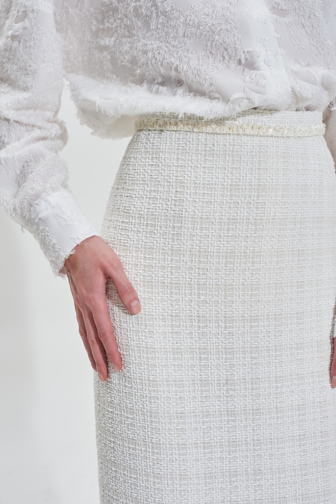 Юбка приталенного силуэта из жаккарда. Застежка на потайную молнию на спинке. Изделие декорировано тесьмой. На подкладке.