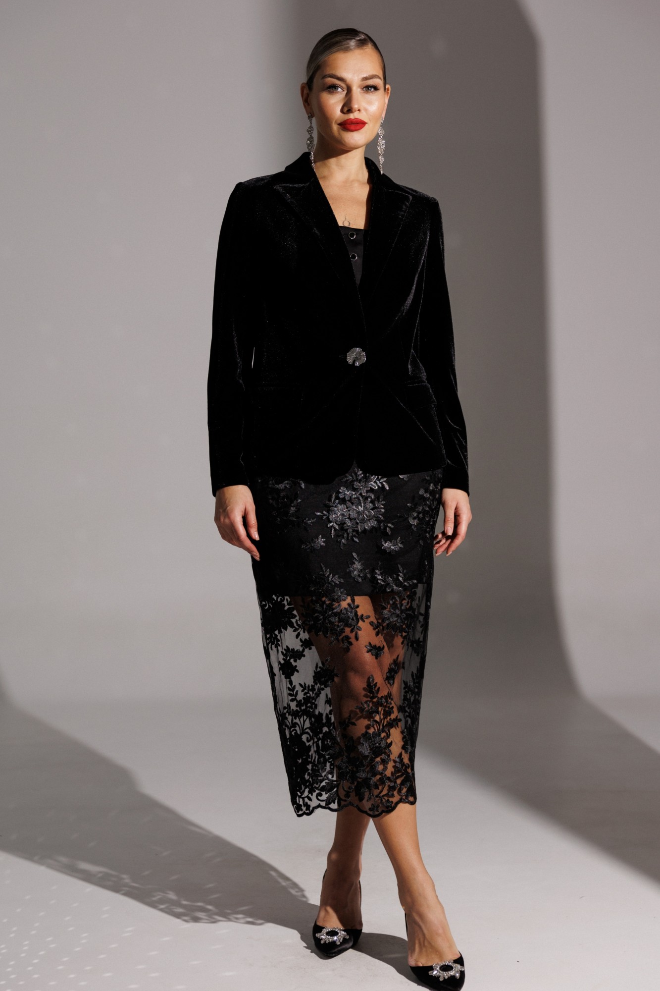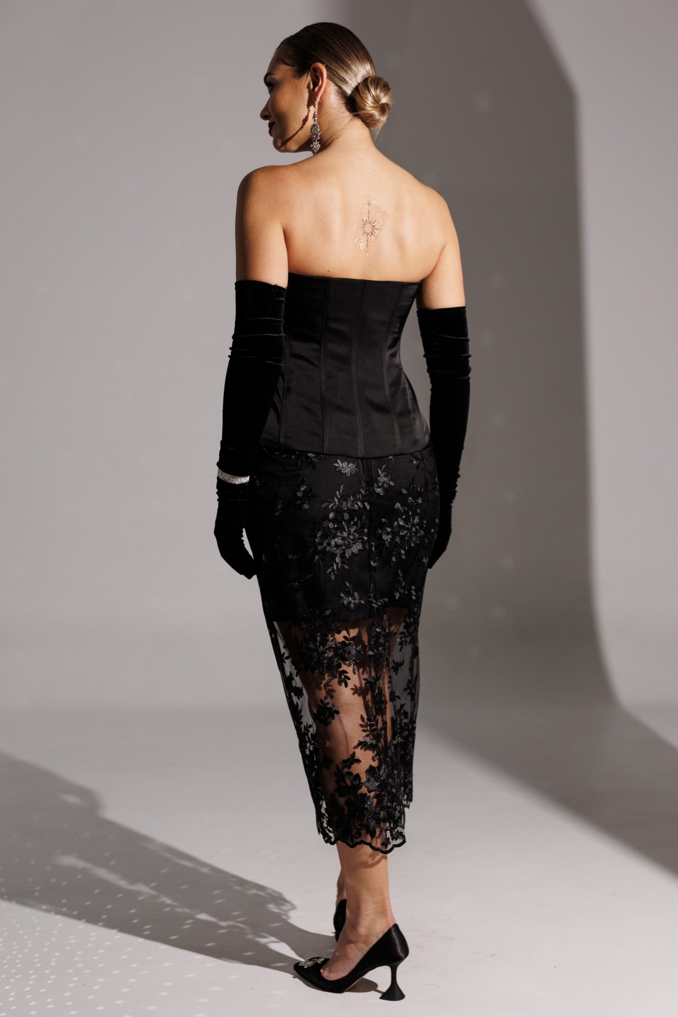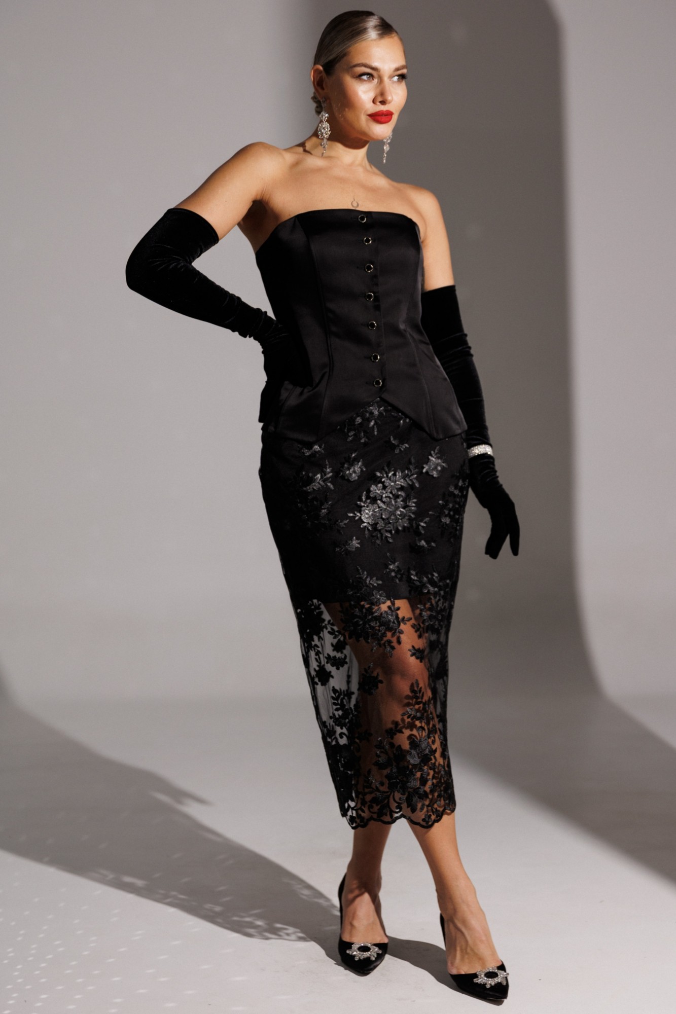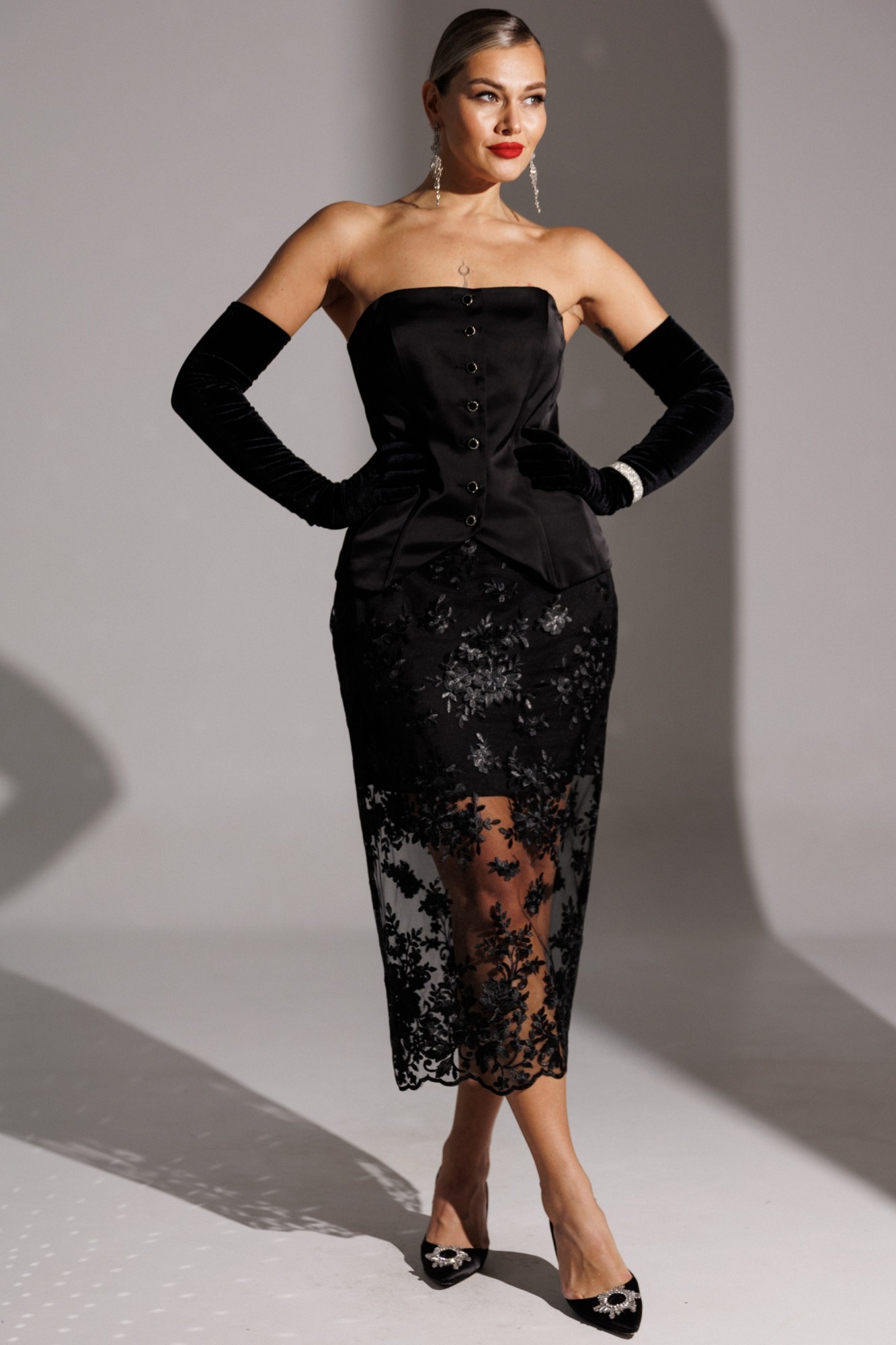 Позвольте представить изящное продолжение нашей новогодней коллекции - юбку из черного гипюра. Юбка состоит из двух слоев: верхняя часть выполнена из гипюра, заужена к низу и имеет длину миди, дополненную каймой по низу. Разрез и молния расположены сзади, обеспечивая легкость в носке и стильный вид. Нижняя юбка служит подкладкой и выполнена в мини-длине, что создает эффектный контраст с верхним слоем. Соберите идеальный ансамбль, дополнив юбку корсетом и бархатным жакетом. Вместе они создают законченный образ, одновременно смелый и невероятно женственный.
