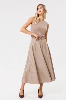Юбка женская из эко-кожи. Изнаночная сторона эко-кожи: вискозная. Юбка состоит из восьми клиньев. По центру переда расположен гульфик с застежкой. В боковых швах карманы с листочкой. Верх юбки обработан поясом со шлевками.