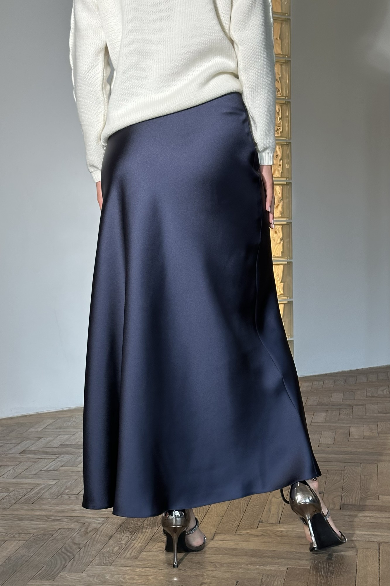 Элегантная женская юбка, А-силуэта длины миди. Посадка высокая, без пояса. Струящаяся блестящая текстура никогда не оставит равнодушной любую женщину.