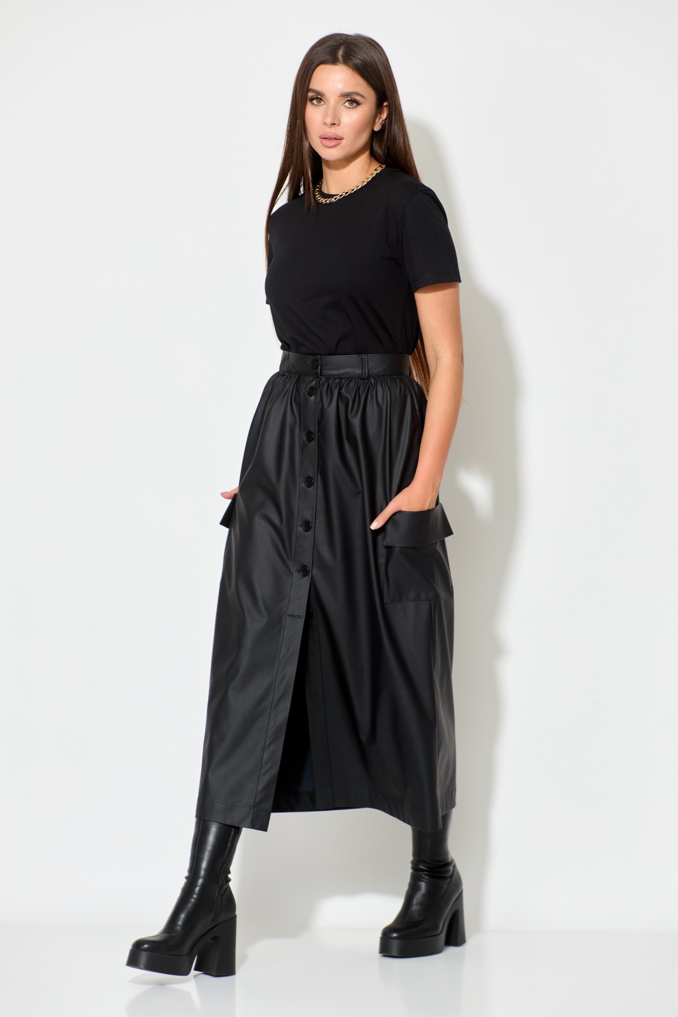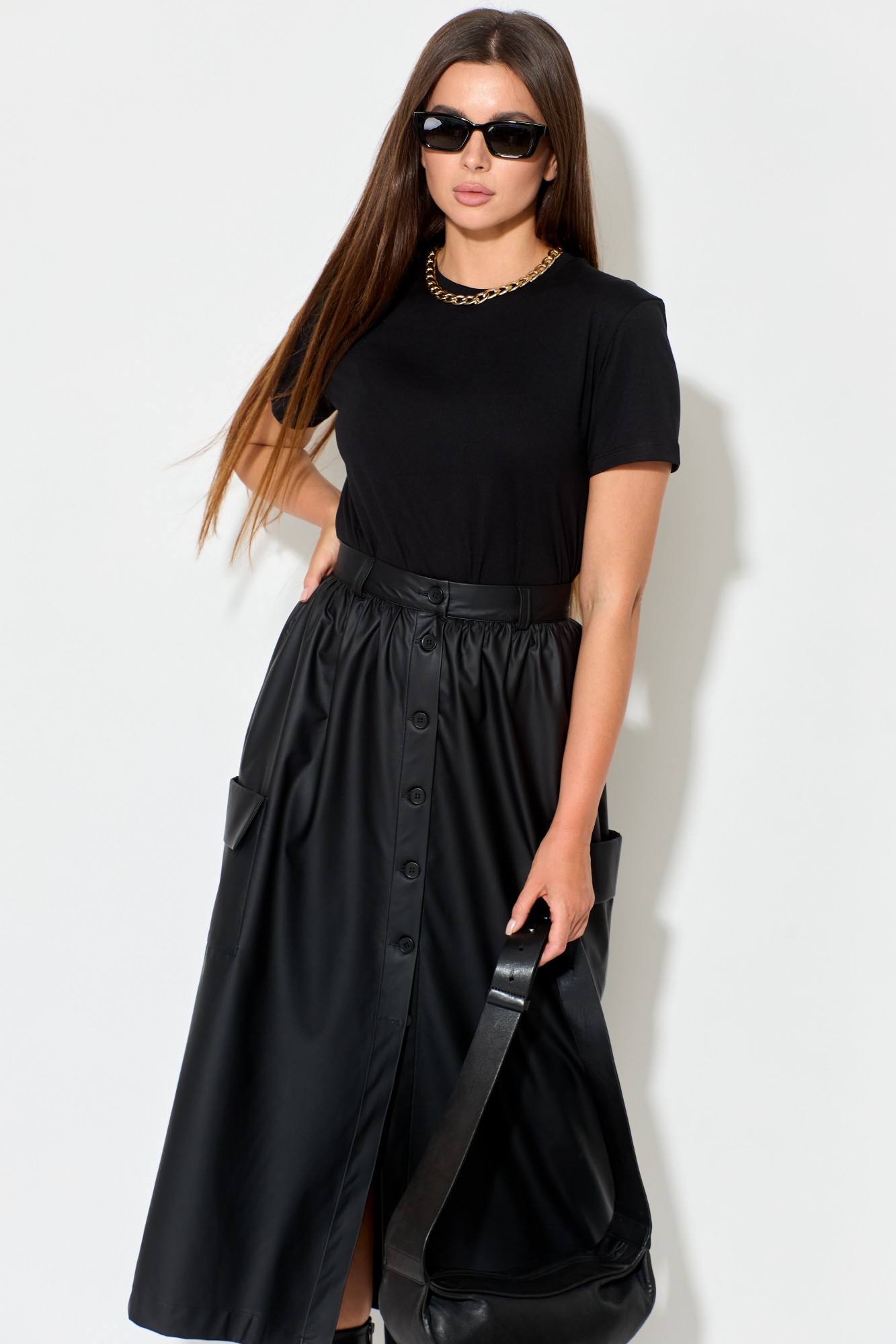 Модная юбка миди из матовой эко-кожи. Юбка на поясе со сборкой, спереди с застежкой на пуговицах. Пояс стабильный с настроченными шлевками. Карманы в боковых швах юбки, также на боковых швах есть накладные карманы с клапаном. Изделие идеально подходит в офис, на работу, для прогулок и любого празднования - позволяет создавать привлекательные луки в каждом отдельном случае. Юбка миди прекрасно вписывается в любой из стилей одежды на осенне-зимний сезон.