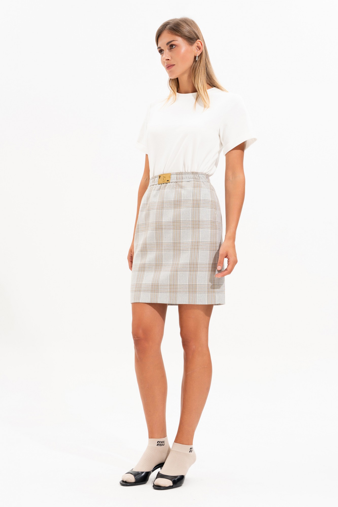 Юбка длины мини на подкладке, прямого силуэта, универсальная и удобная посадка, застежка молния в боковом шве. Карманы боковые наклонные. Пояс юбки на резинке, что дает комфорт в повседневном использовании. На поясе декор в виде бирки с лого. Трендовая юбка из клетки - это сочетание современных модных акцентов и функциональности, идеально вписывается как в деловые, так и в повседневные образы.