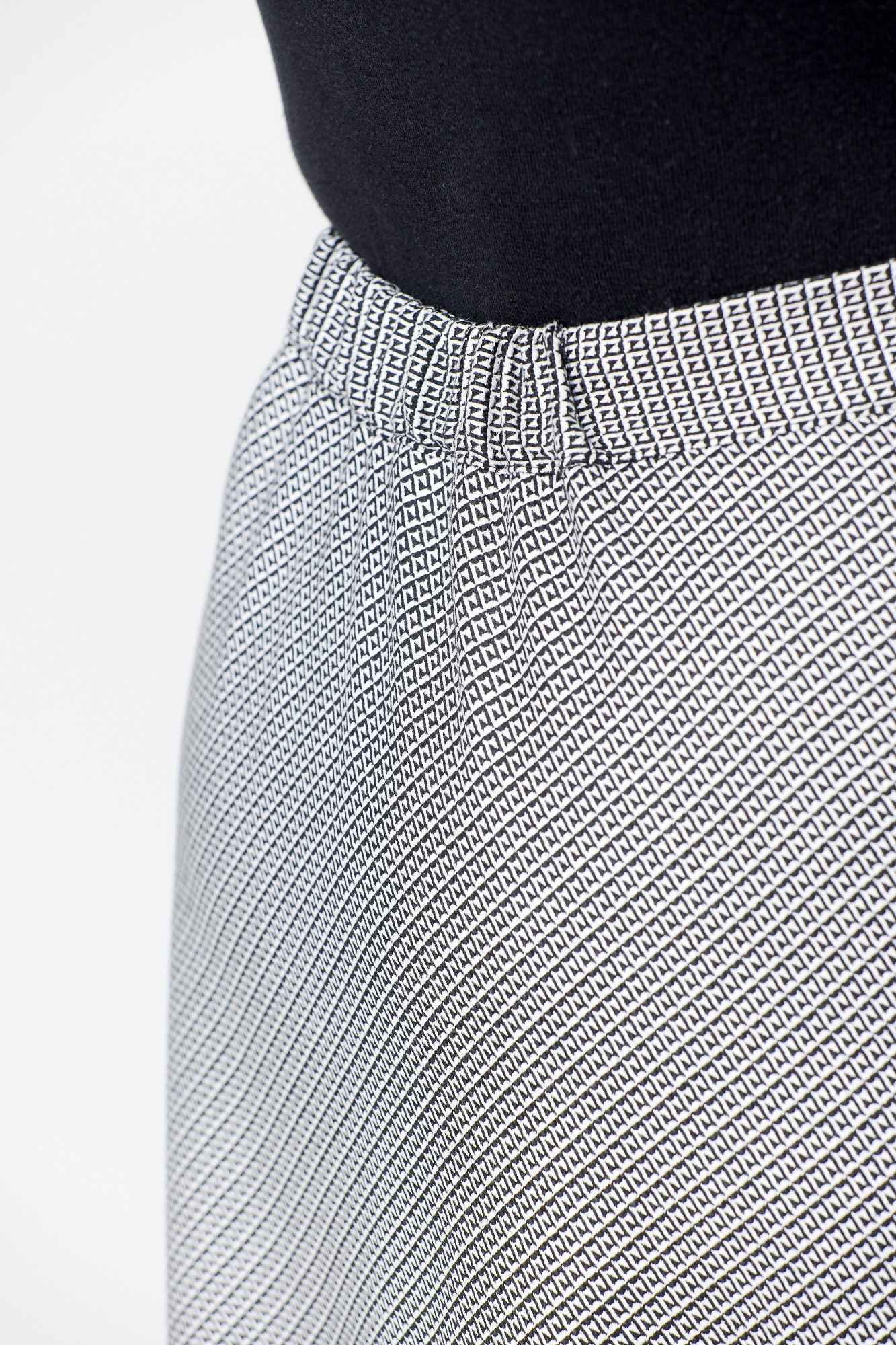 Юбка А-силуэта, длиной “миди”. Юбка выполнена из поливискозной ткани на эластичной подкладке. Перед и спинка юбки цельнокроеные. В боковой шов вставлена потайная молния. Верх юбки обработан притачным поясом, который застёгивается на пробивную петлю и декоративную пуговицу. По центру задней части пояса вставлена эластичная тесьма.