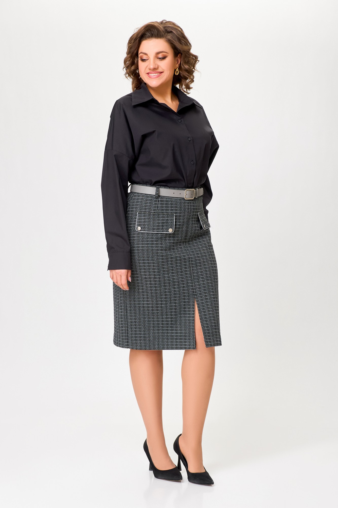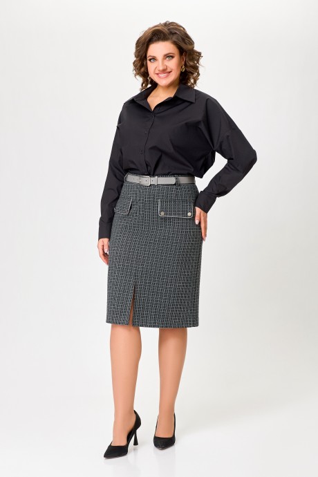 Юбка полуприлегающего силуэта на подкладке из мягкой трикотажной ткани. Переднее полотнище с таллиевыми выточками и центральным швом с разрезом. В области бёдер расположены клапаны с контрастным атласным кантом и декоративными пуговицами. Заднее полотнище с таллиевыми выточками и центральным швом с потайной застёжкой-молнией. Верх юбки обработан притачным поясом шириной 4 см, со шлёвками для ремня. В комплекте ремень с декоративной пряжкой.