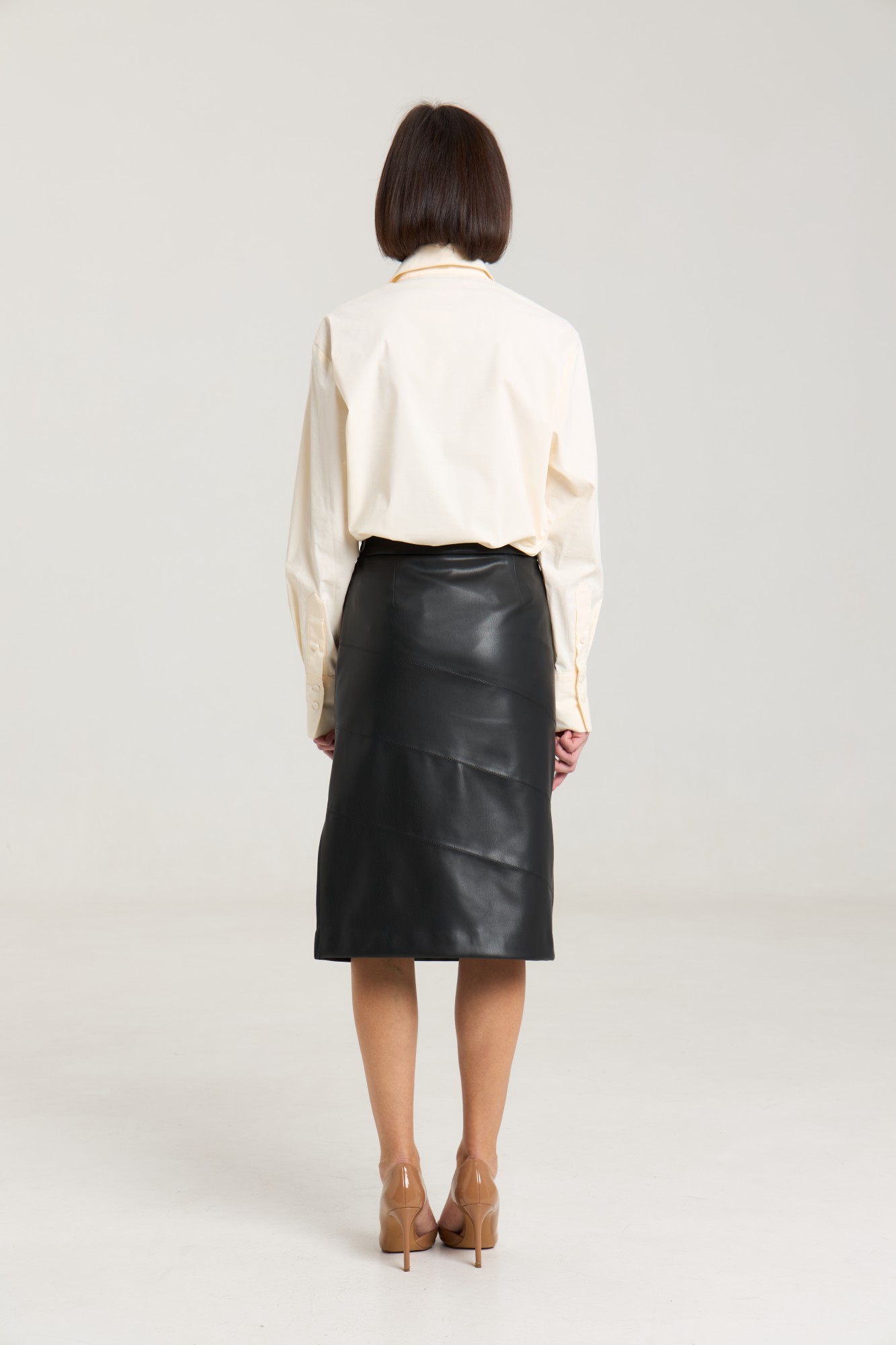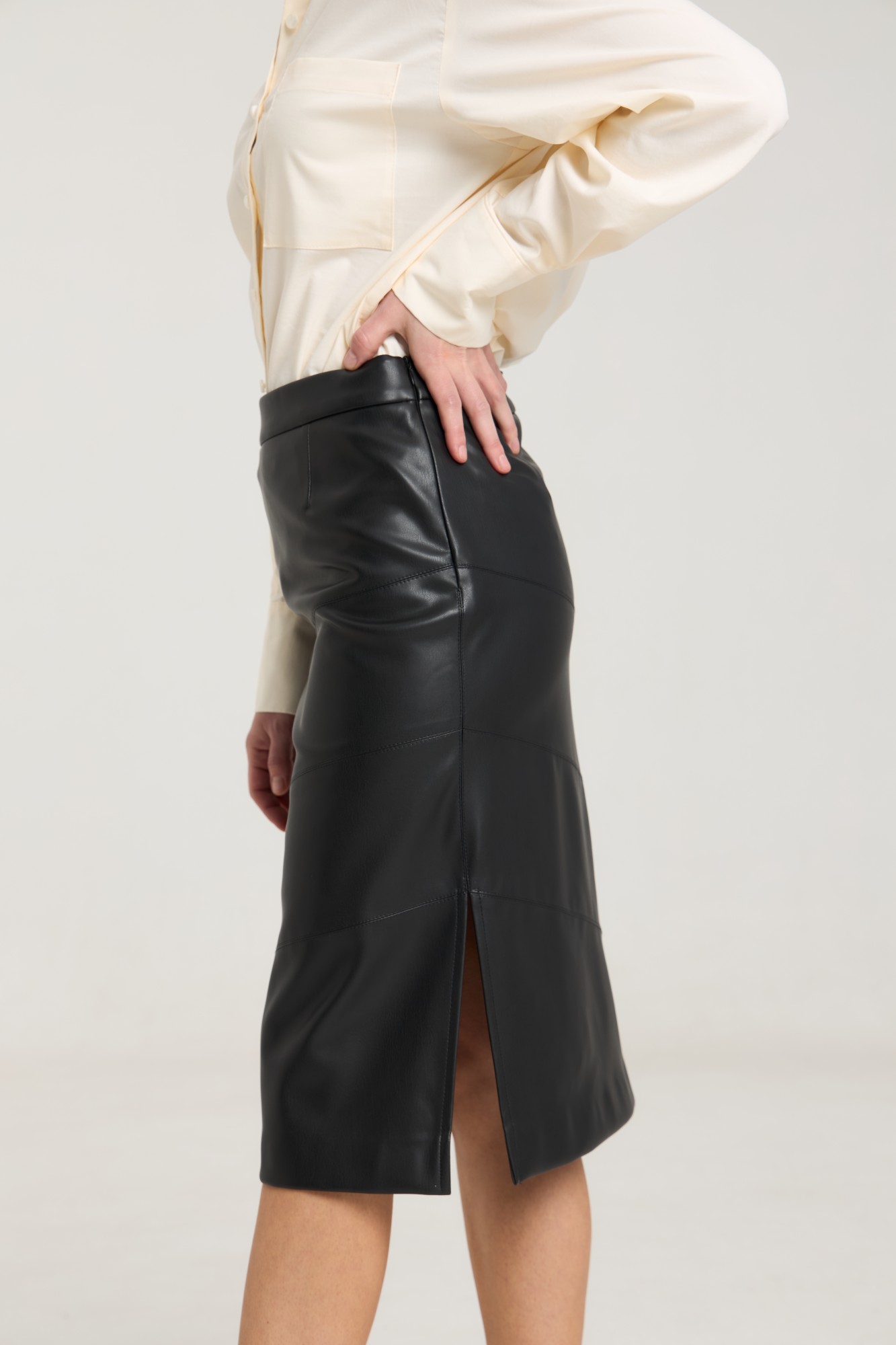Юбка в длине миди выполнена из мягкой экокожи черного цвета, юбка на подкладке, сбоку разрез. В боковом шве застежка на потайную молнию. Юбка прилегающего силуэта на притачном поясе, резаная по косой, за счет кроя выглядит стильно и необычно. Можно сочетать с футболками, топами, свитерами, блузами.