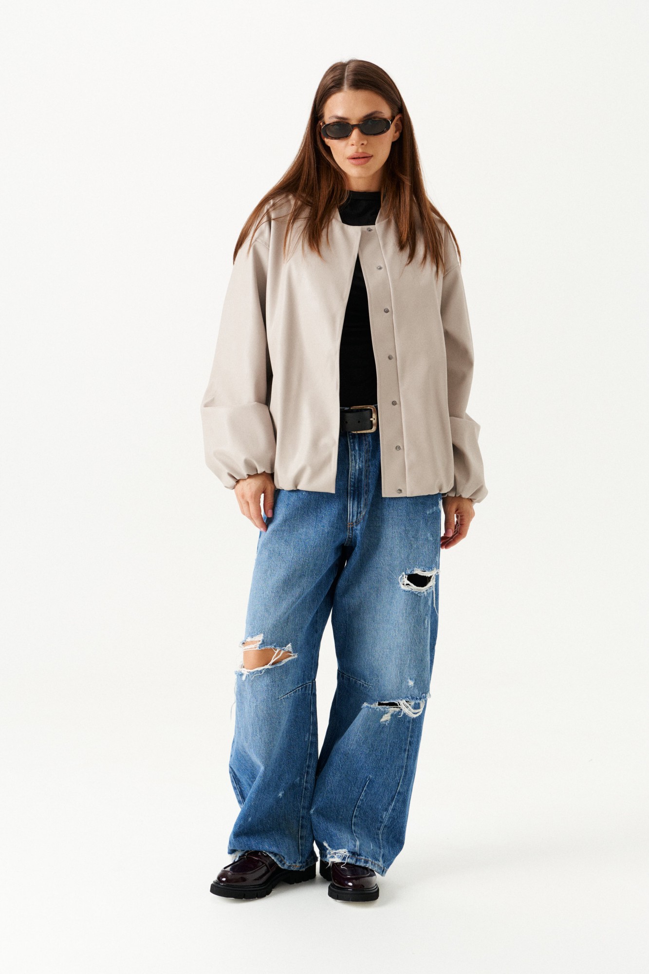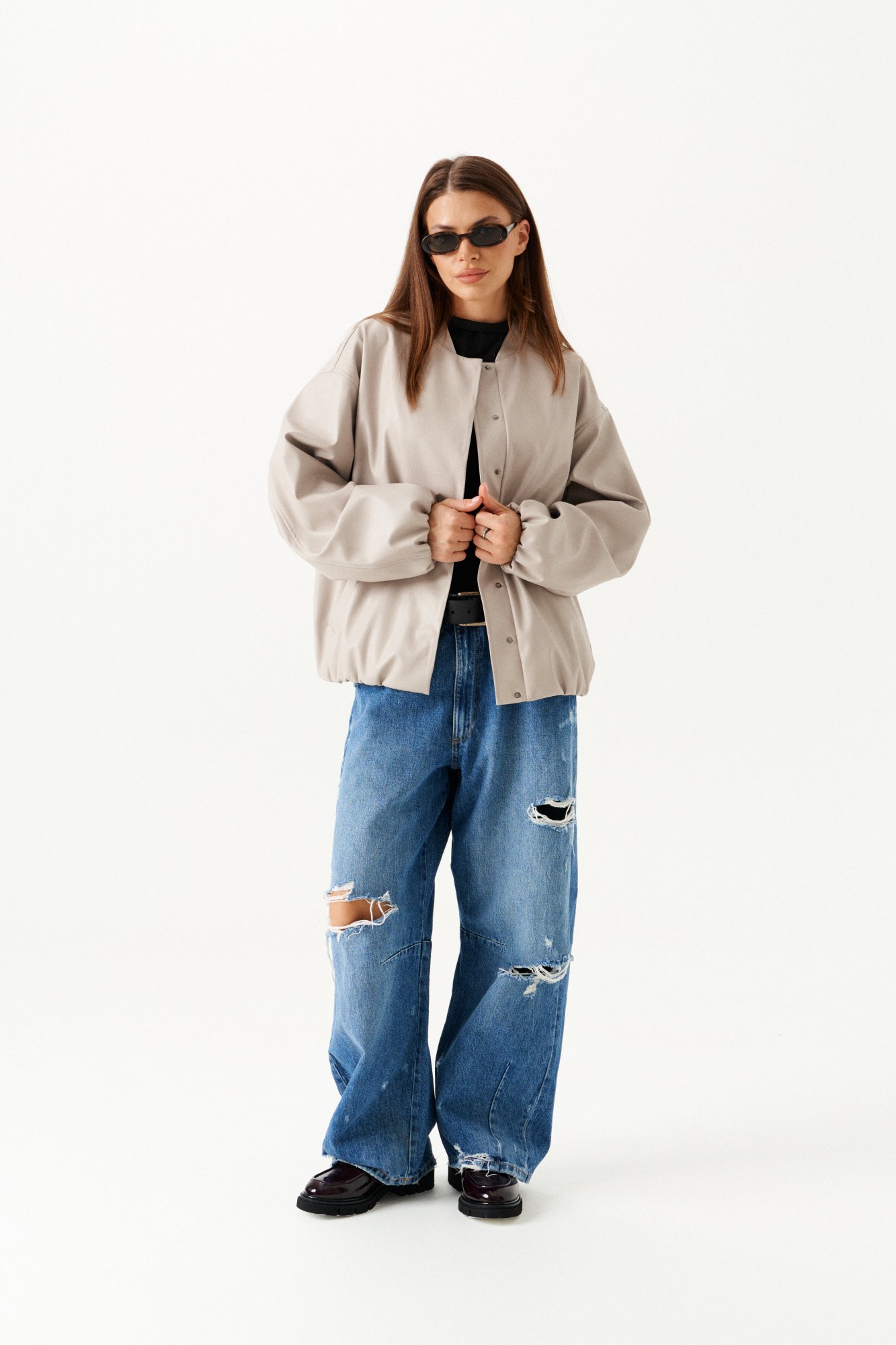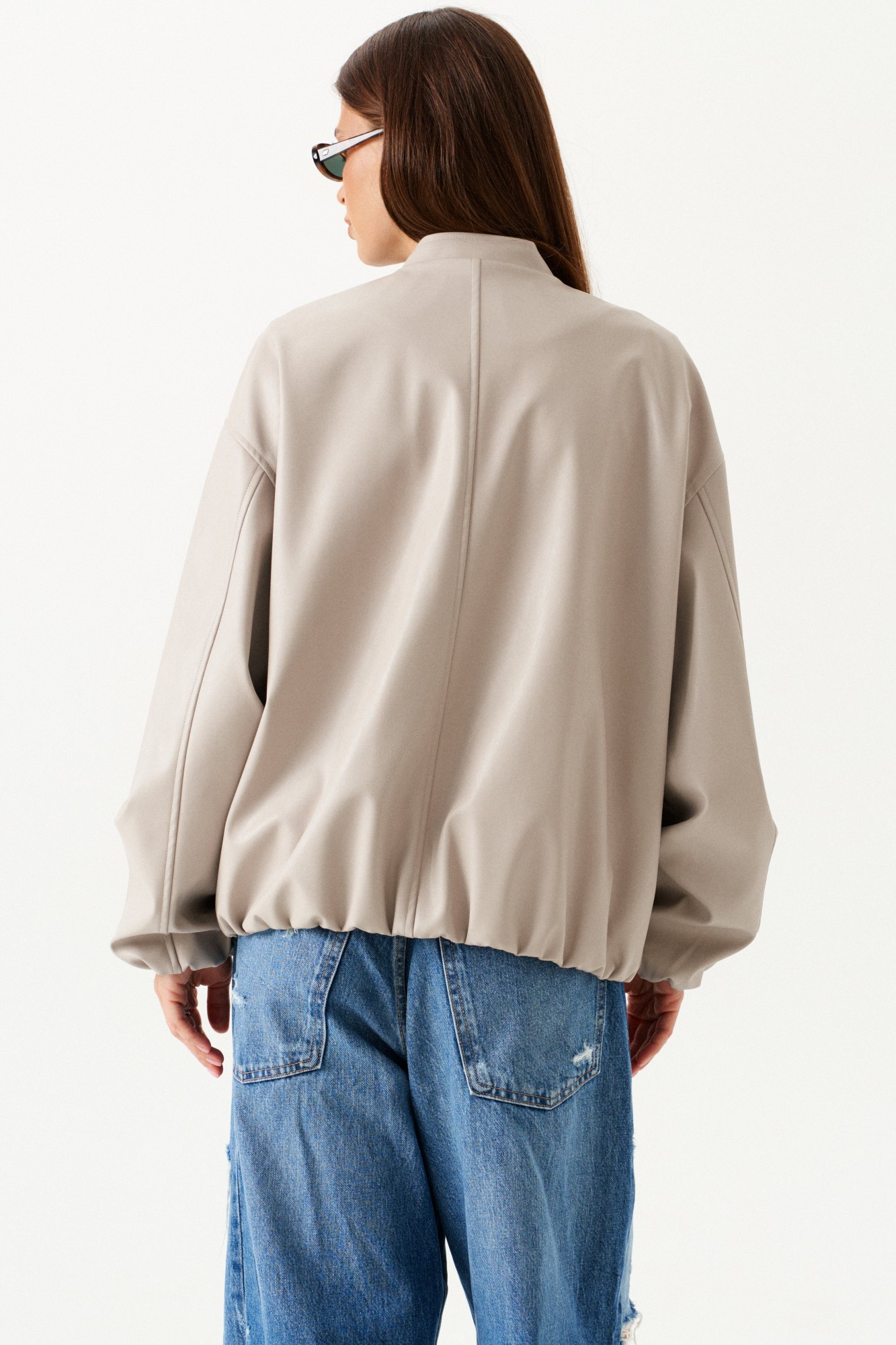 Бомбер из искусственной кожи, свободный, со спущенной линией плеча, с центральной застежкой на потайные кнопки, на подкладке. Горловина округлой формы с воротником-стойкой. Детали переда с прорезными карманами с листочкой. Спинка со средним швом. Рукав втачной, двухшовный.