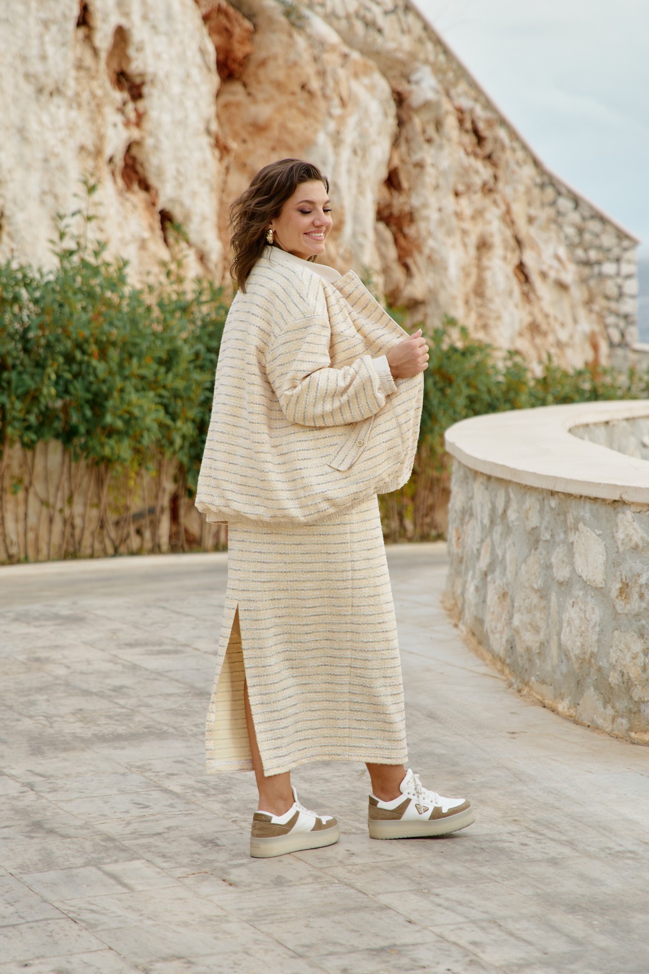 полотно трикотажное - 84% полиэстер, 6% акрил, 5% шерсть, 4% хлопок, 1% эластан, подкладка 100% полиэстер. Бомбер- это идеальный переходный элемент. Это выбор для тех, кто ценит комфорт и современные силуэты. Светлый оттенок мгновенно освежает любой базовый образ (с джинсами, брюками, платьем) дополняя и добавляя ему стильности. Бомбер «оверсайз» силуэта с центральной застёжкой на петли пуговицы по краю борта, горловина округлой формы с воротником-стойкой из отделочной ткани. По переду бомбера фигурный рельеф с декоративным отделочным кантом из отделочной ткани, функциональными карманами с клапаном. Спинка без особенностей. Линия плеча спущенная, рукав втачной, длинный со сборкой на притачной манжет из отделочной ткани. Для удобного прилегания манжета к руке вставка резинки. По низу бомбера притачной пояс на резинке из отделочной ткани. Бомбер на подкладке. Длина бомбера 71 см, длина рукава 72,5 см (р 50-54), 73,5 см (р 56-60).