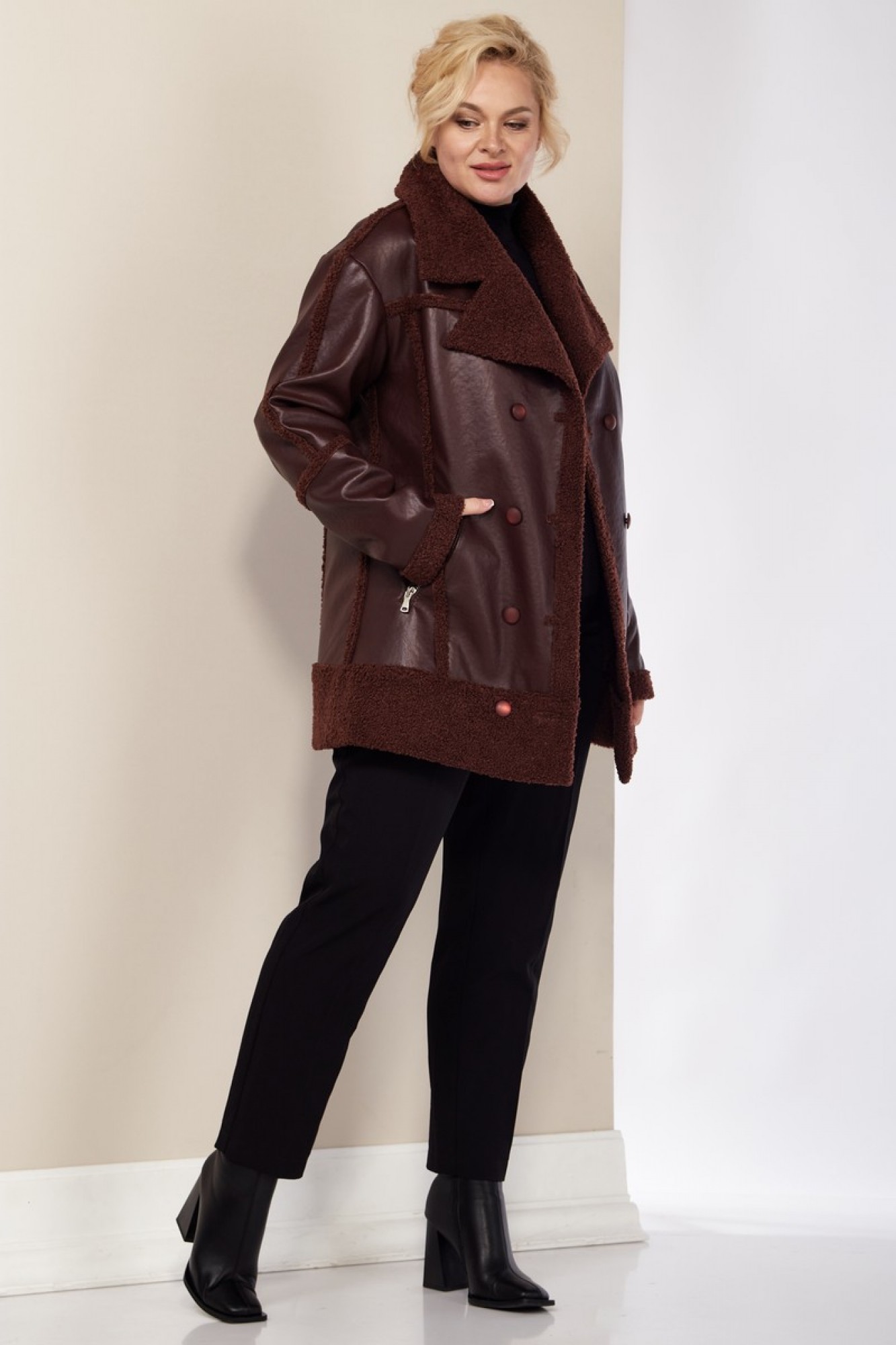 Полочка и спинка разрезные с кокеткой. Полочка с рельефами и внутренними функциональными карманами на молнии. Застежка центральная двубортная на петли и пуговицы. Воротник отложной. Рукав втачной разрезной со спущеным плечом. В модели есть прибавка на верхнюю одежду.