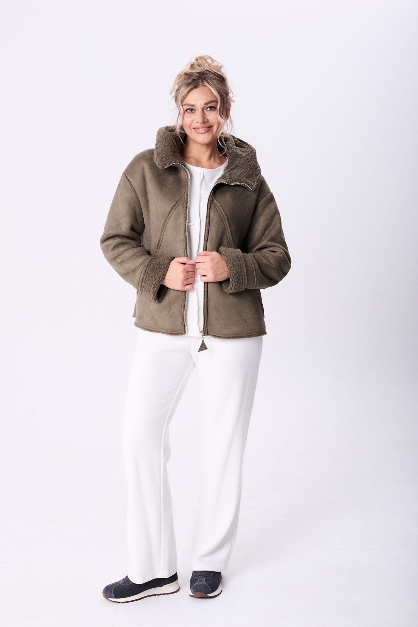 Дубленка женская полуприлегающего силуэта с центральной застежкой на тесьму-молнию. По спинке средний шов, вытачки по горловине. По переду накладные карманы фигурной формы. Рукав втачной 2-шовный с притачным манжетам, спущенная линия плеча. Капюшон с центральной частью и откидной отделочной деталью по отлету. В качестве отделки используется фурнитура.