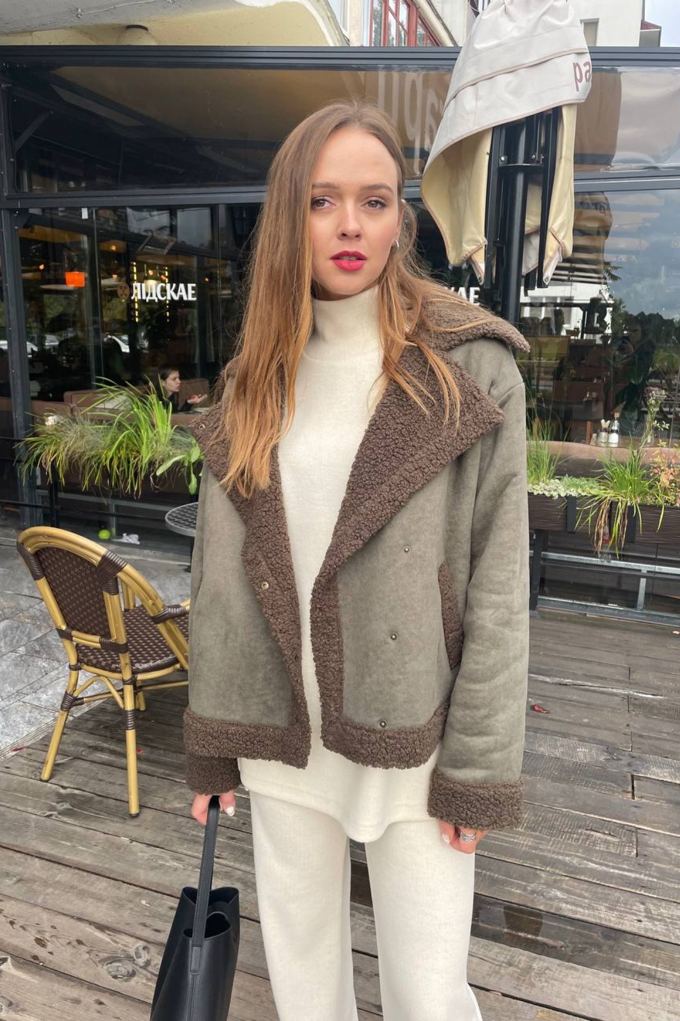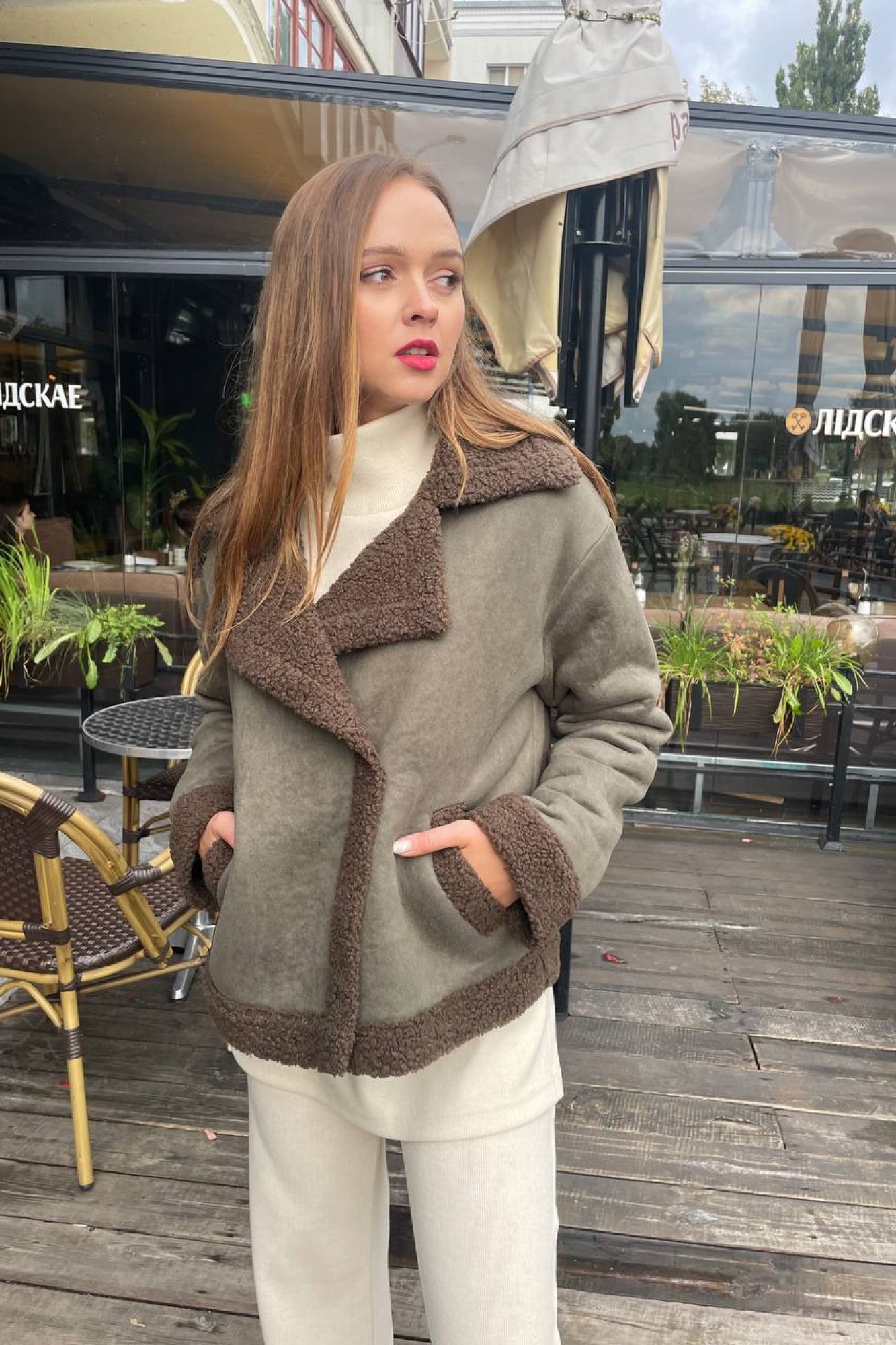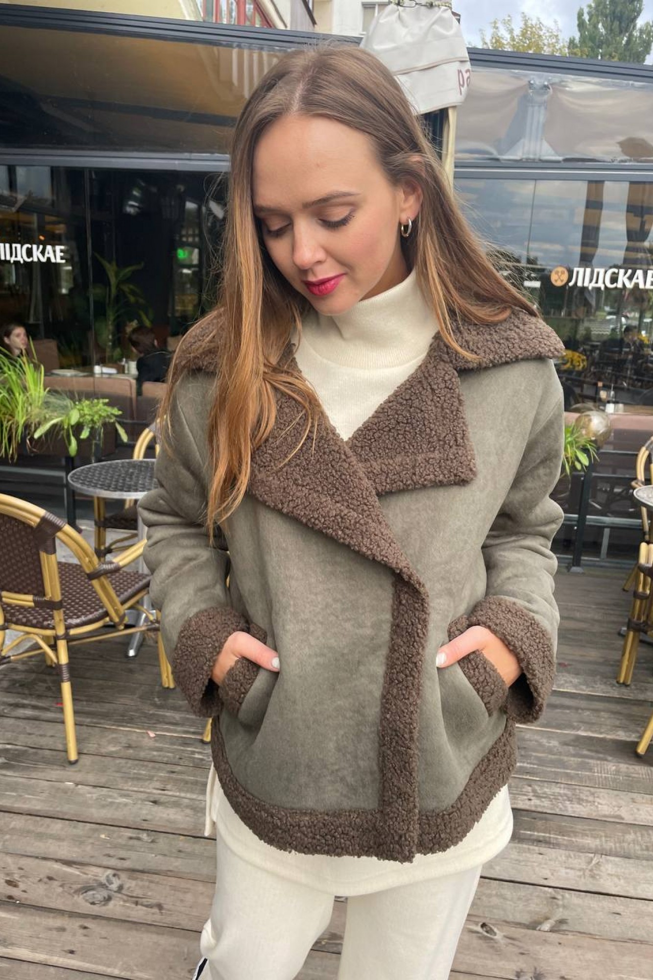 Куртка выполнена из материала под замшу, с внутренней отделкой из искусственного меха. Прямой крой, застежка на кнопку изнутри, боковые карманы. Куртка с хорошей прибавкой.