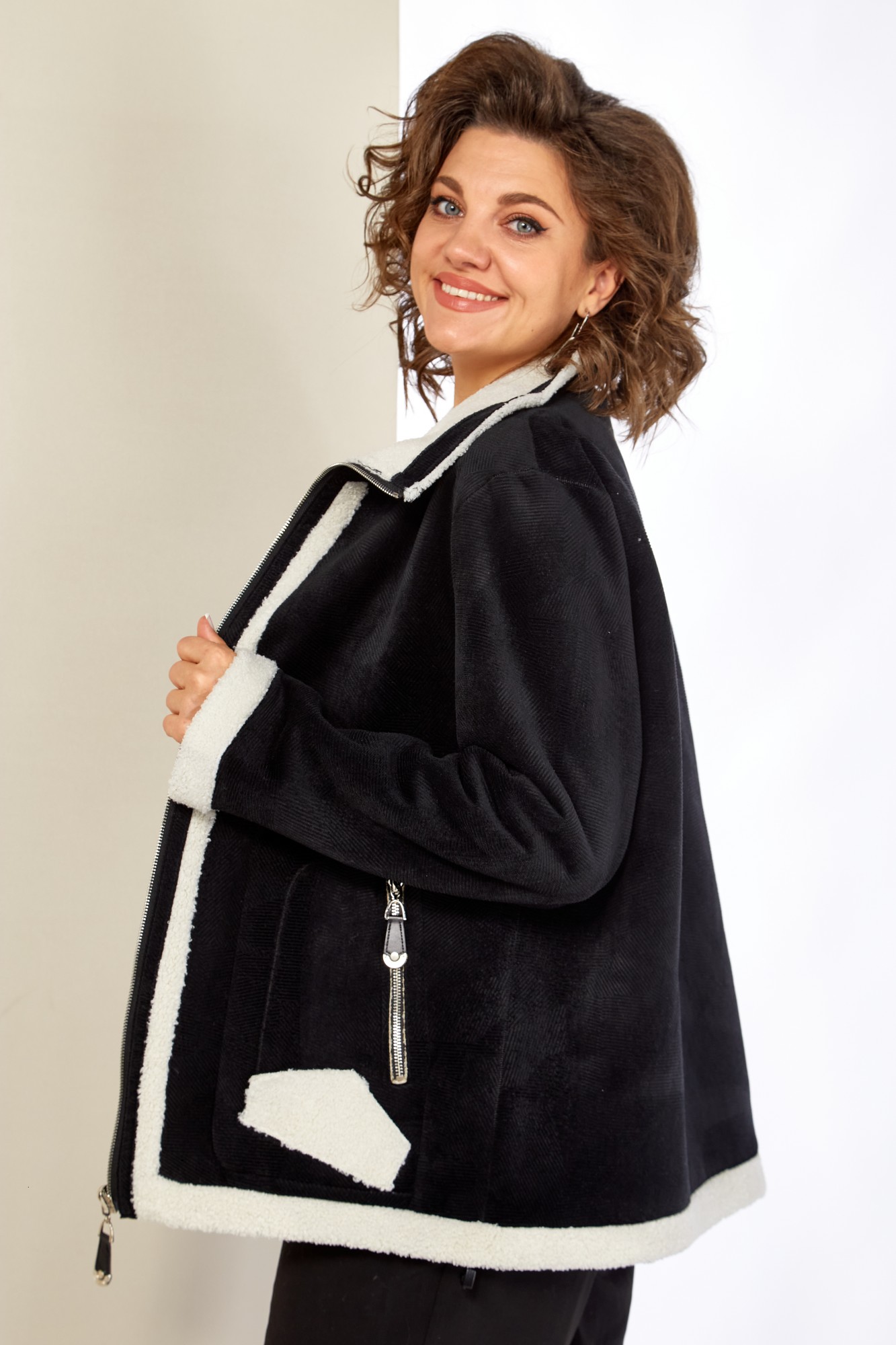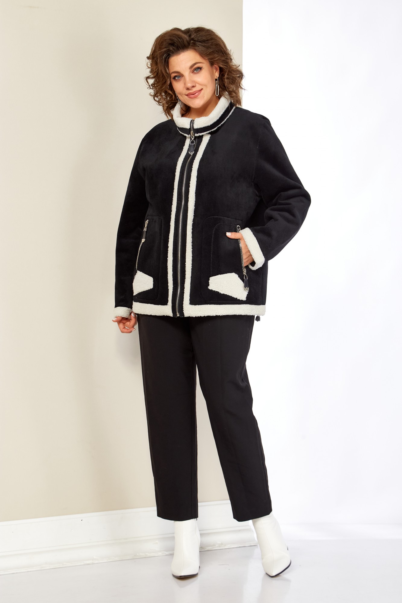 Представляем стильный жакет с воротником-стойкой, классического кроя с декоративными элементами в виде отделки из эко-меха. Жакет выполнен из качественных материалов, включая плотный, мягкий трикотаж в рубчик и эко-мех. Застежка центральная на молнию с двойным бегунком. По переду жакета функциональные накладные, прорезные карманы на молнии с оригинальной кожаной подвеской в тон основной ткани. По низу рукавов и низа изделия отделка с эко-меха, что придает изделию оригинальный вид. Рукав втачной.