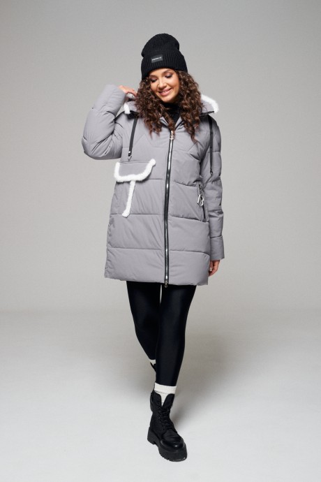 Капюшон притачной по линии горловины с декоративной отделкой по краю в виде искусственной меховой тесьмы.