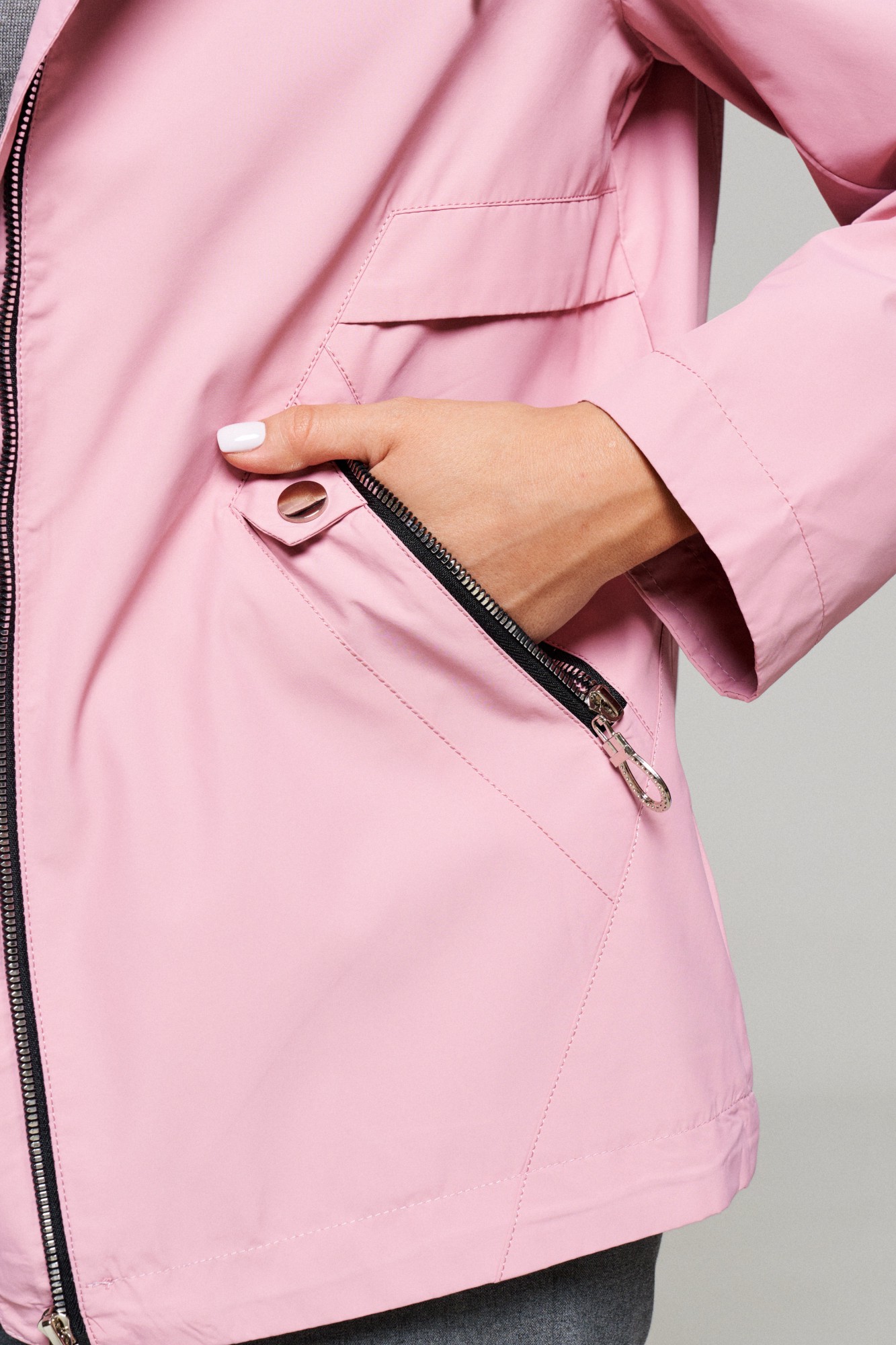 Передняя часть изделия с двумя симметричными подрезными деталями в боковой части, в которых расположены прорезные декоративные карманы с застёжкой на молнию контрастного цвета.