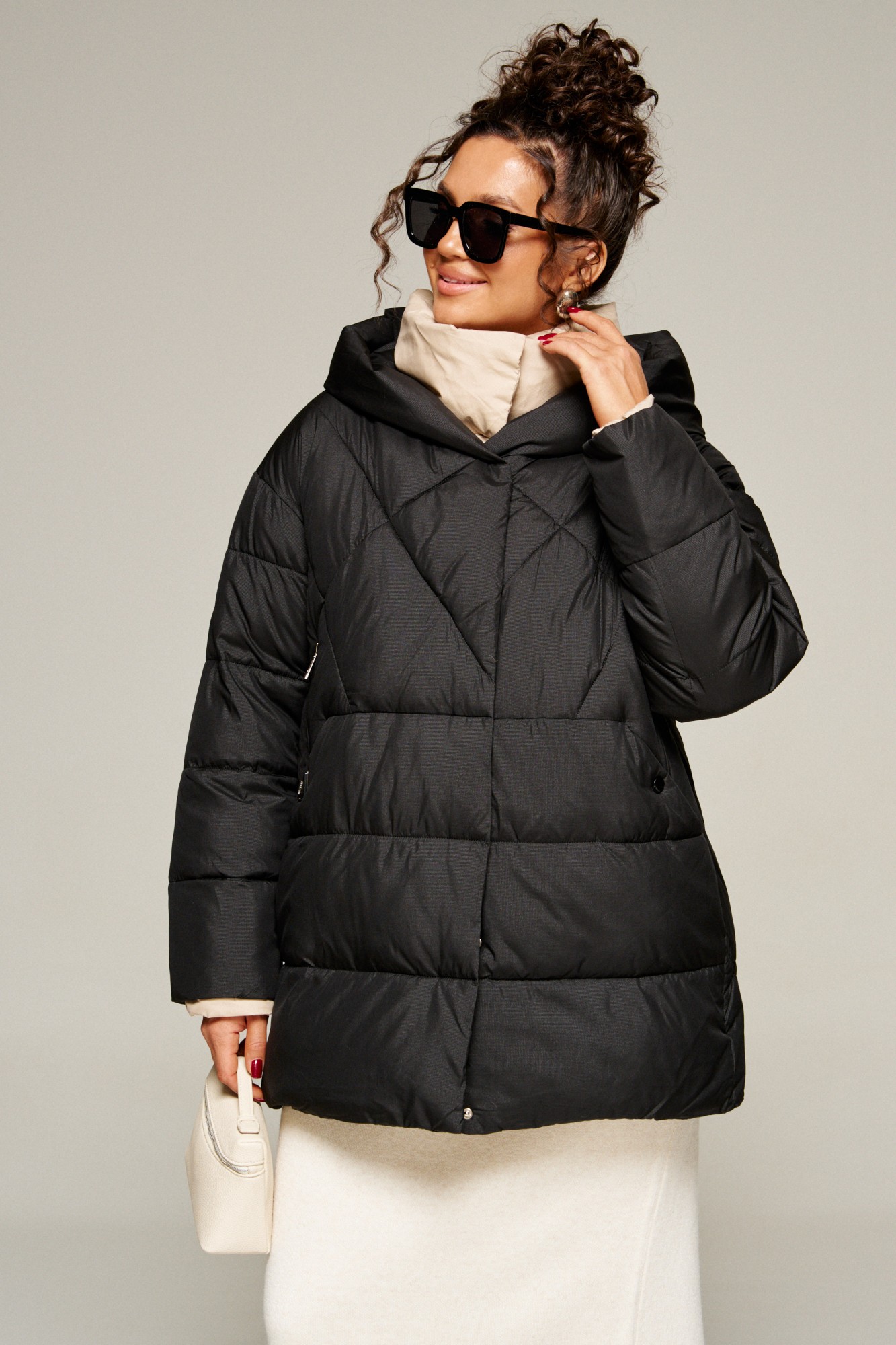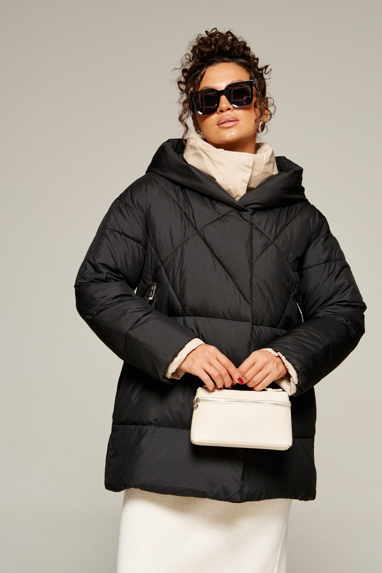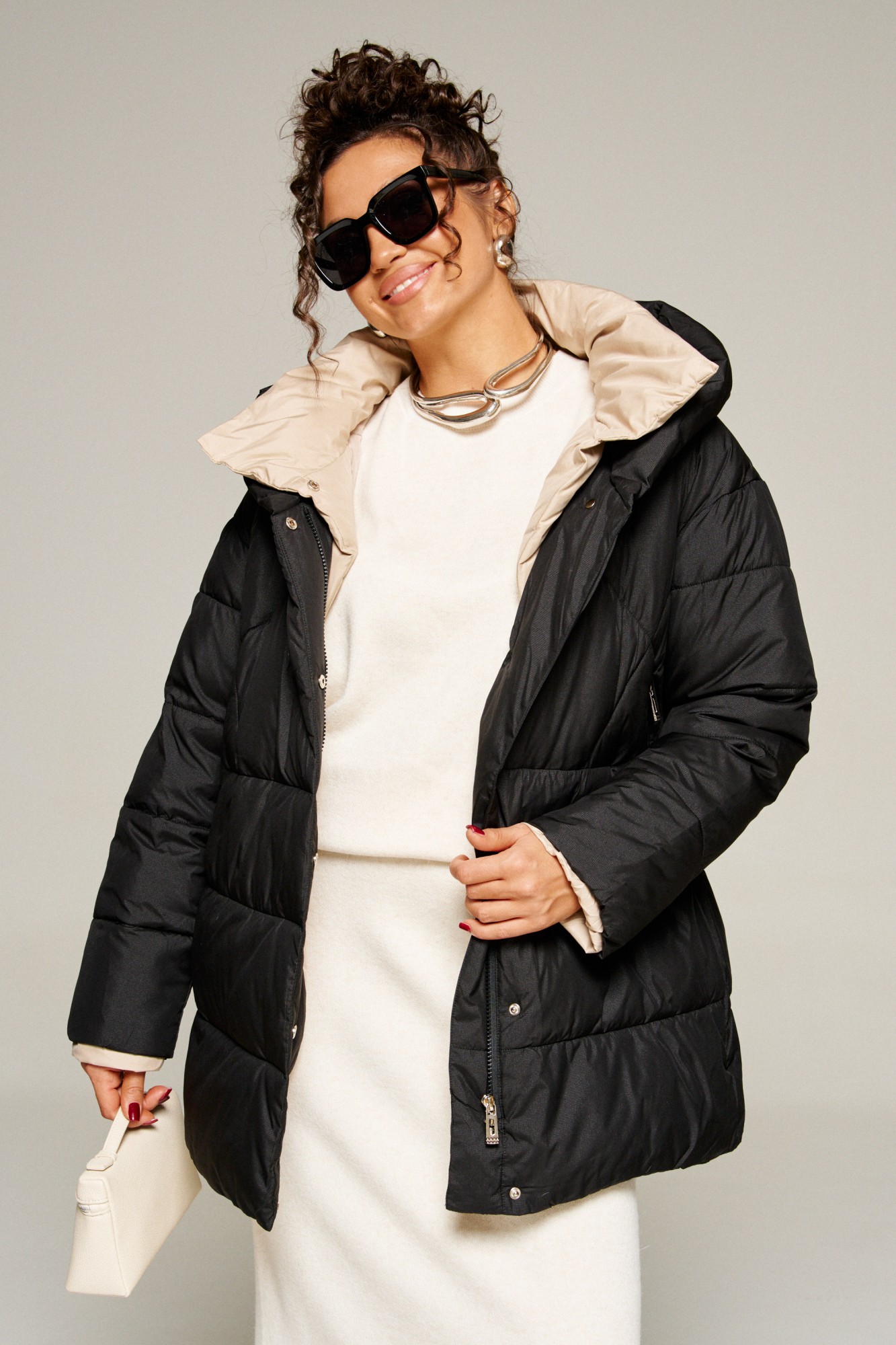 Застежка центральная на двустороннюю молнию от уровня груди до низа и кнопки по краю борта.