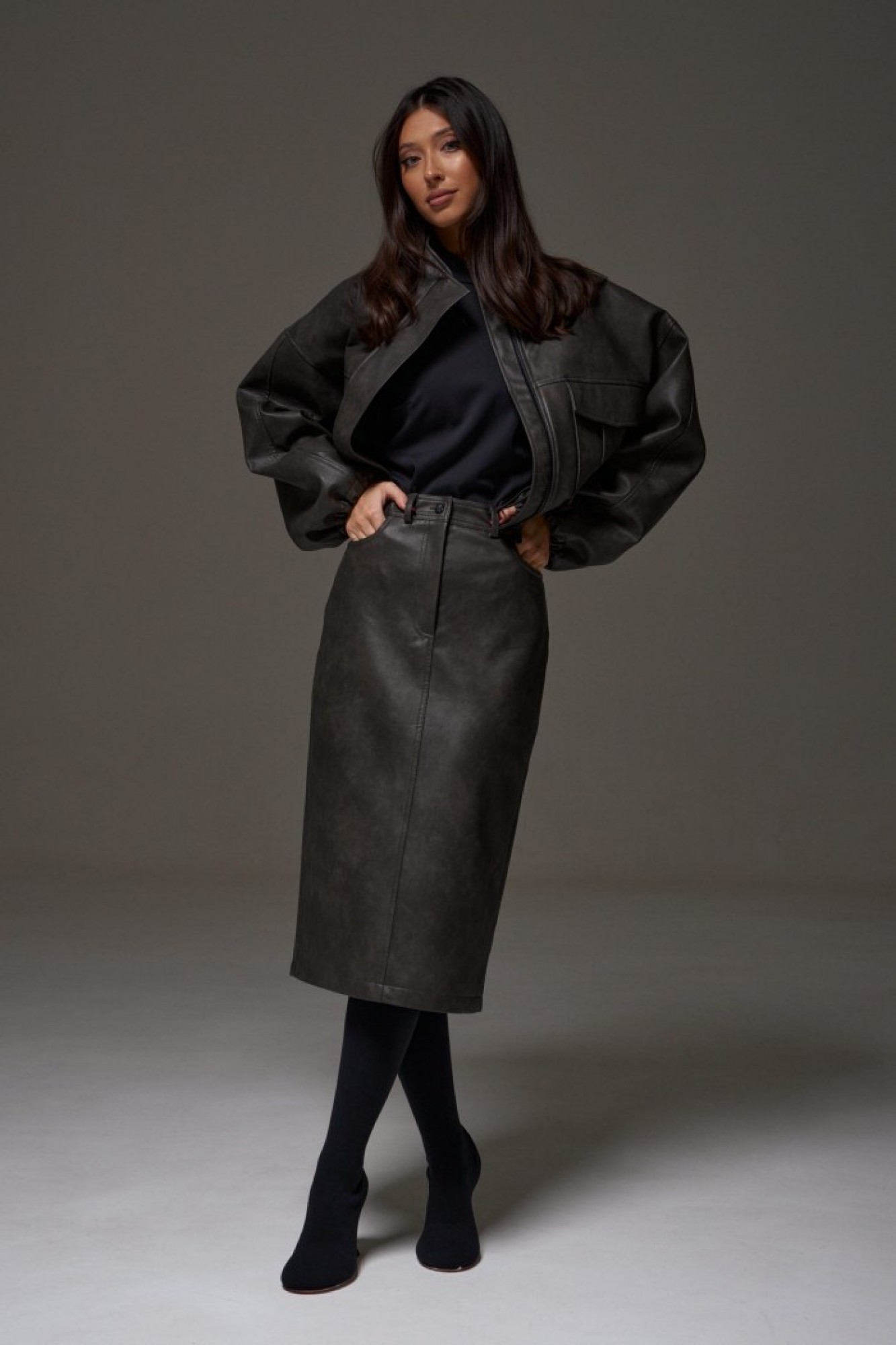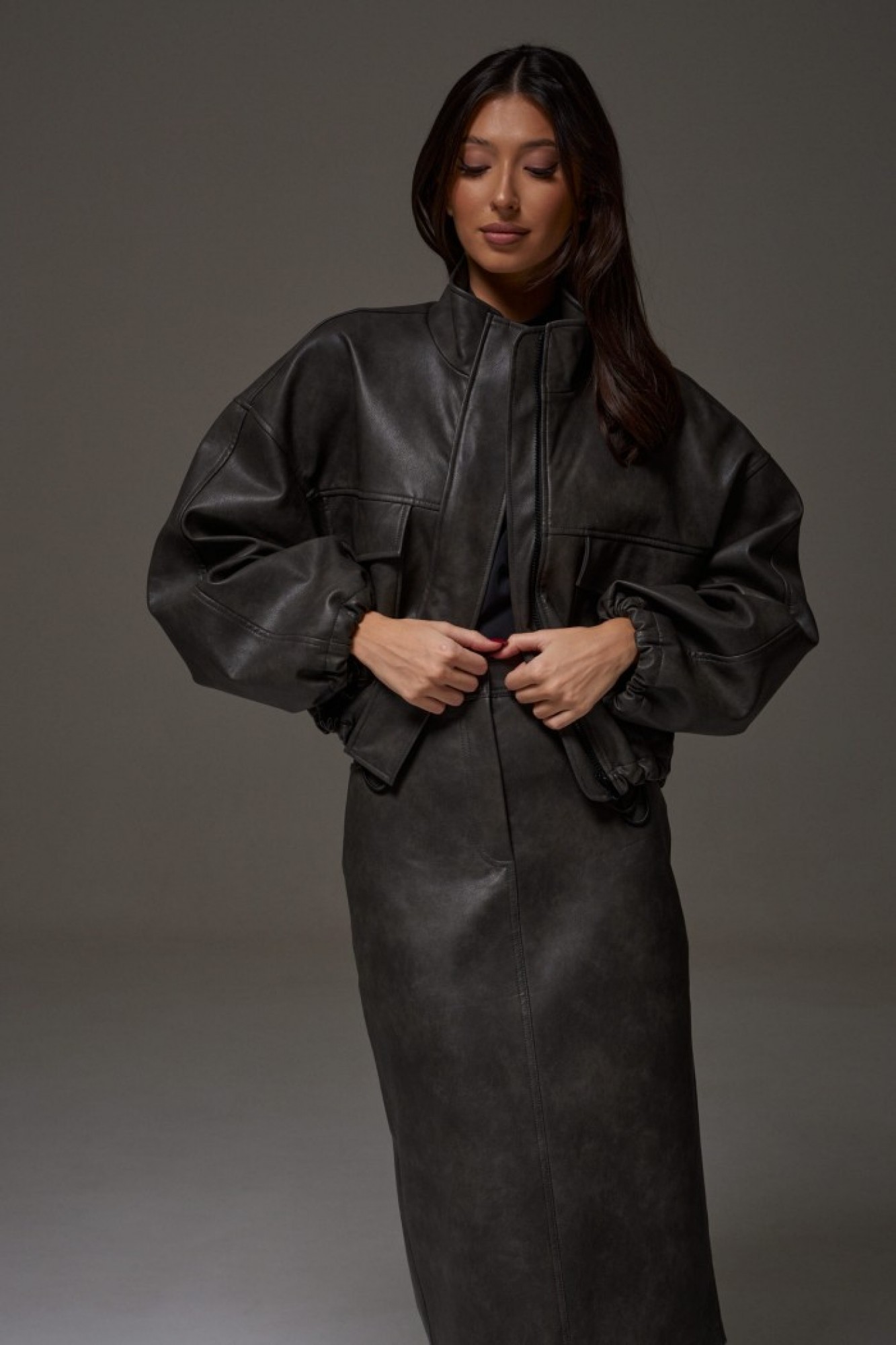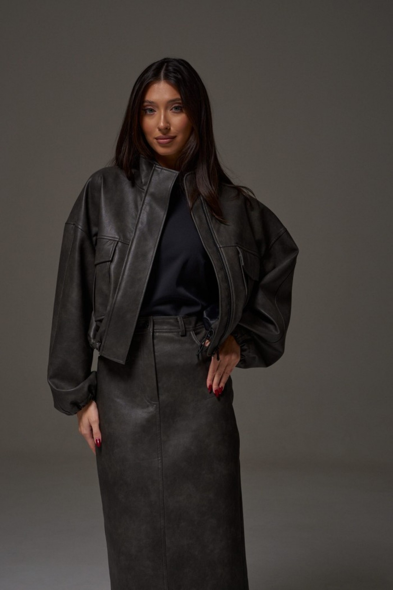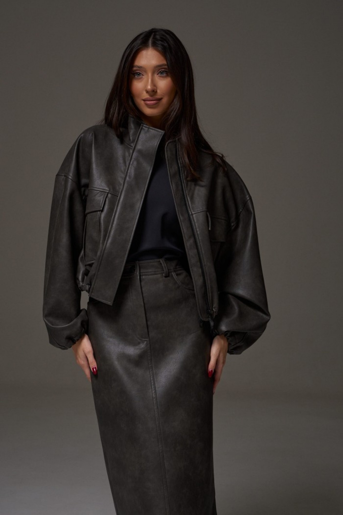 Укороченный жакет, выполнен из мягкой экокожи. Характеристики: прямой свободный крой, воротник стойка, по переду нашиты два кармана с клапанами, брендированная подкладка, застежка центральная на молнии скрыта под планкой. Плечо спущено, манжета рукава на резинке с фиксатором. Низ изделия на резинке с фиксатором.