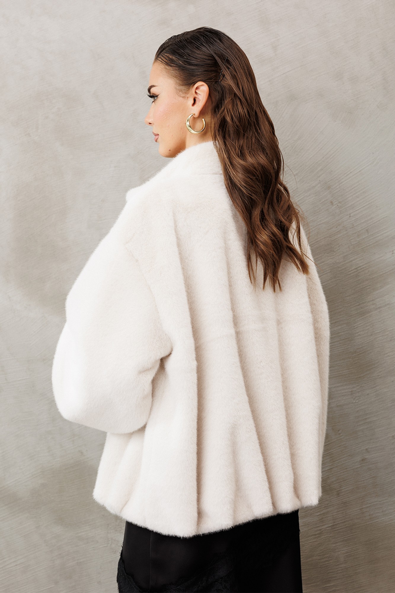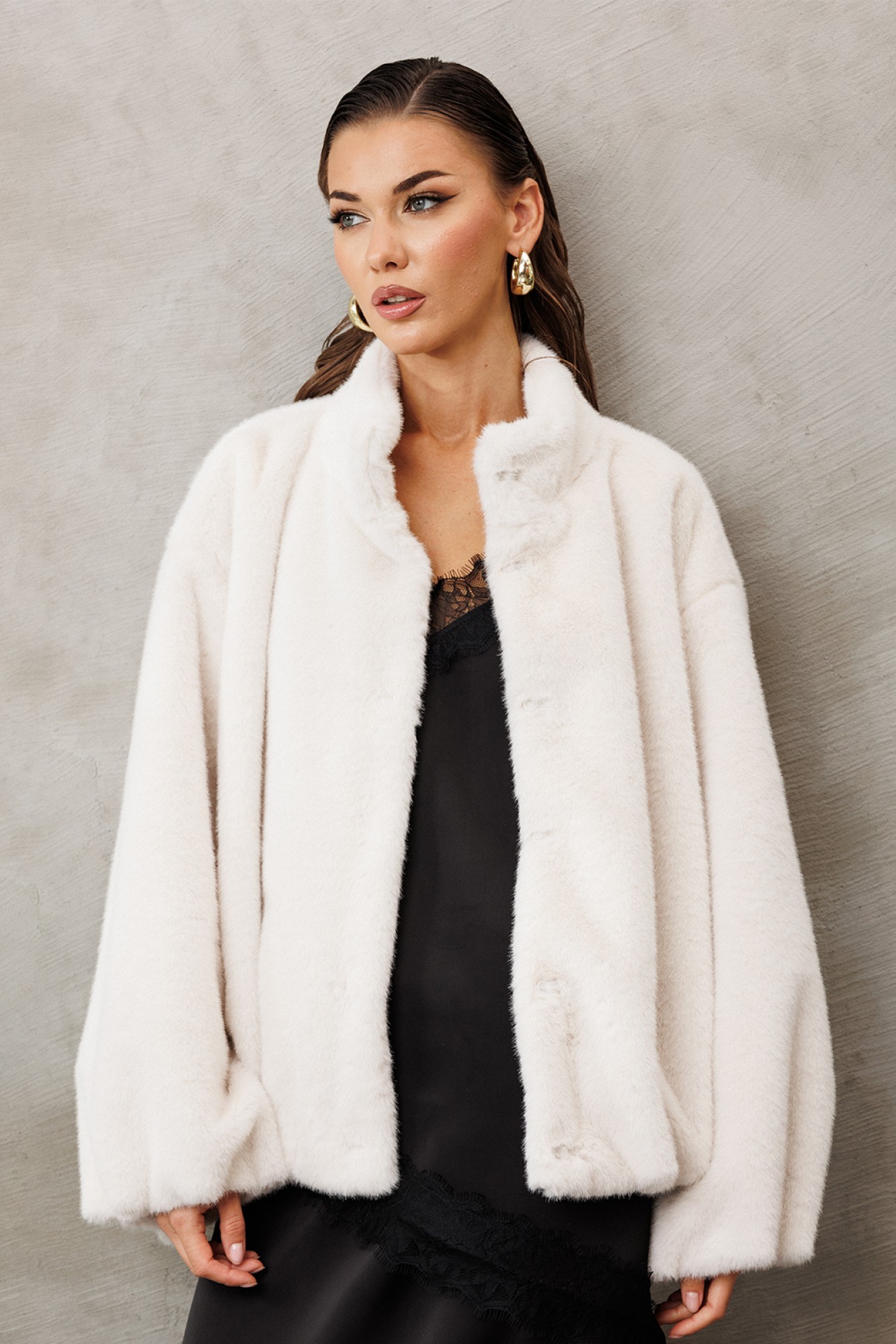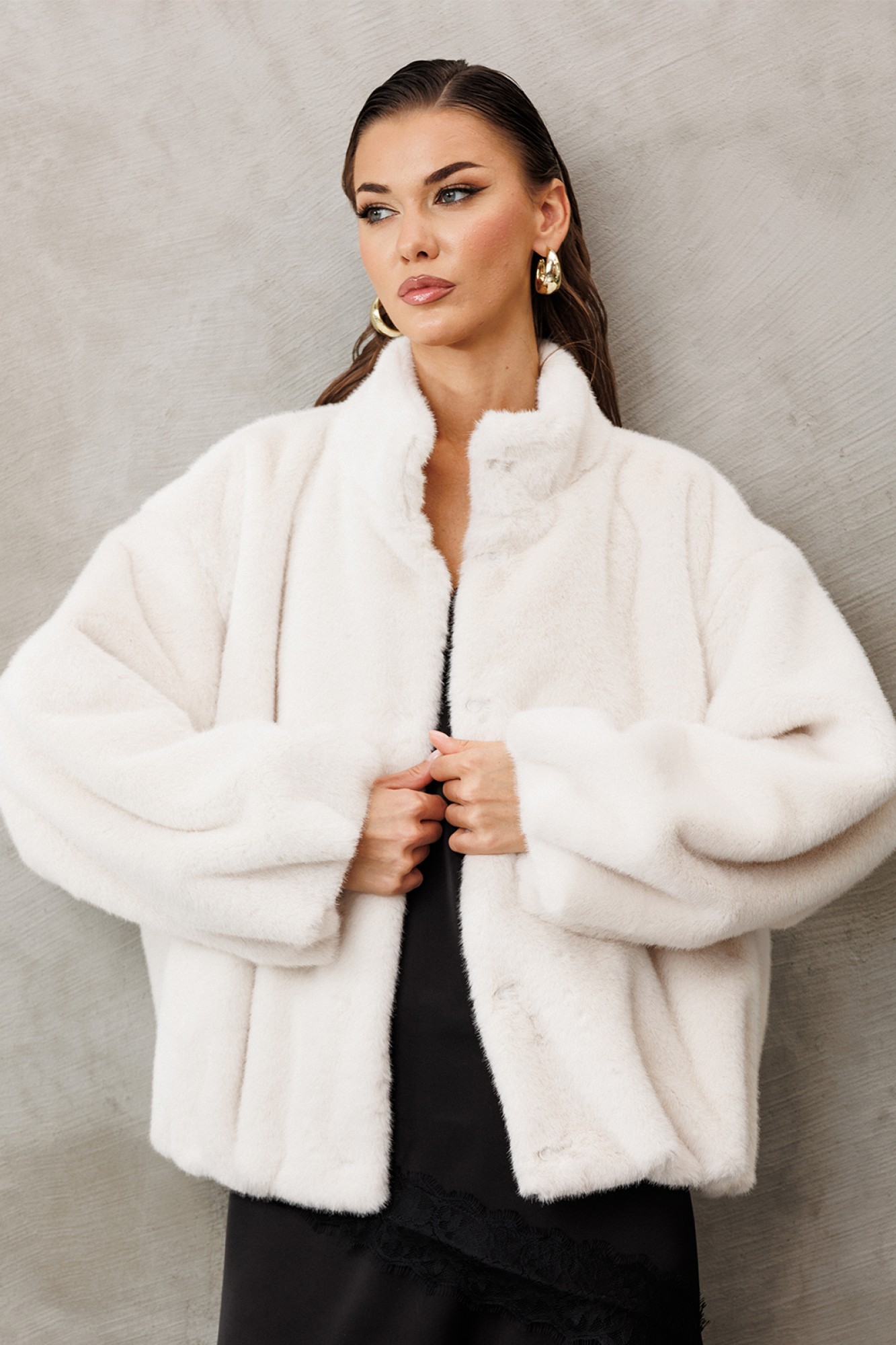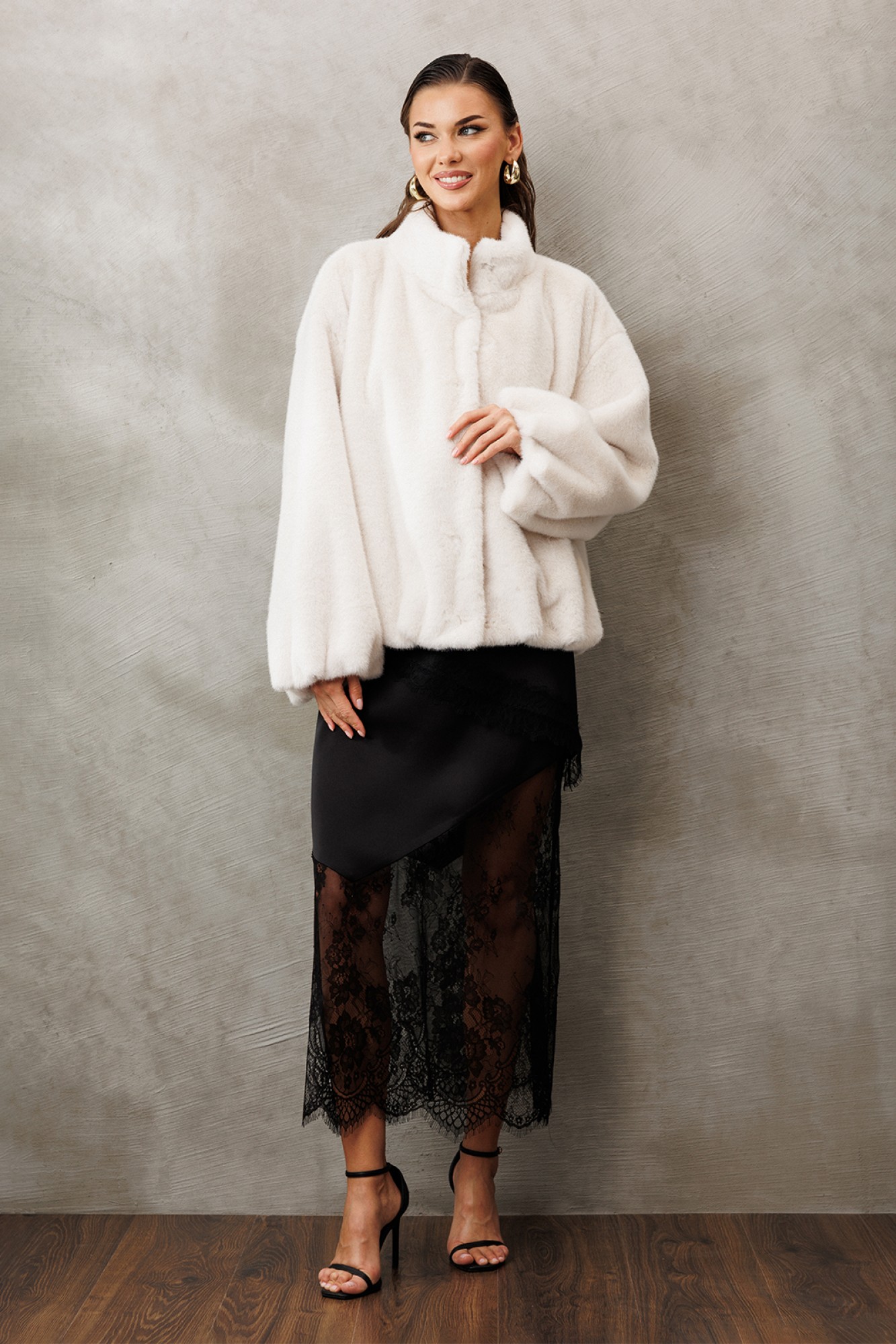 Куртка из искусственного меха прямого силуэта со спущенной линией плеча. Рукав втачной одношовнный внизу со складками. Полочка с центральной застежкой на крючки. Куртка без карманов. Полочка и спинка внизу со складками. По горловине воротник-стойка с застежкой на крючок. Куртка на подкладке.