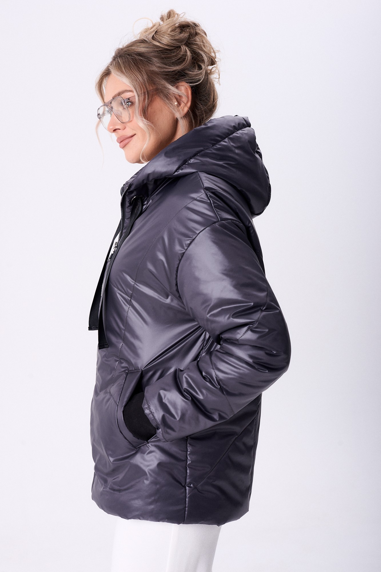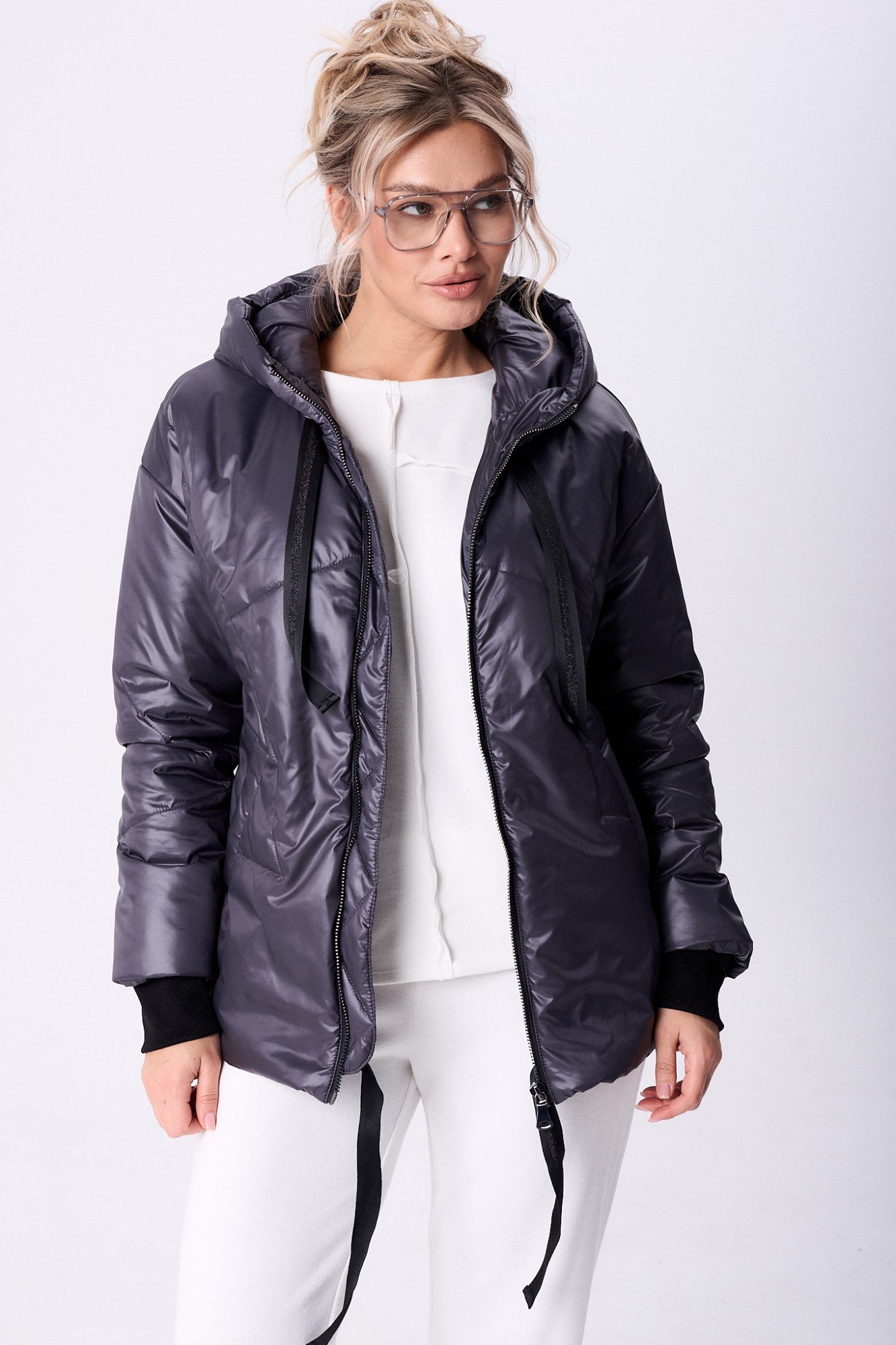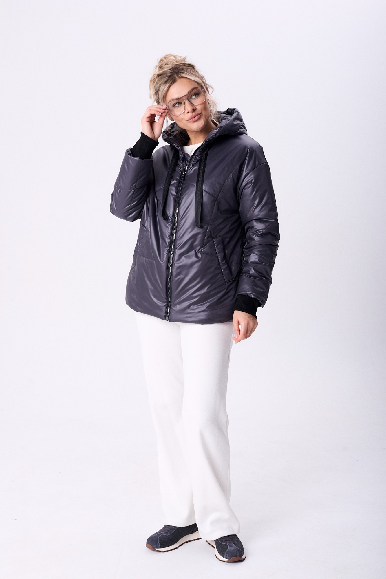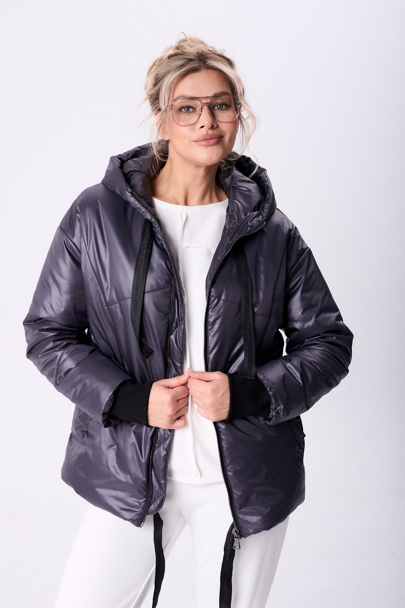 Куртка женская свободного облегания с застежкой на молнию. Спинка с фигурной стежкой. Перед с фигурной стежкой и боковыми прорезными карманами с листочкой. Воротник-капюшон с центральной и боковыми частями с кулисой, шнуром и блочками. Рукав одношовный со спущенной линией плеча с фигурной стежкой и притачными изнутри манжетами-довязами. Куртка на подкладке, с декором печатью на спинке и кулисой со шнуром по низу. Куртка утепленная. По спинке декор+нашивка.