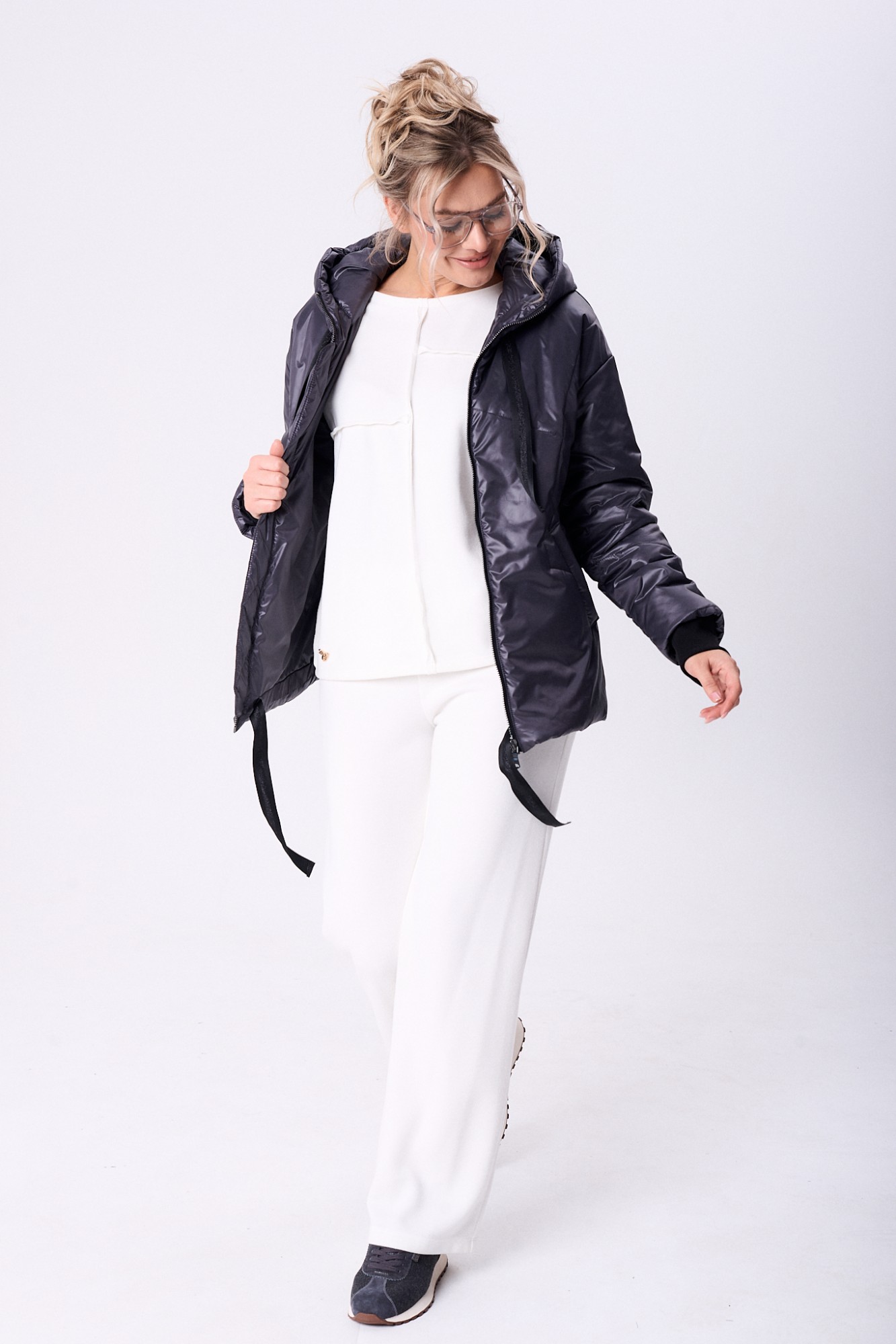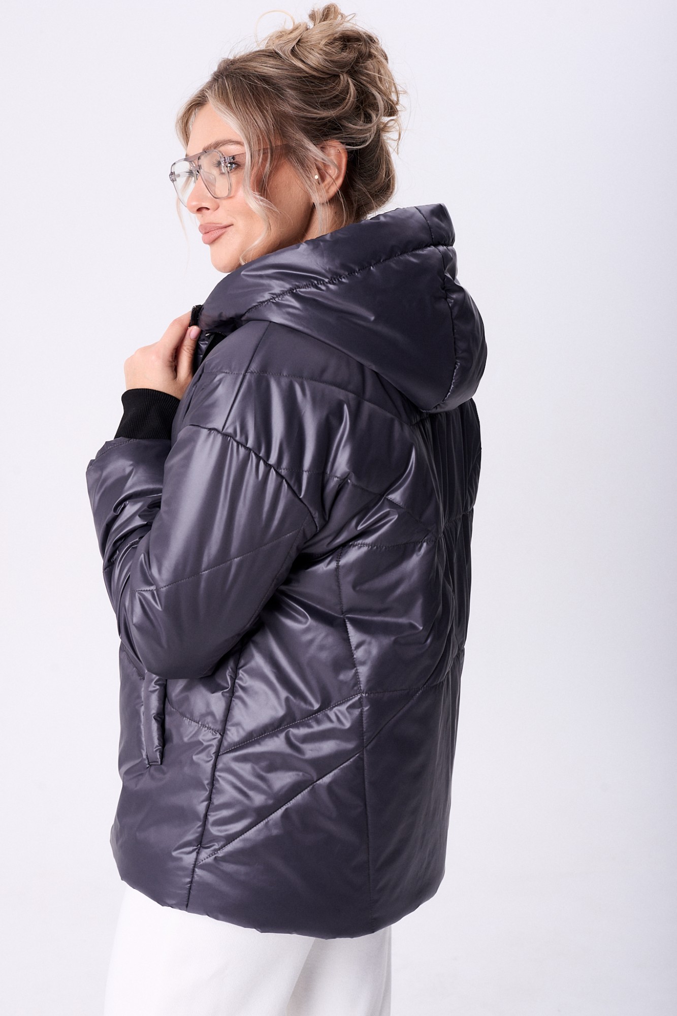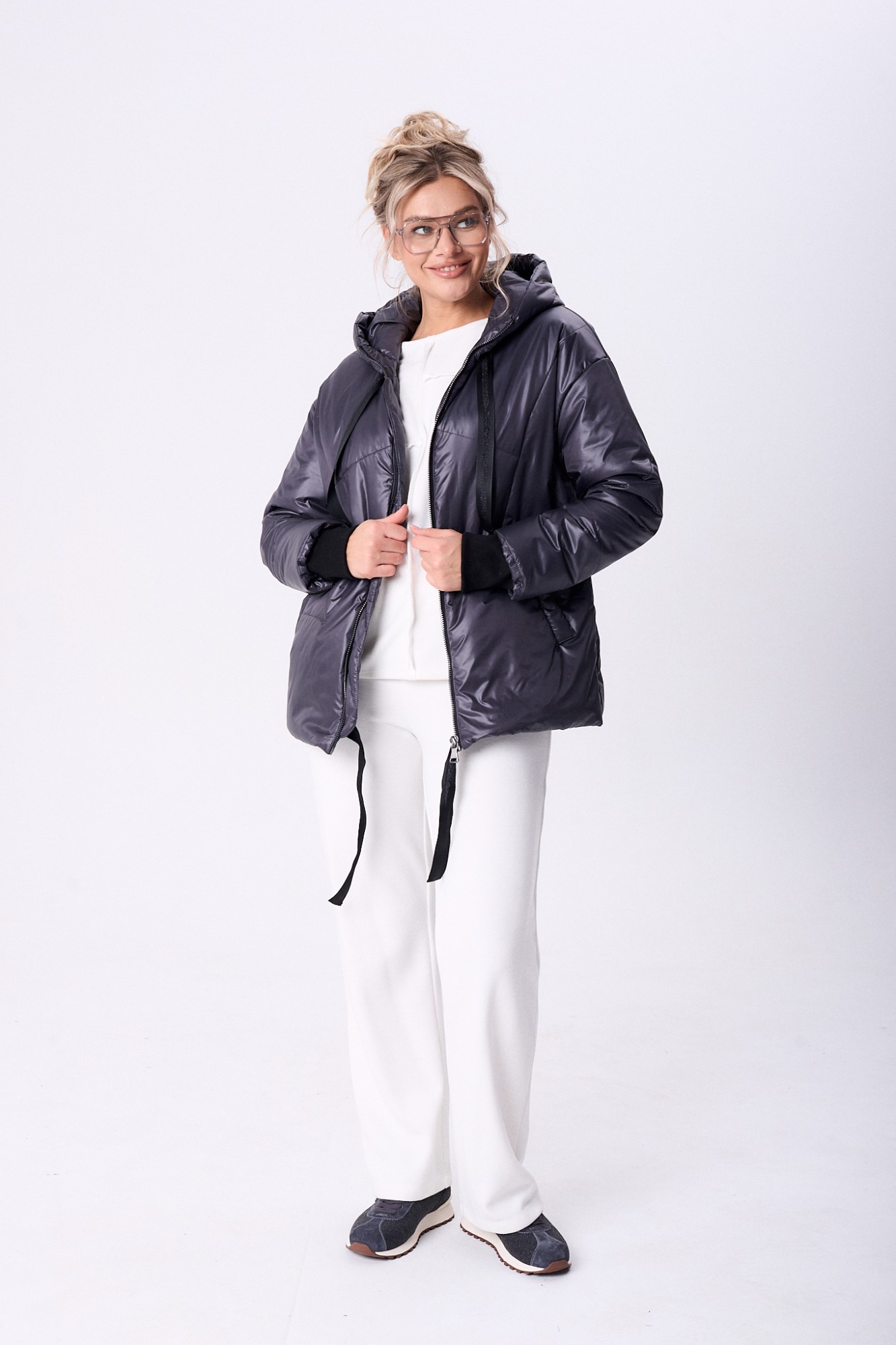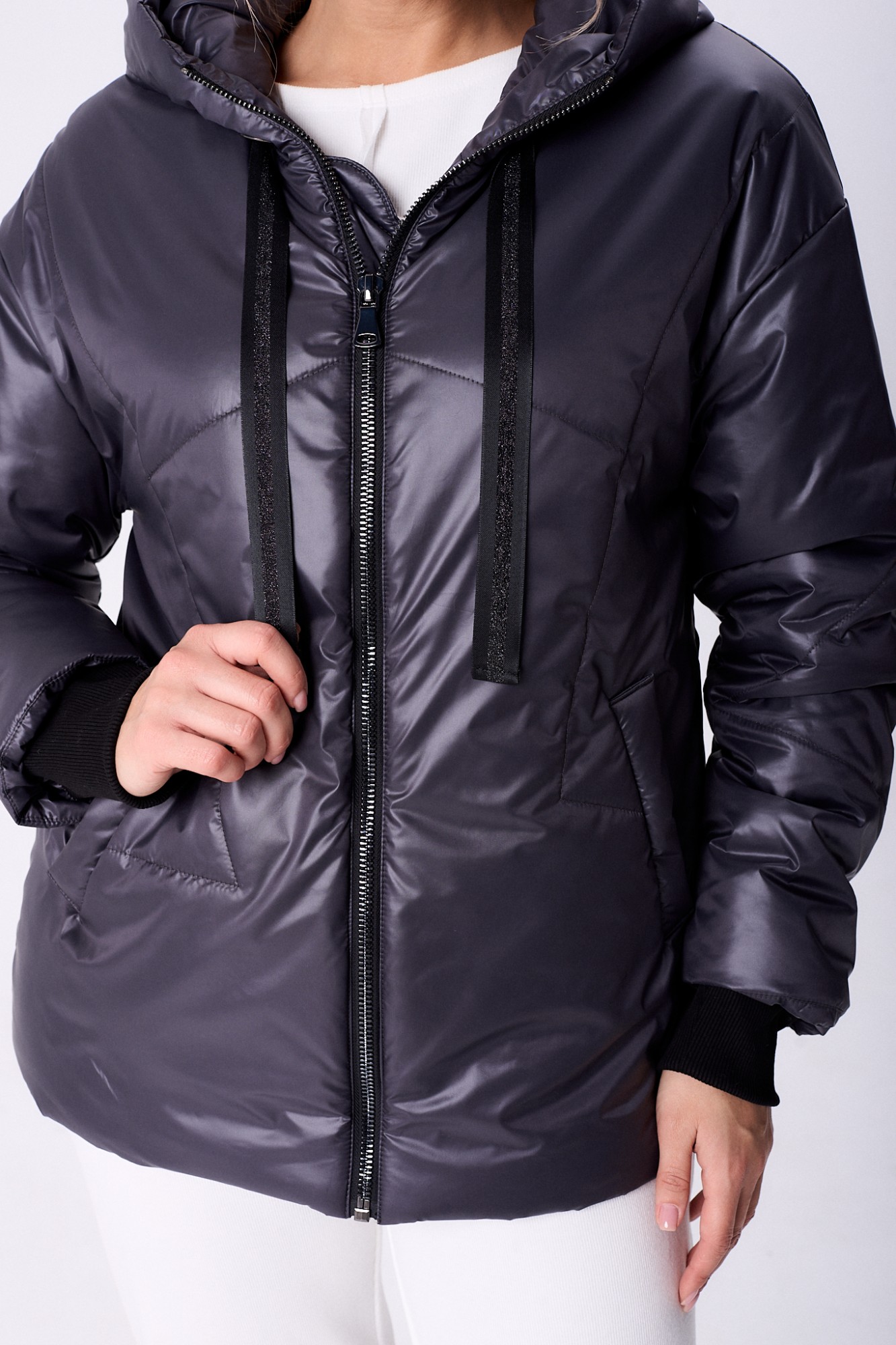 Куртка женская свободного облегания с застежкой на молнию. Спинка с фигурной стежкой. Перед с фигурной стежкой и боковыми прорезными карманами с листочкой. Воротник-капюшон с центральной и боковыми частями с кулисой, шнуром и блочками. Рукав одношовный со спущенной линией плеча с фигурной стежкой и притачными изнутри манжетами-довязами. Куртка на подкладке, с декором печатью на спинке и кулисой со шнуром по низу. Куртка утепленная. По спинке декор+нашивка.