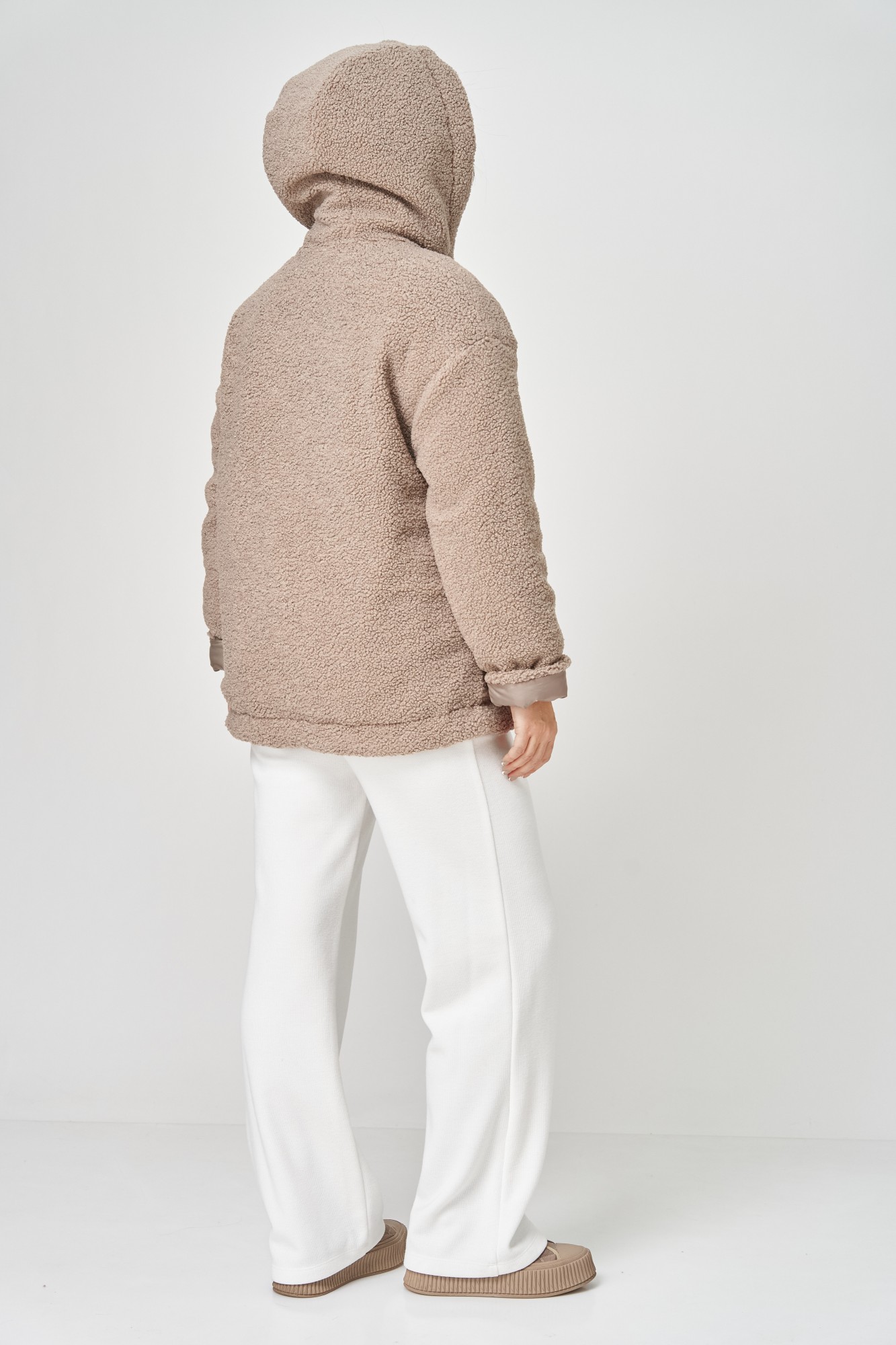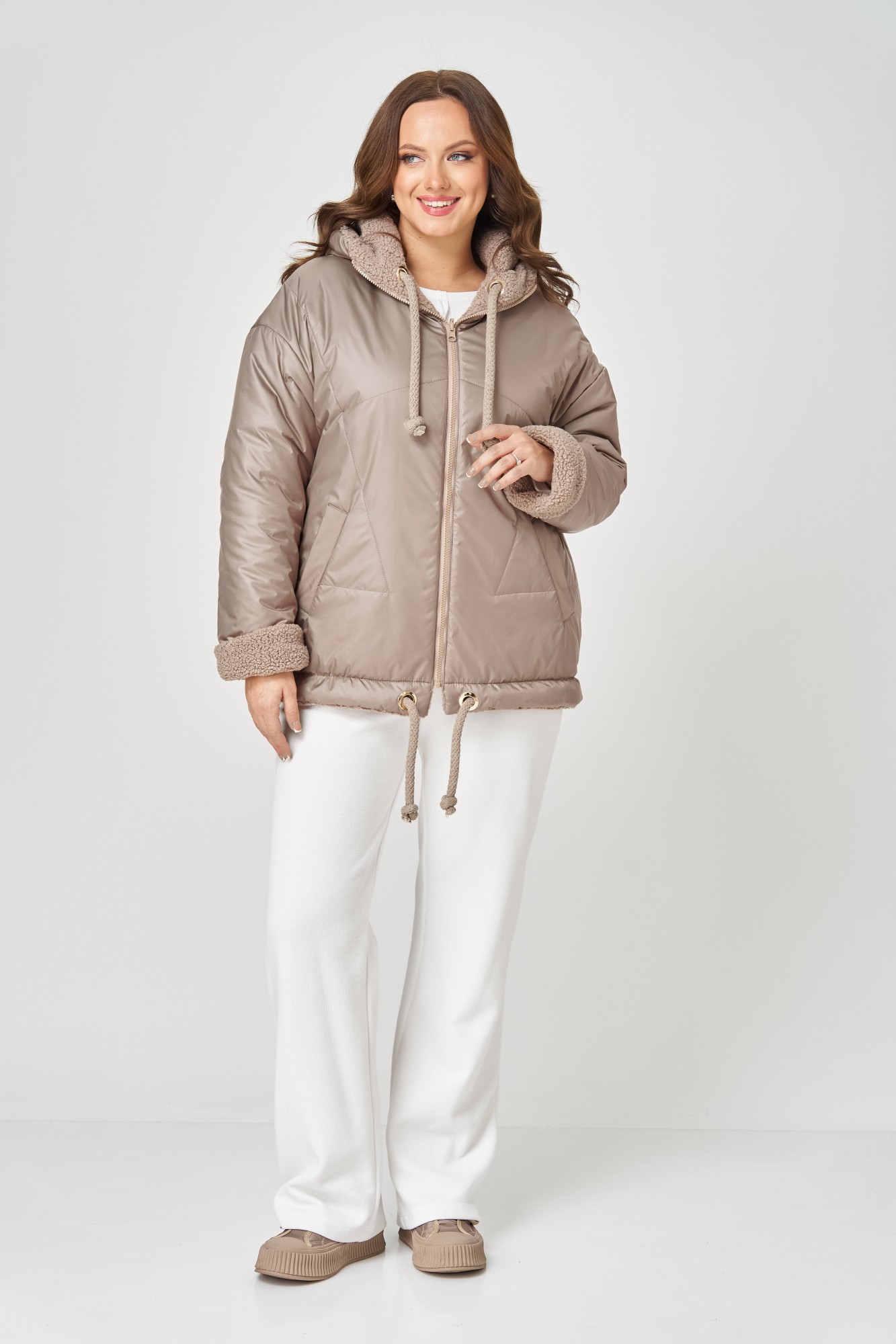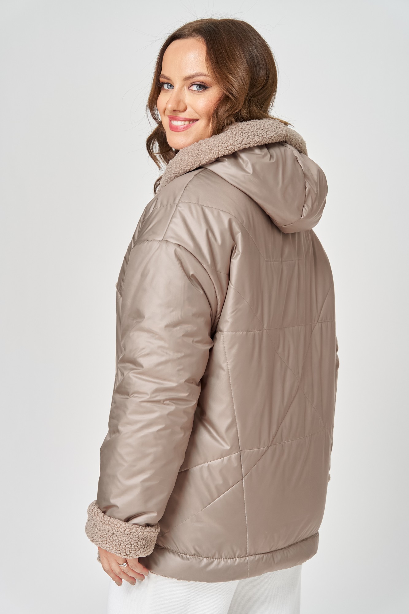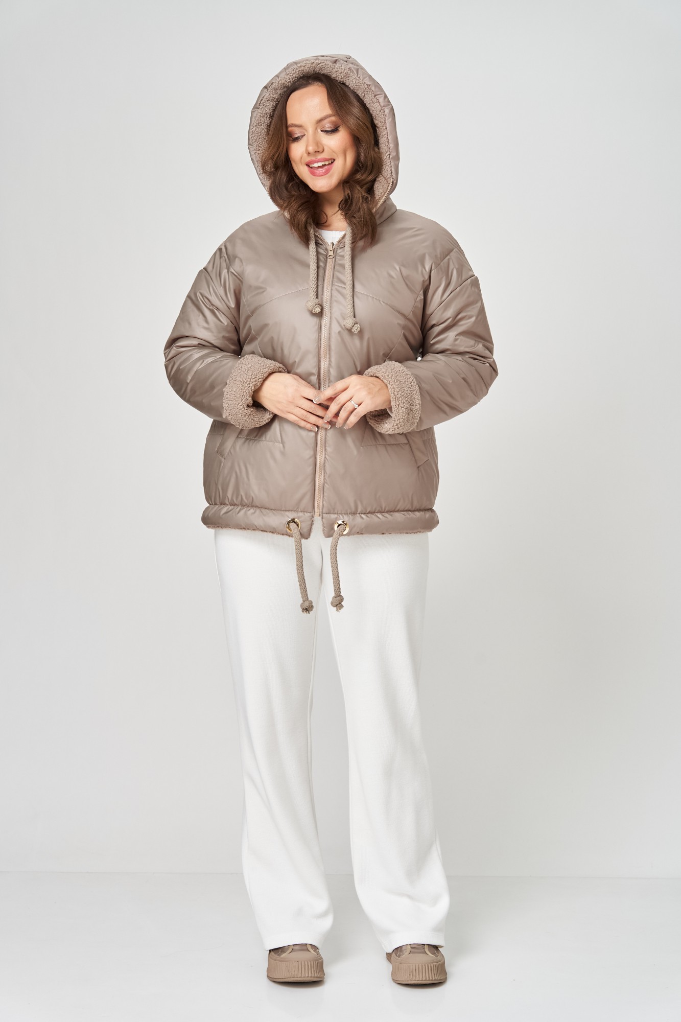 Куртка женская с центральной застёжкой на тесьму-молнию. Двусторонняя. Линия плеча спущена. Рукав втачной одношовный. По переду прорезные карманы с листочкой. Капюшон с центральной частью , по отлету-кулиса. По низу изделия - кулиса. Используется две ткани. Одна сторона простёганная плащёвка, вторая сторона искусственный мех.