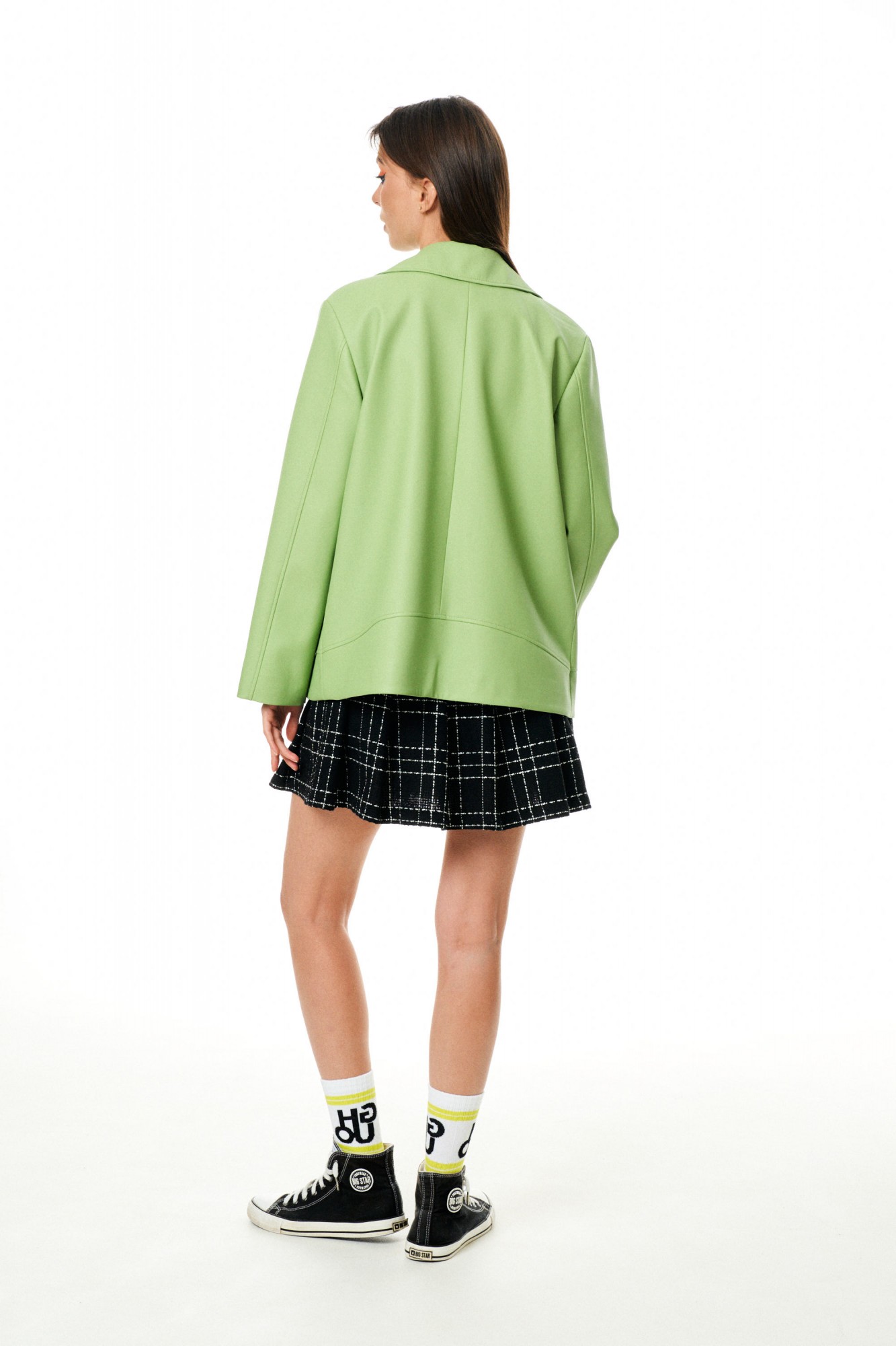 Жакет женский, свободного силуэта, длиной до середины линии бедер из эко кожи. Перед с функциональными прорезными карманами на молнии и смещенной застежкой на молнию. Спинка со средним швом и фигурным подрезом снизу. Рукав втачной, длинный, двухшовный. Воротник отложной пиджачного типа. На концах воротника и лацканах отделочные кнопки. Жакет на подкладке.