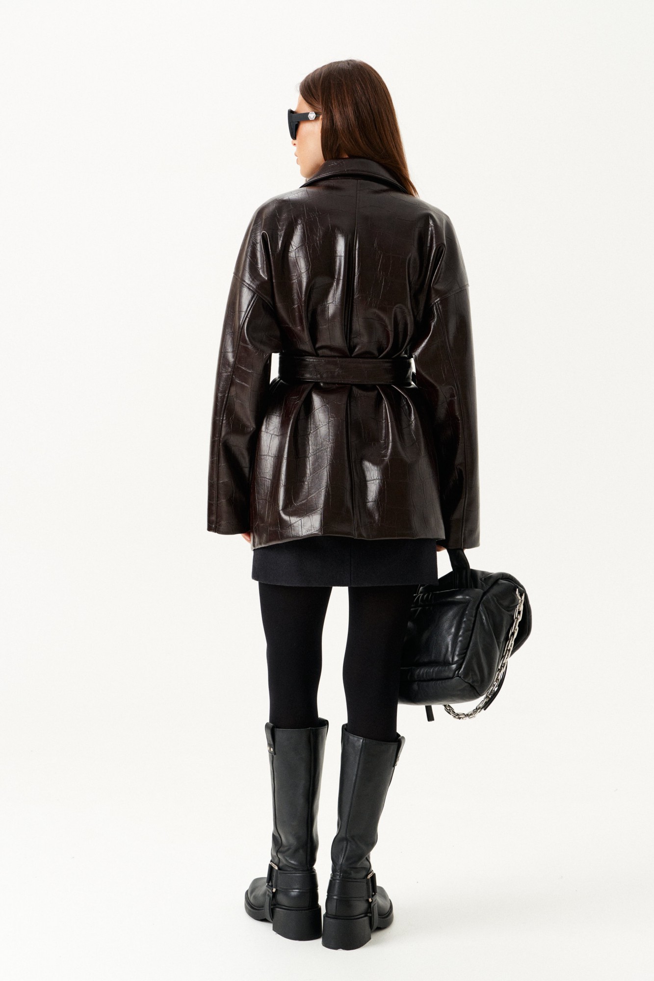 Куртка из искусственной кожи, прямого силуэта, со спущенной линией плеча, длиной ниже линии бедер, с центральной застежкой на петли и пуговицы, на подкладке. Полочки с двумя совмещенными накладными карманами – верхним с клапаном и нижним. Спинка со средним швом. Рукав втачной двухшовный. Воротник отложной с отрезной стойкой. В комплекте пояс из основной ткани.