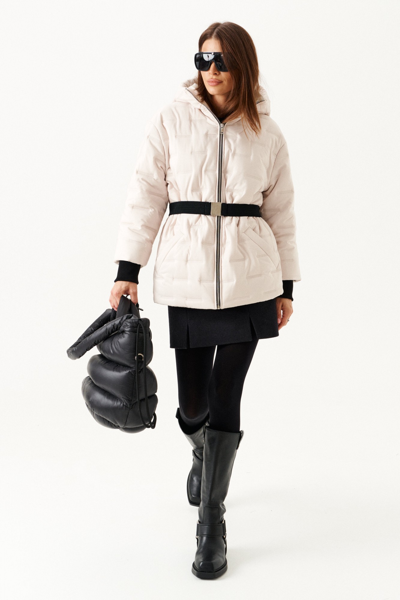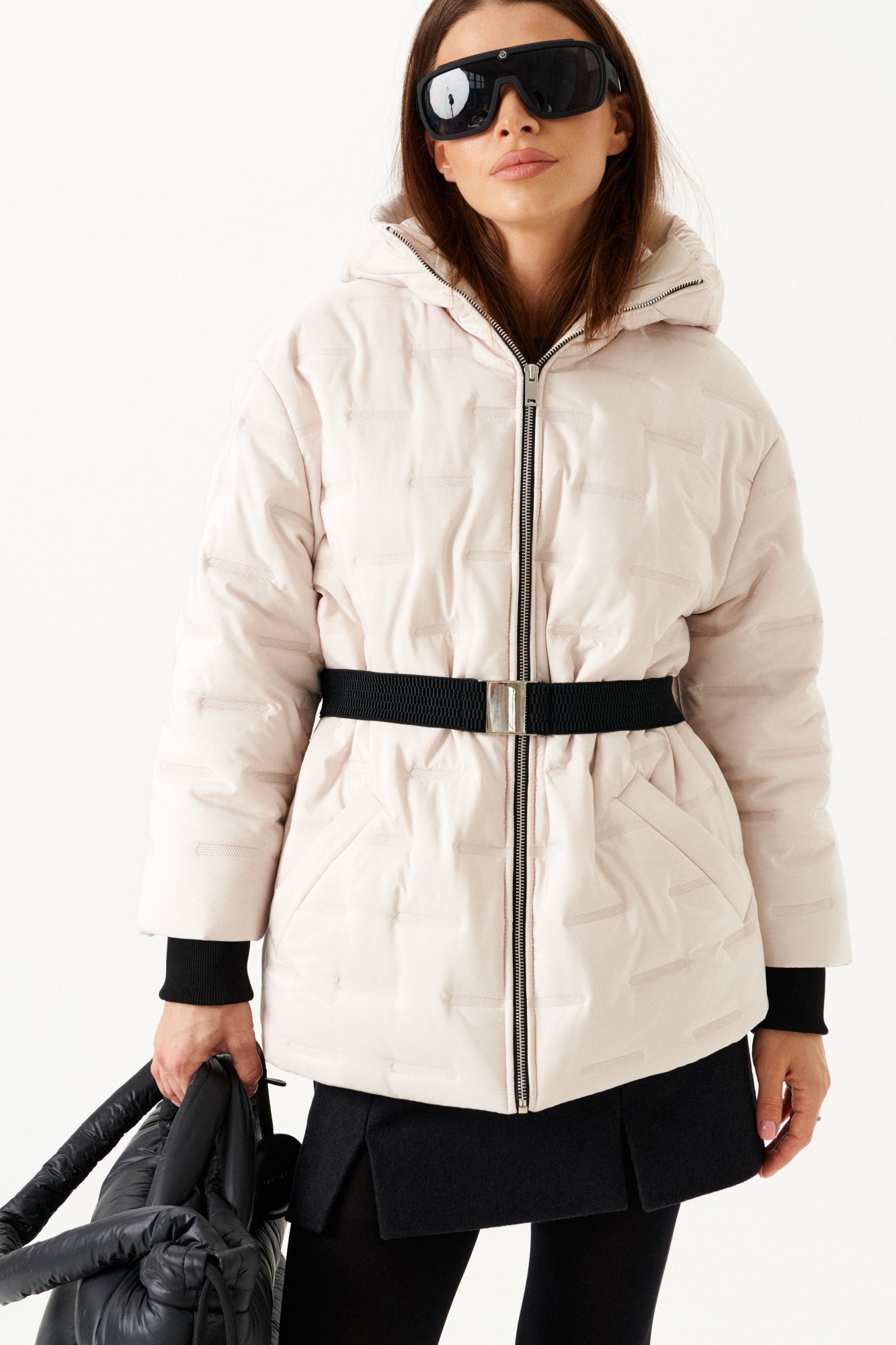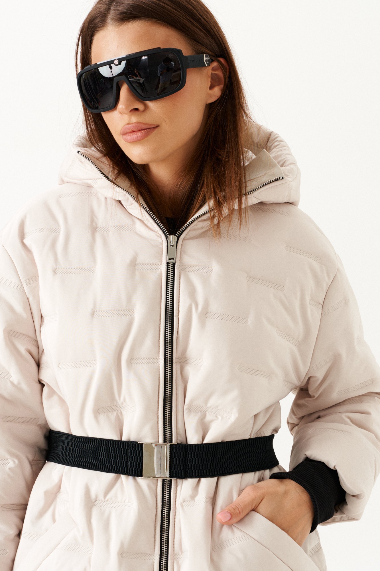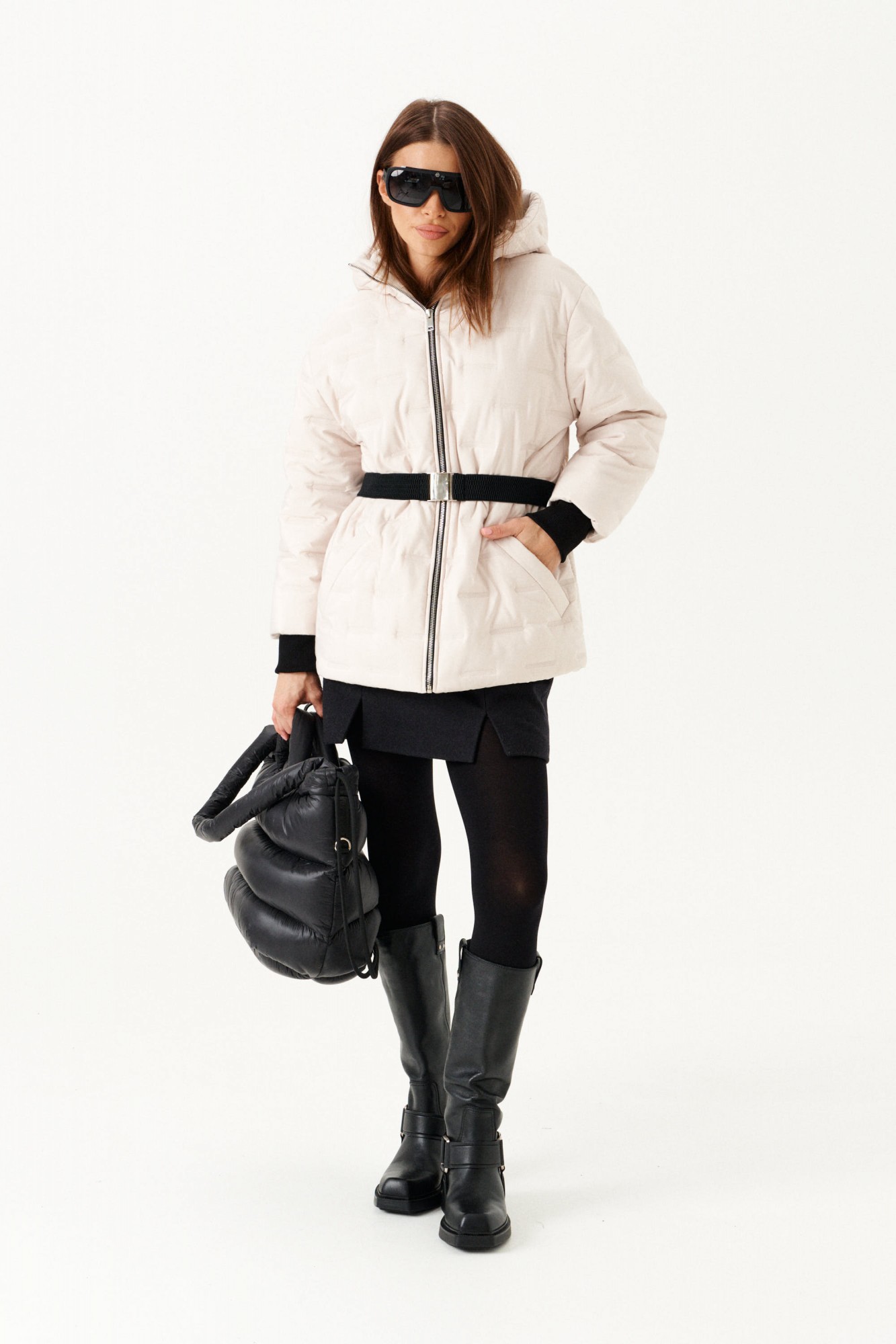Куртка прямого силуэта, из стеганой курточной ткани с утеплителем термостежка изософт 180г/м2,, свободная, длиной ниже линии бедер, с центральной застежкой на тесьму-молнию, капюшоном. По полочкам прорезные карманы с листочкой. Спинка цельная. Рукав втачной, длинный. Манжета рукава из полотна «рибана». В комплекте декоративный пояс.