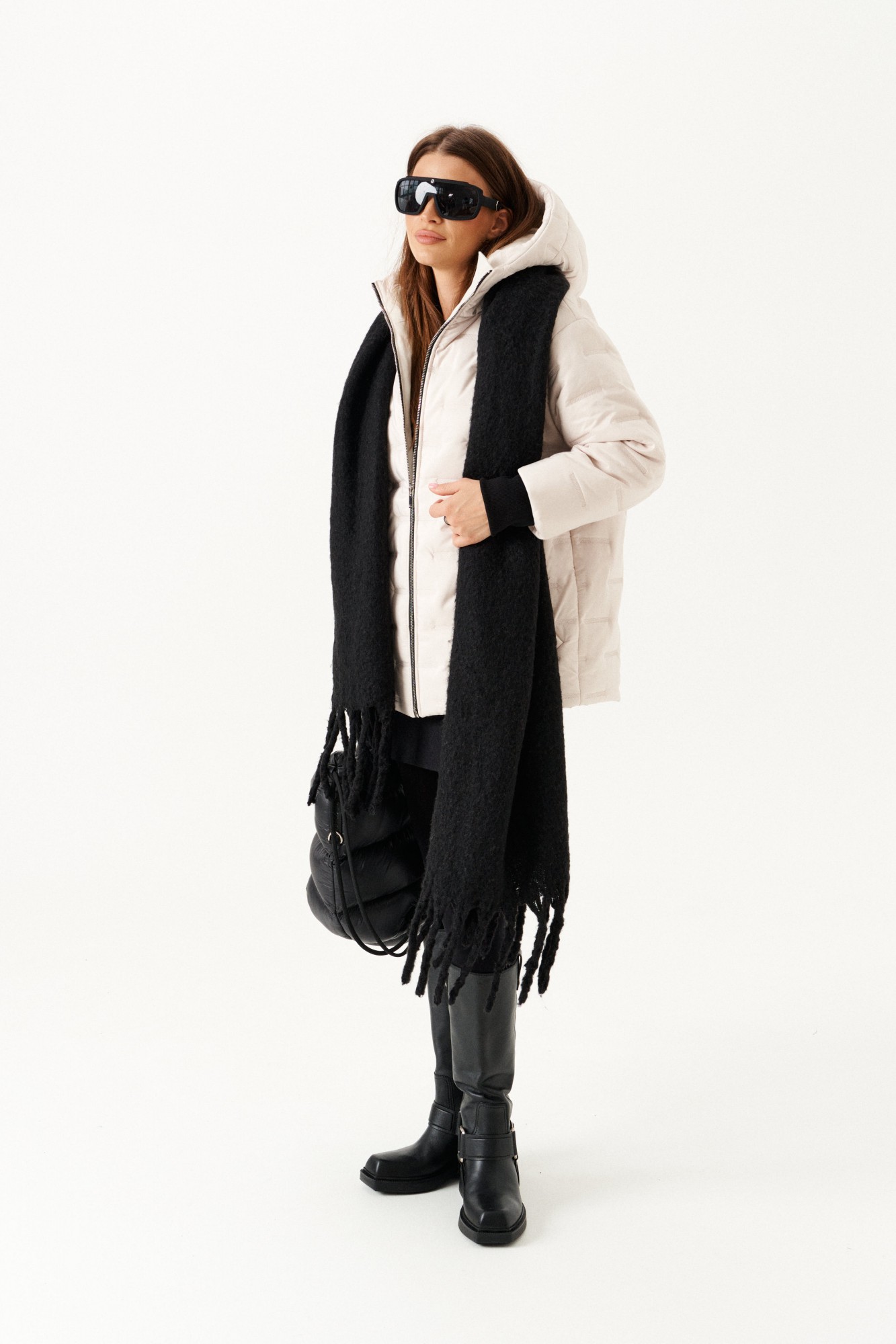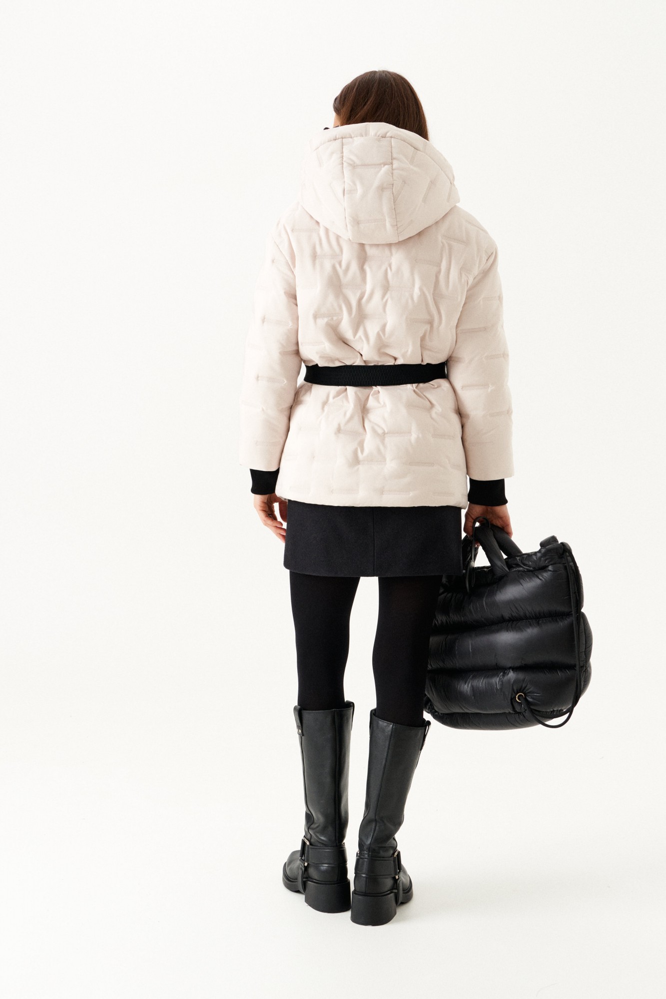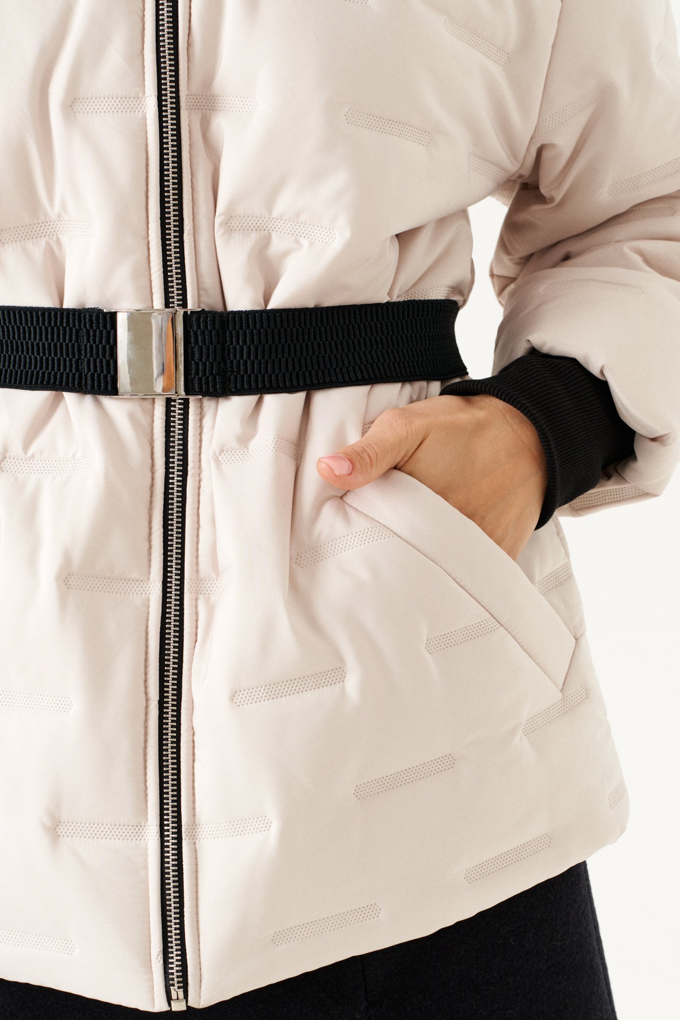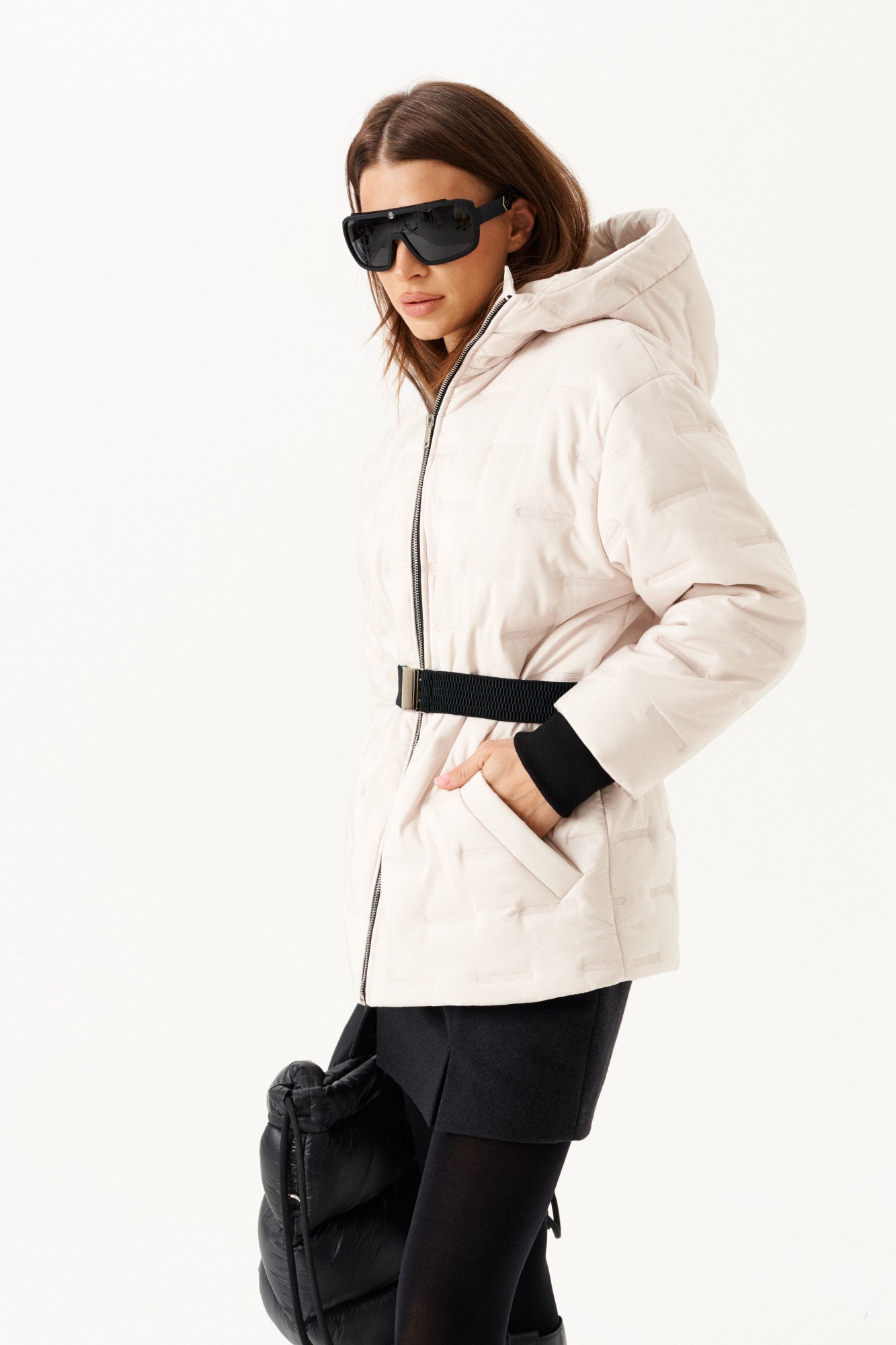 Куртка прямого силуэта, из стеганой курточной ткани с утеплителем термостежка изософт 180г/м2,, свободная, длиной ниже линии бедер, с центральной застежкой на тесьму-молнию, капюшоном. По полочкам прорезные карманы с листочкой. Спинка цельная. Рукав втачной, длинный. Манжета рукава из полотна «рибана». В комплекте декоративный пояс.