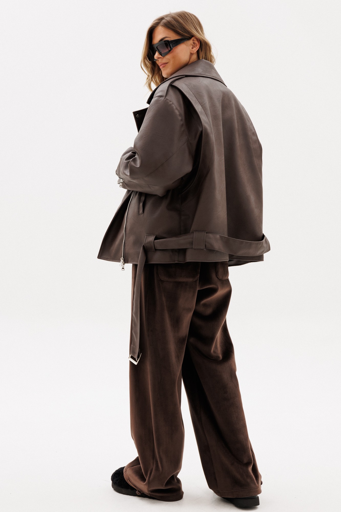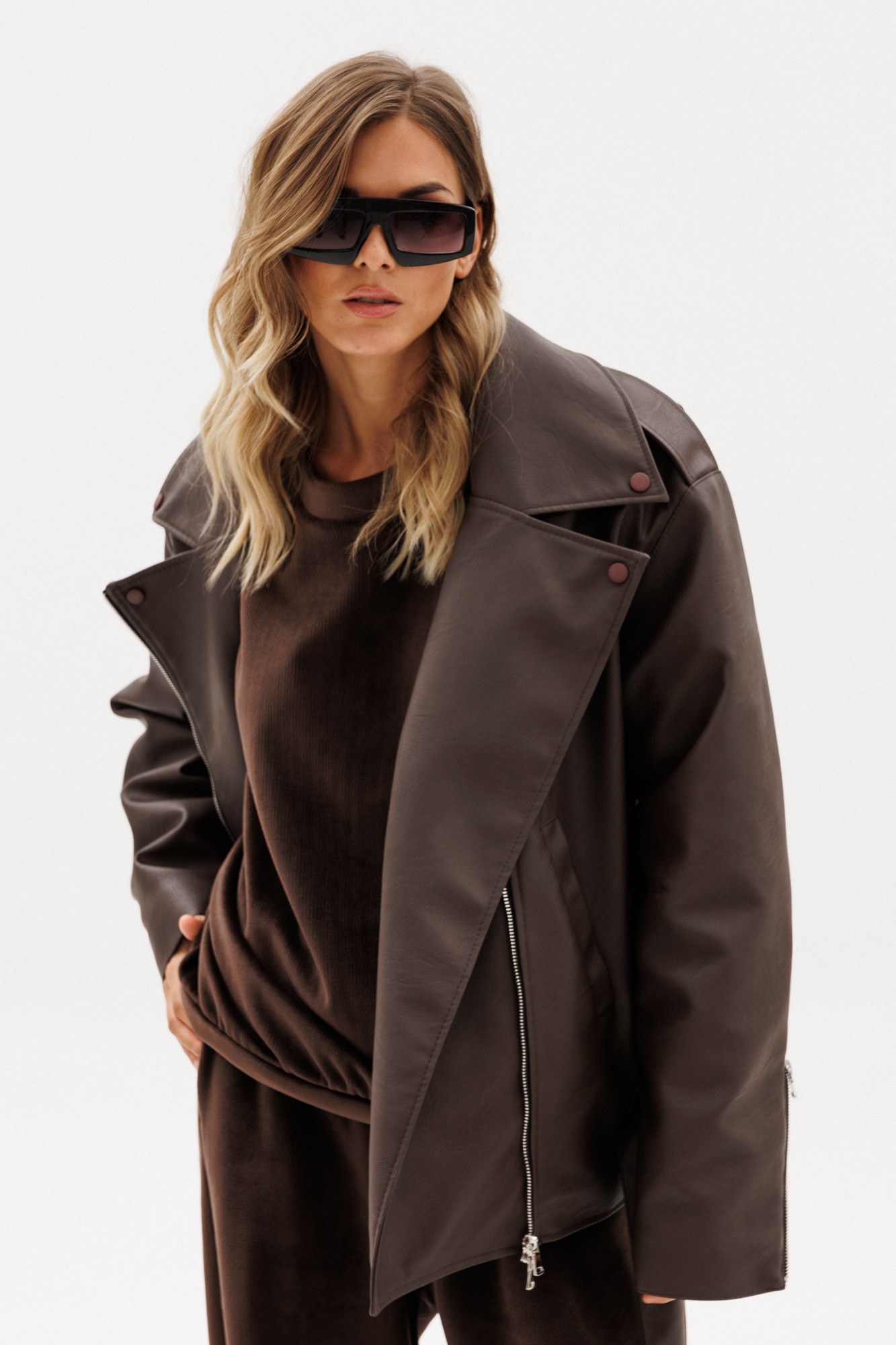 Куртка выполнена из эко-кожи. Куртка прямого силуэта, покроя ""oversize"". Спереди прорезные карманы, лацканы, один клапан справа, и смещенная застежка на молнию. На спинке фигурные подрезы от плечевого шва до боковых. Воротник пиджачного типа. Плечевой шов удлинен. Рукав рубашечного покроя, двухшовный. В заднем шве рукава молния с металлическими звеньями. В окаты вставлены погоны, по низу куртки протянут пояс из основной ткани с металлической пряжкой. На концах воротника, лацканов, по погонам и клапану пробивные кнопки. Куртка на утепленной притачной по низу подкладке. Температурный режим: от 0 до -5 С.