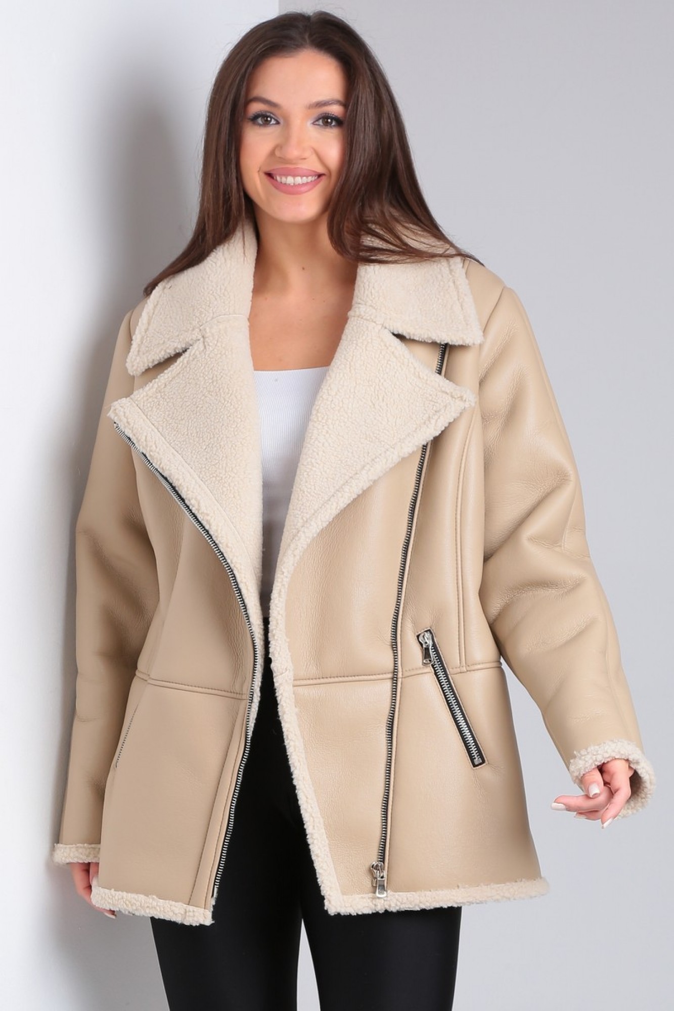 Изделие выполнено из мягкой и легкой экокожи. Куртка без подкладки и утеплителя, изнанка - экомех. Все молнии на куртке металлические.