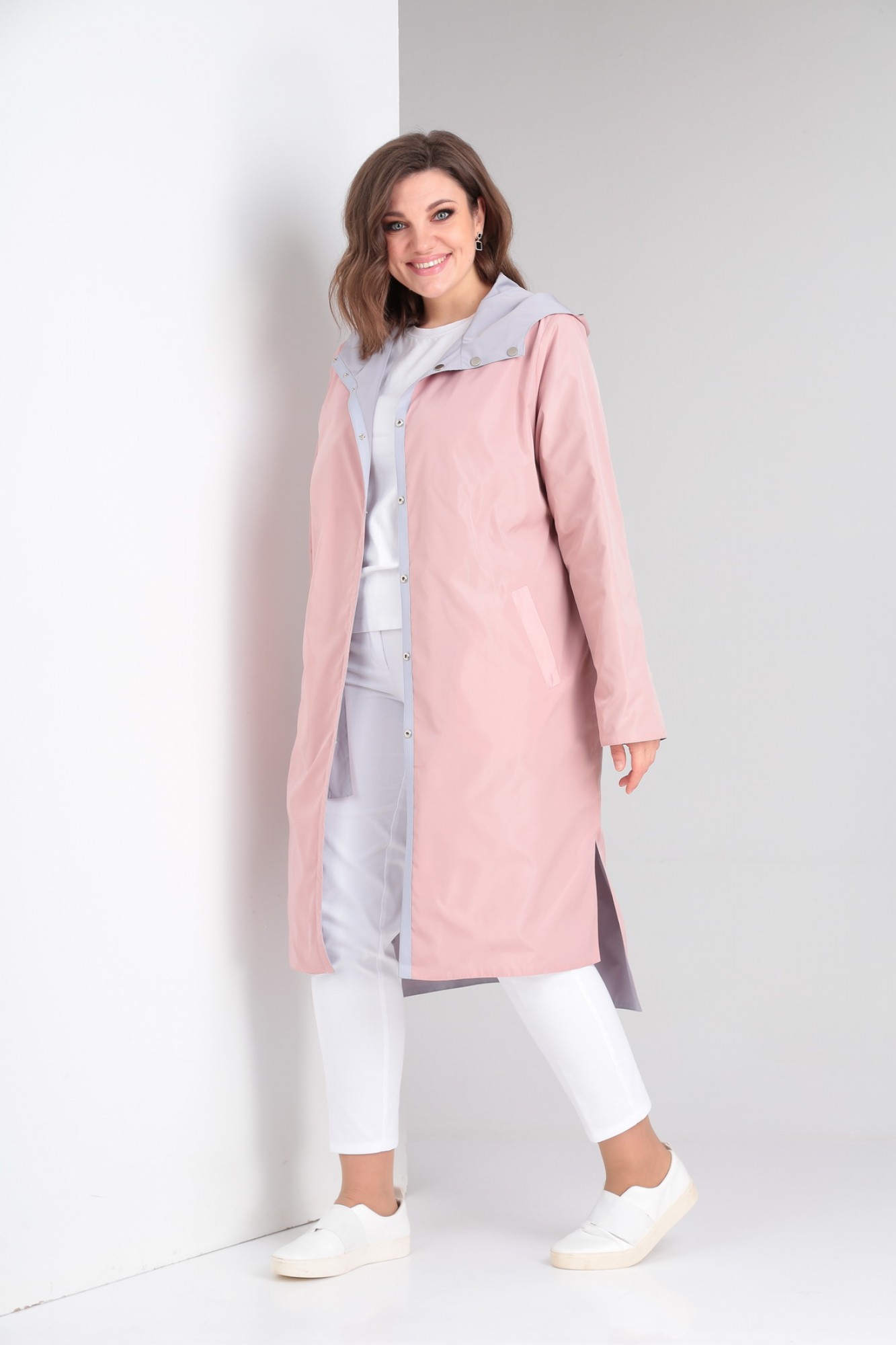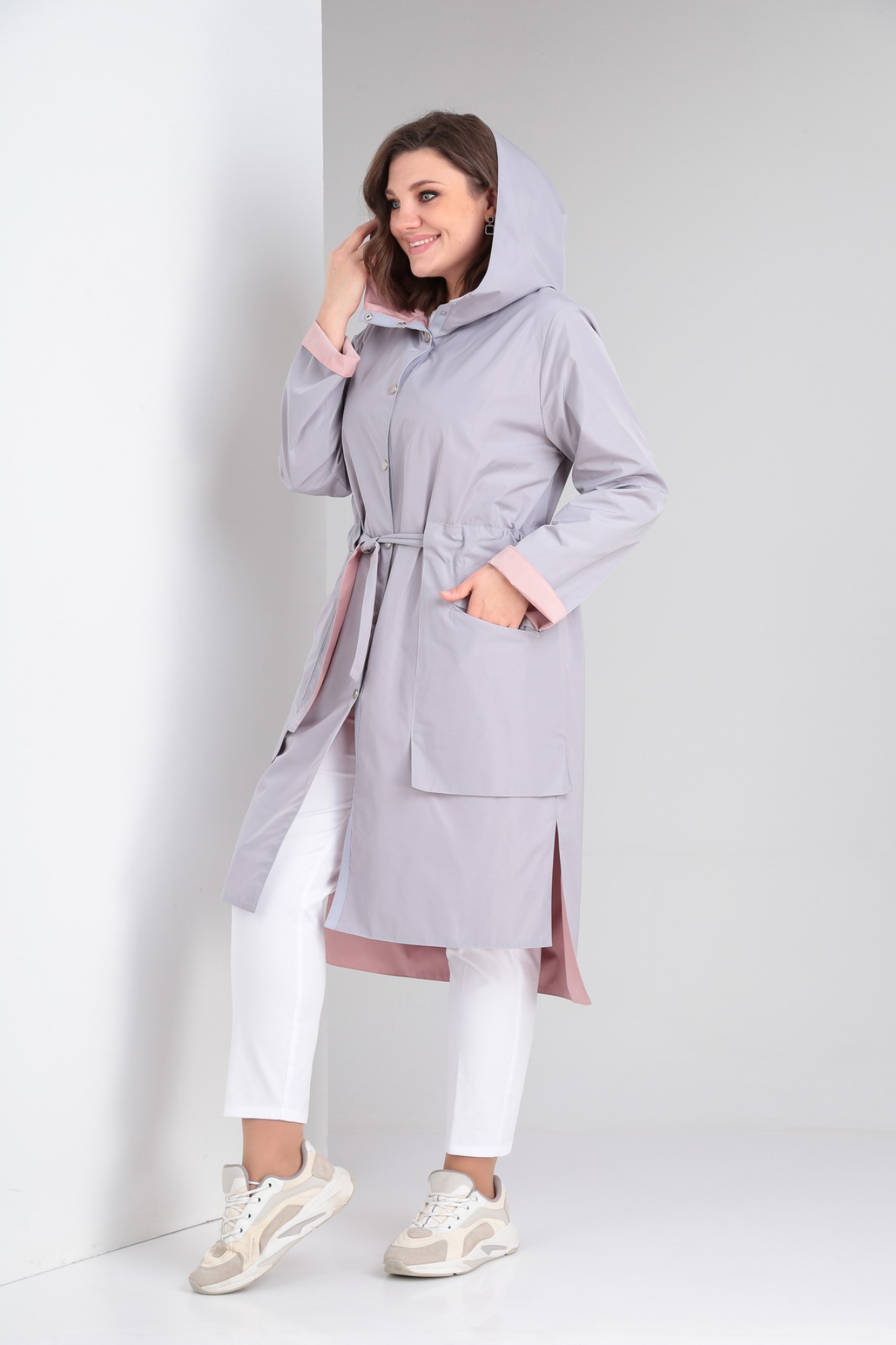 Кардиган женский прямого силуэта с застёжкой на кнопки двусторонний. Перед одной стороны с накладными карманами, которые образуют кулисы сверху и отлетные снизу. Вторая сторона плаща с карманами с листочкой. Рукав втачной одношовный. Воротник - капюшон.
