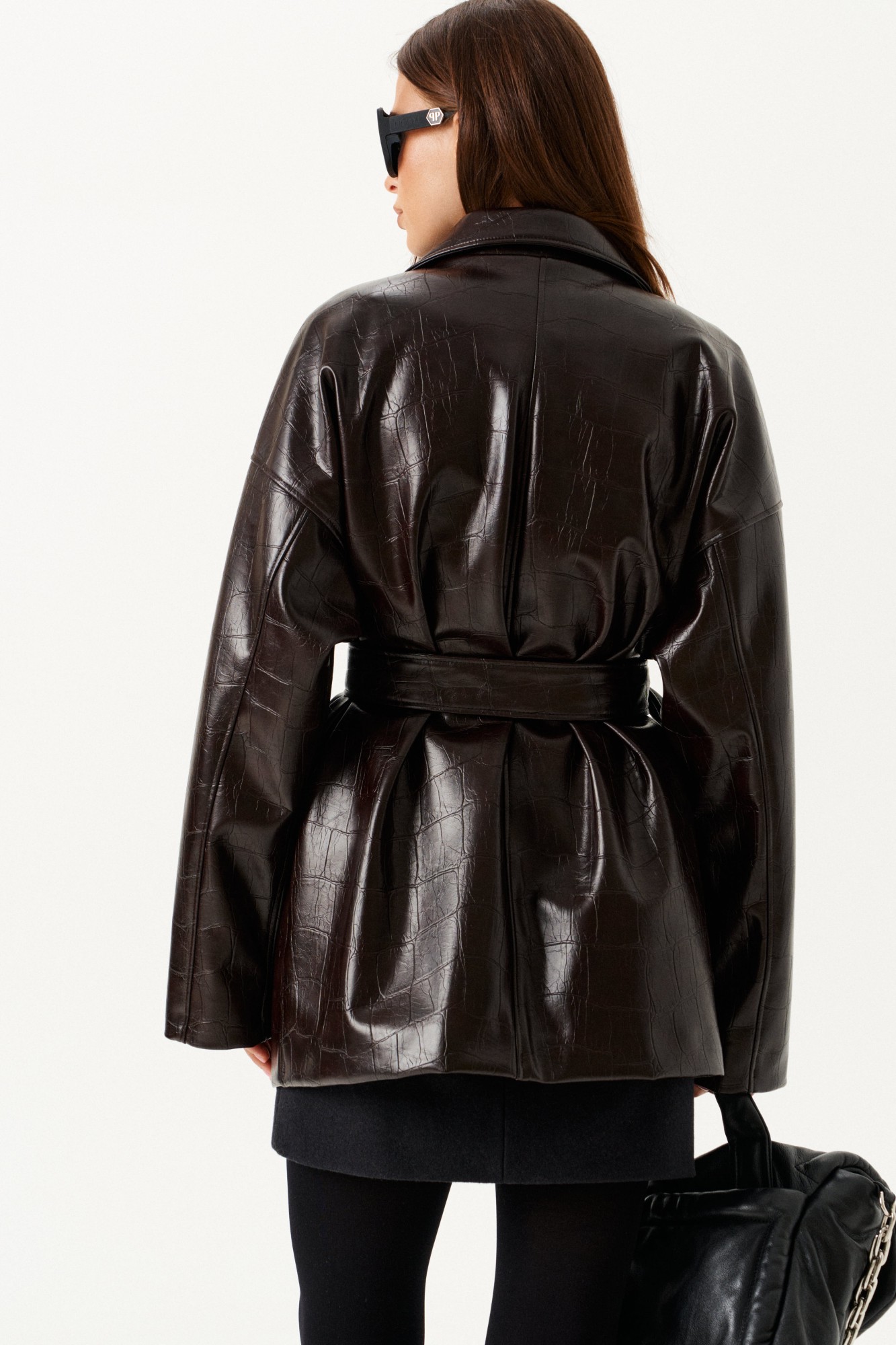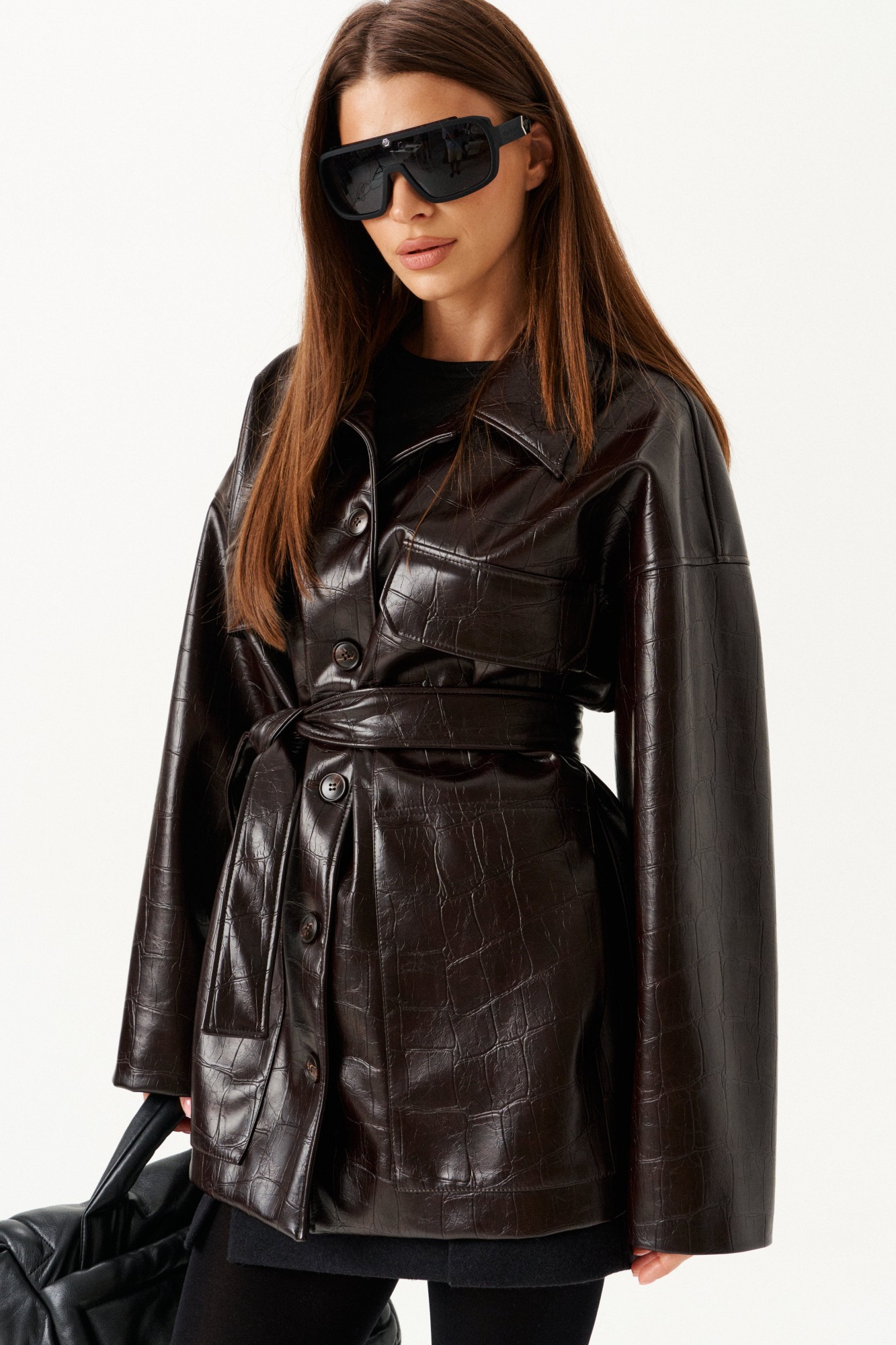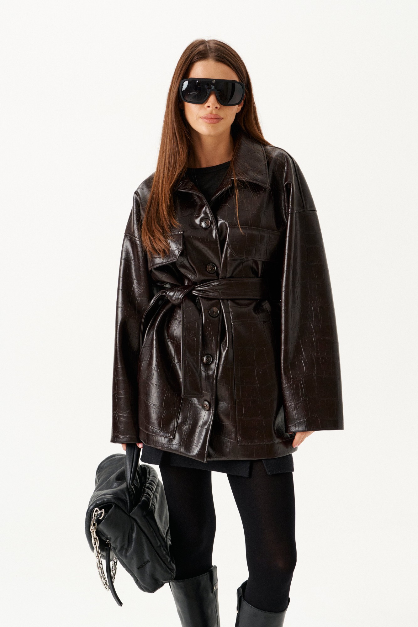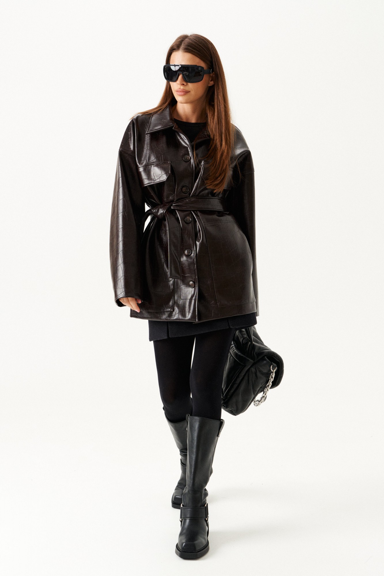 Куртка из искусственной кожи, прямого силуэта, со спущенной линией плеча, длиной ниже линии бедер, с центральной застежкой на петли и пуговицы, на подкладке. Полочки с двумя совмещенными накладными карманами – верхним с клапаном и нижним. Спинка со средним швом. Рукав втачной двухшовный. Воротник отложной с отрезной стойкой. В комплекте пояс из основной ткани.