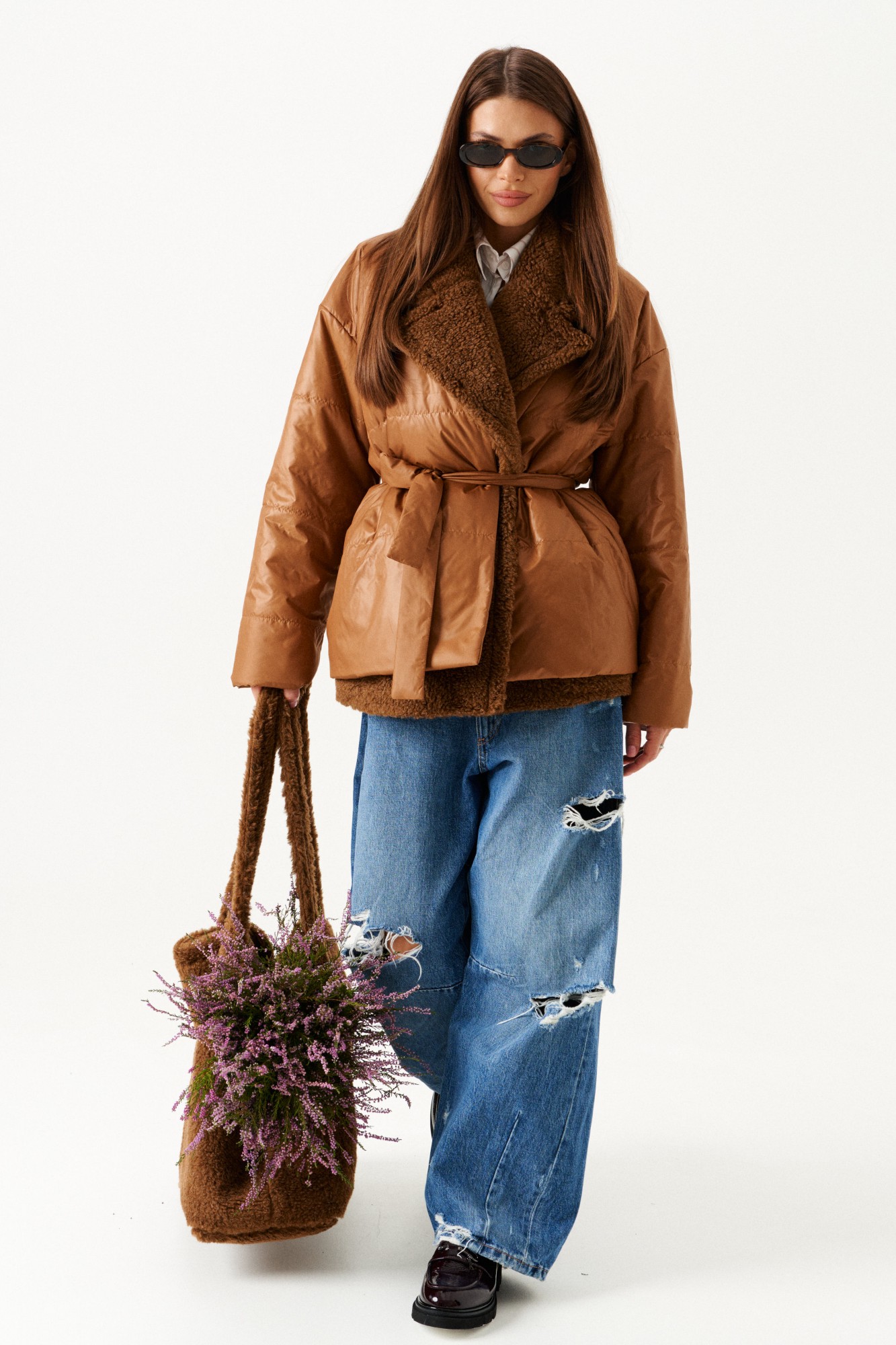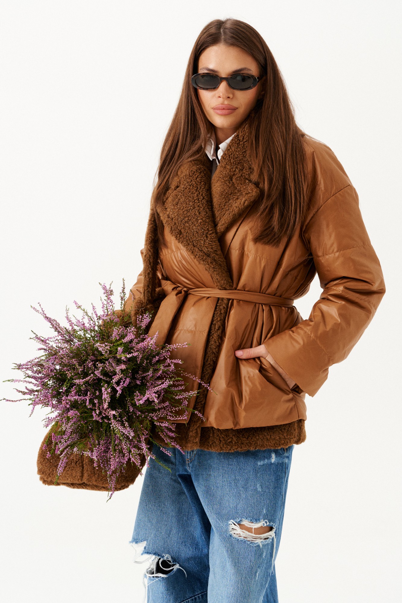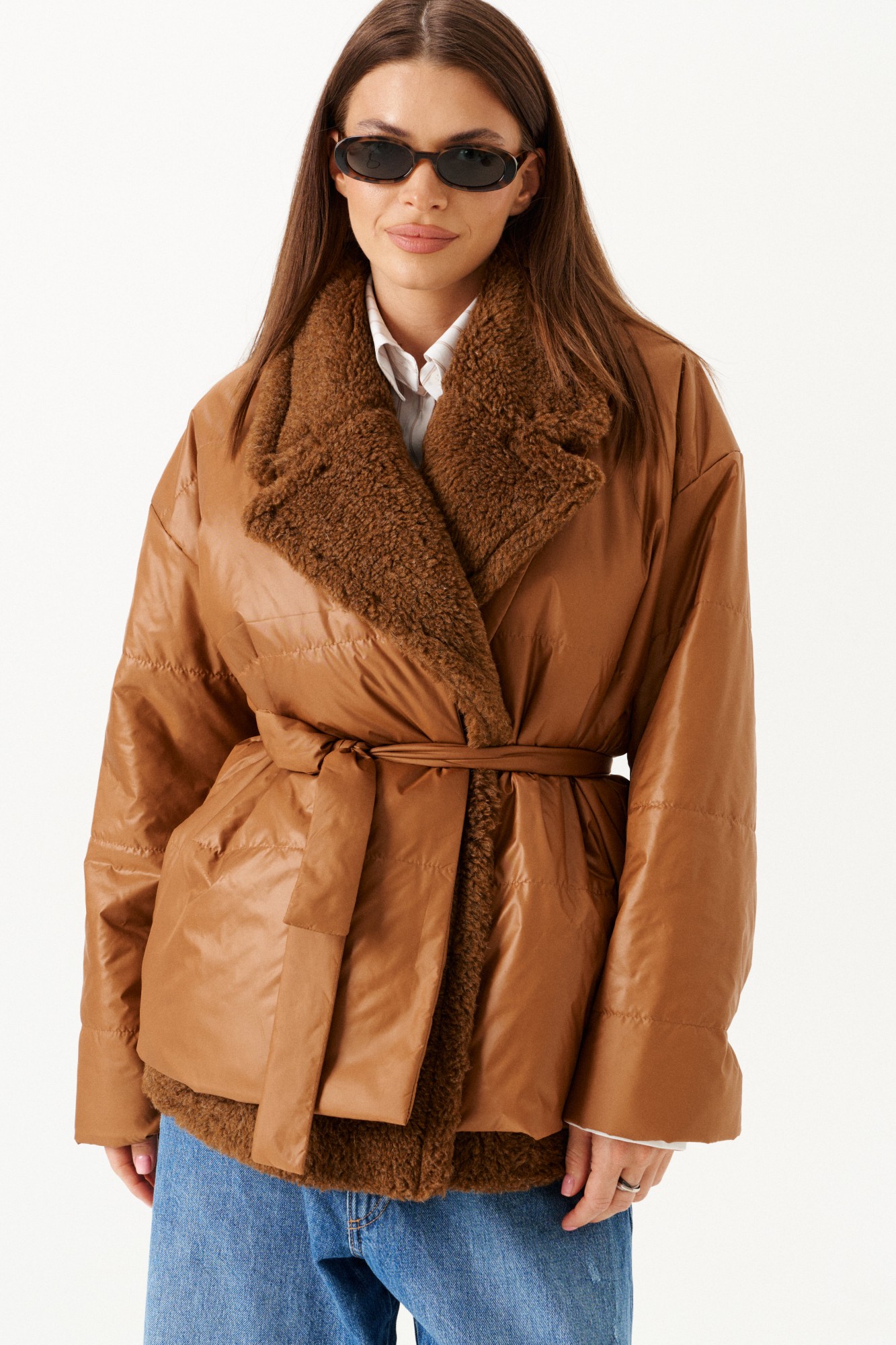 Куртка двойная из различных материалов. Верхняя куртка из плащевой ткани с утеплителем изософт 150г/м2, прямого силуэта, свободная, длиной до линии бедер, без застежки -под пояс (пояс из основной ткани в комплекте), с отложным воротником и лацканами, в боковых швах расположены карманы, рукав втачной, длинный. Внутренняя подстежка без рукава из искусственного меха на трикотажной основе, прямого силуэта, с центральной застежкой на потайную кнопку, с отложным воротником и лацканами, на подкладке.