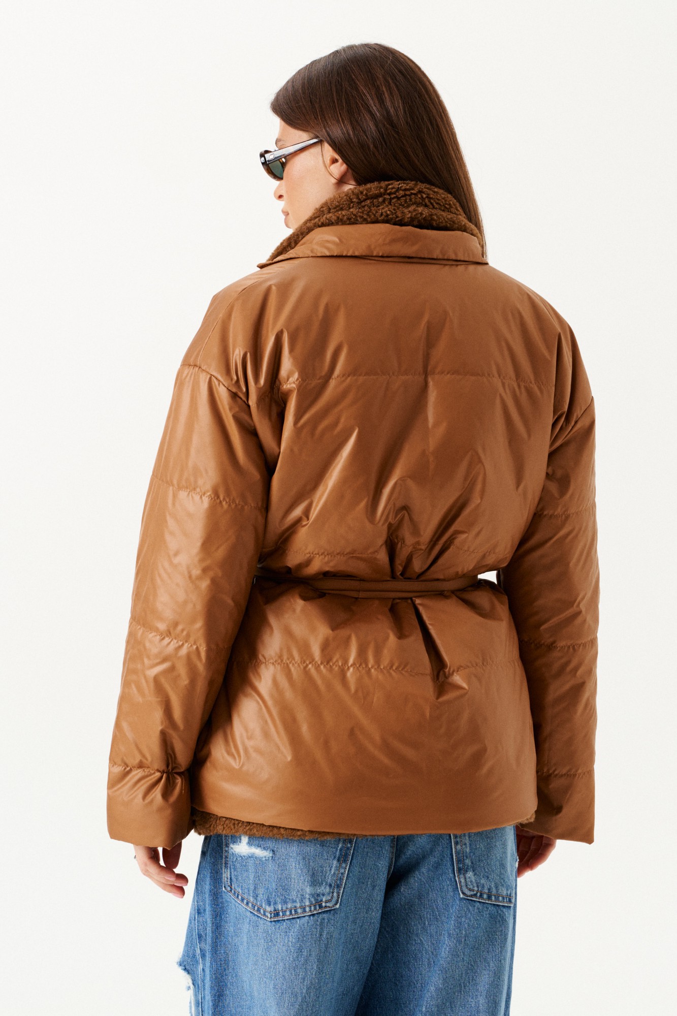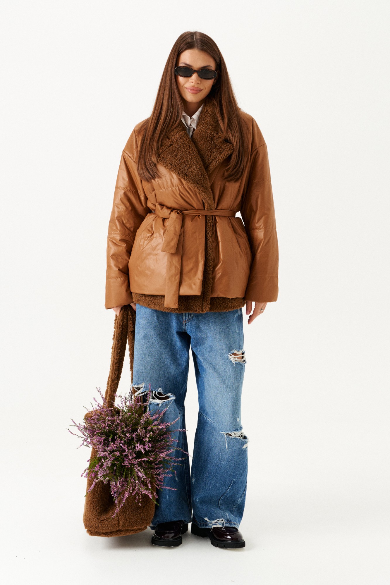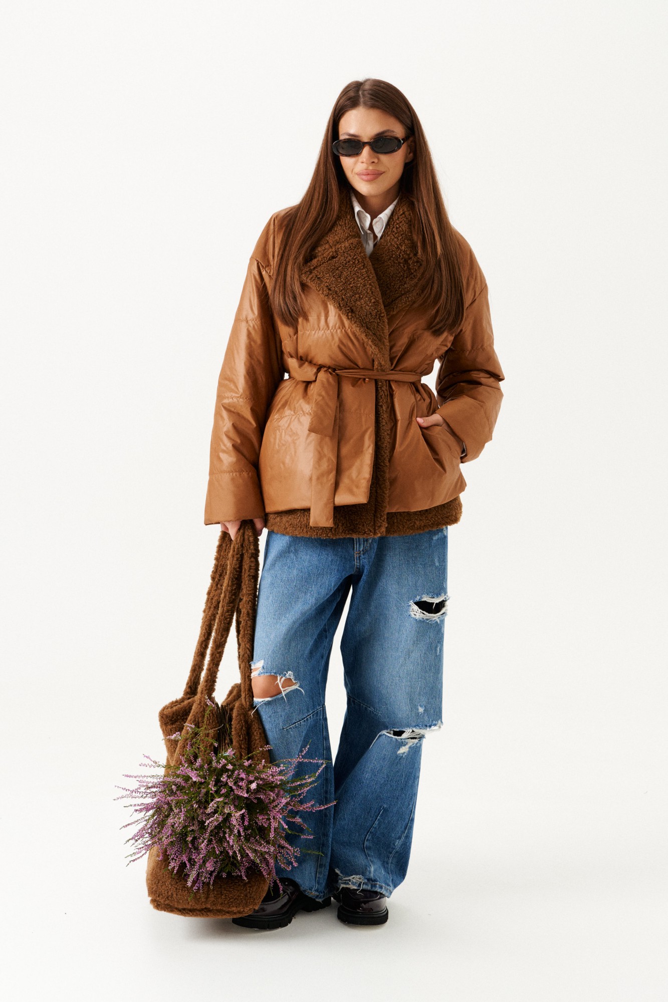 Куртка двойная из различных материалов. Верхняя куртка из плащевой ткани с утеплителем изософт 150г/м2, прямого силуэта, свободная, длиной до линии бедер, без застежки -под пояс (пояс из основной ткани в комплекте), с отложным воротником и лацканами, в боковых швах расположены карманы, рукав втачной, длинный. Внутренняя подстежка без рукава из искусственного меха на трикотажной основе, прямого силуэта, с центральной застежкой на потайную кнопку, с отложным воротником и лацканами, на подкладке.