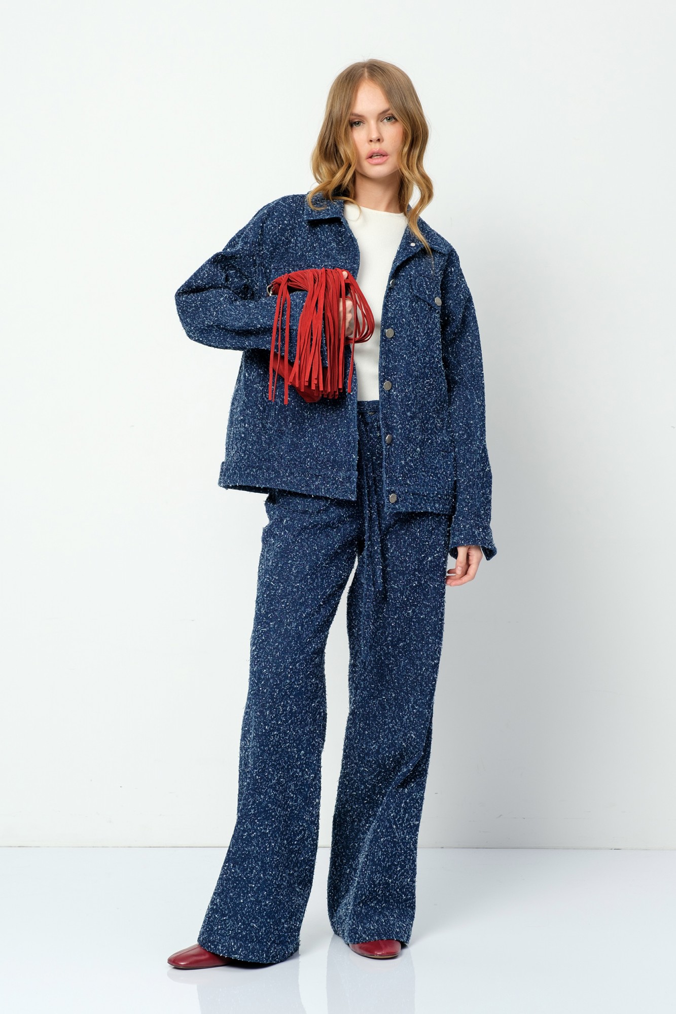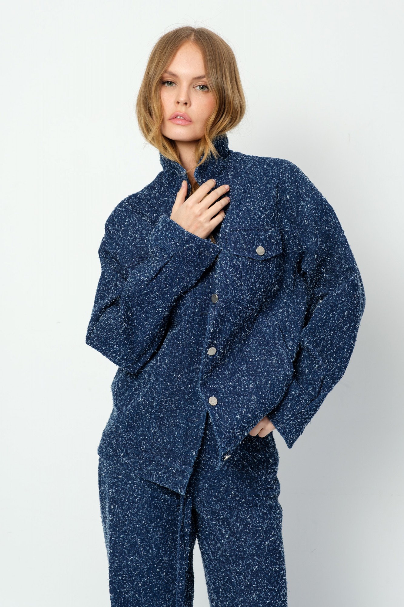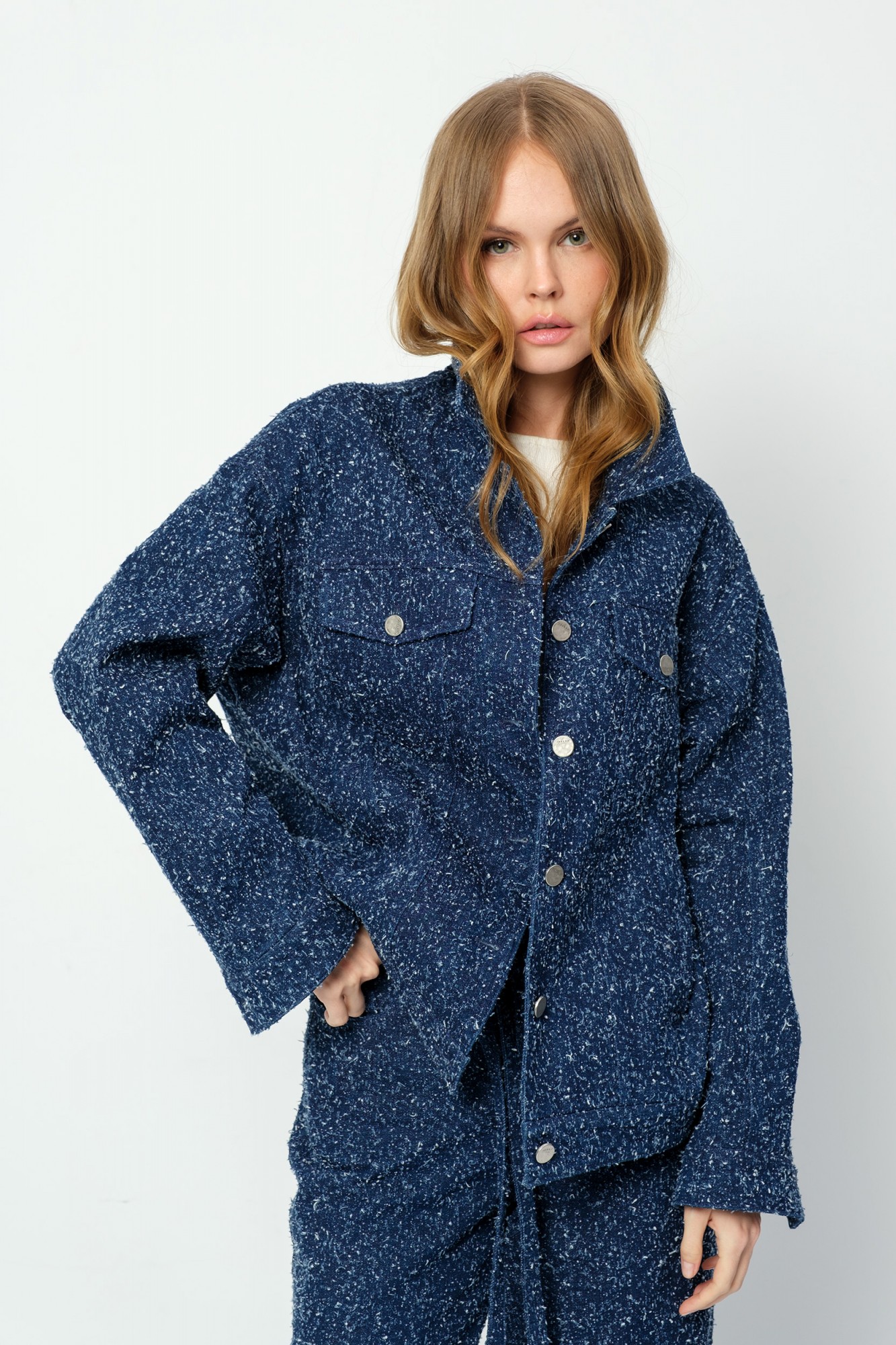 Свободная куртка из хлопкового джинса с перфорацией. Детали: куртка прямого силуэта, спущенная линия плеча, кокетки переда и спинки, рельефные швы, функциональные карманы, застежка на петли и металлические пуговицы, рукава длинные с притачными манжетами.