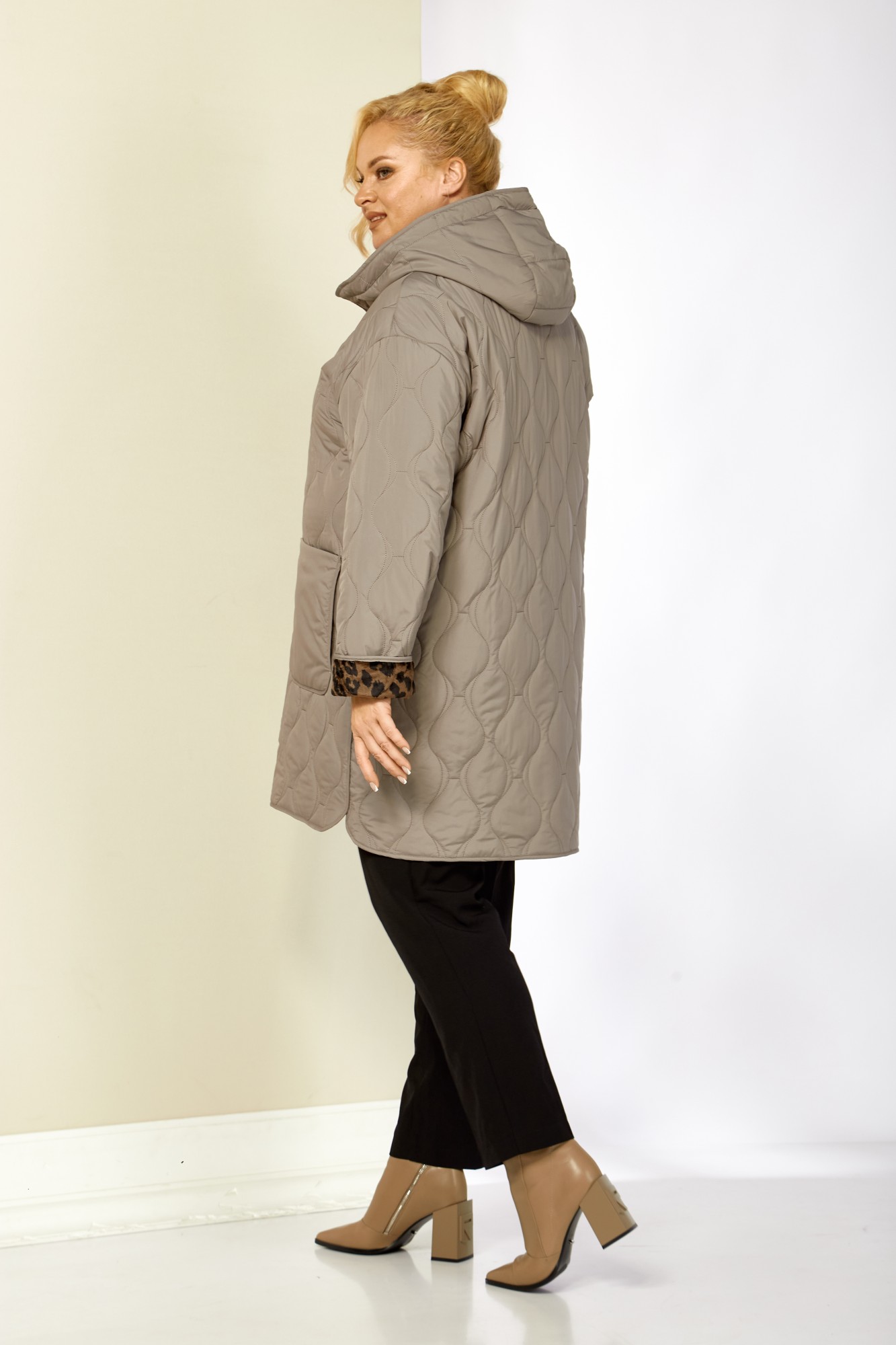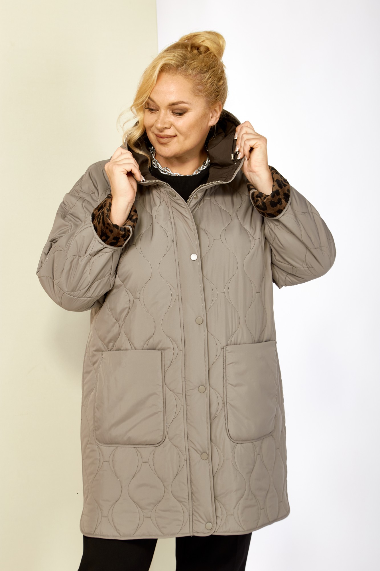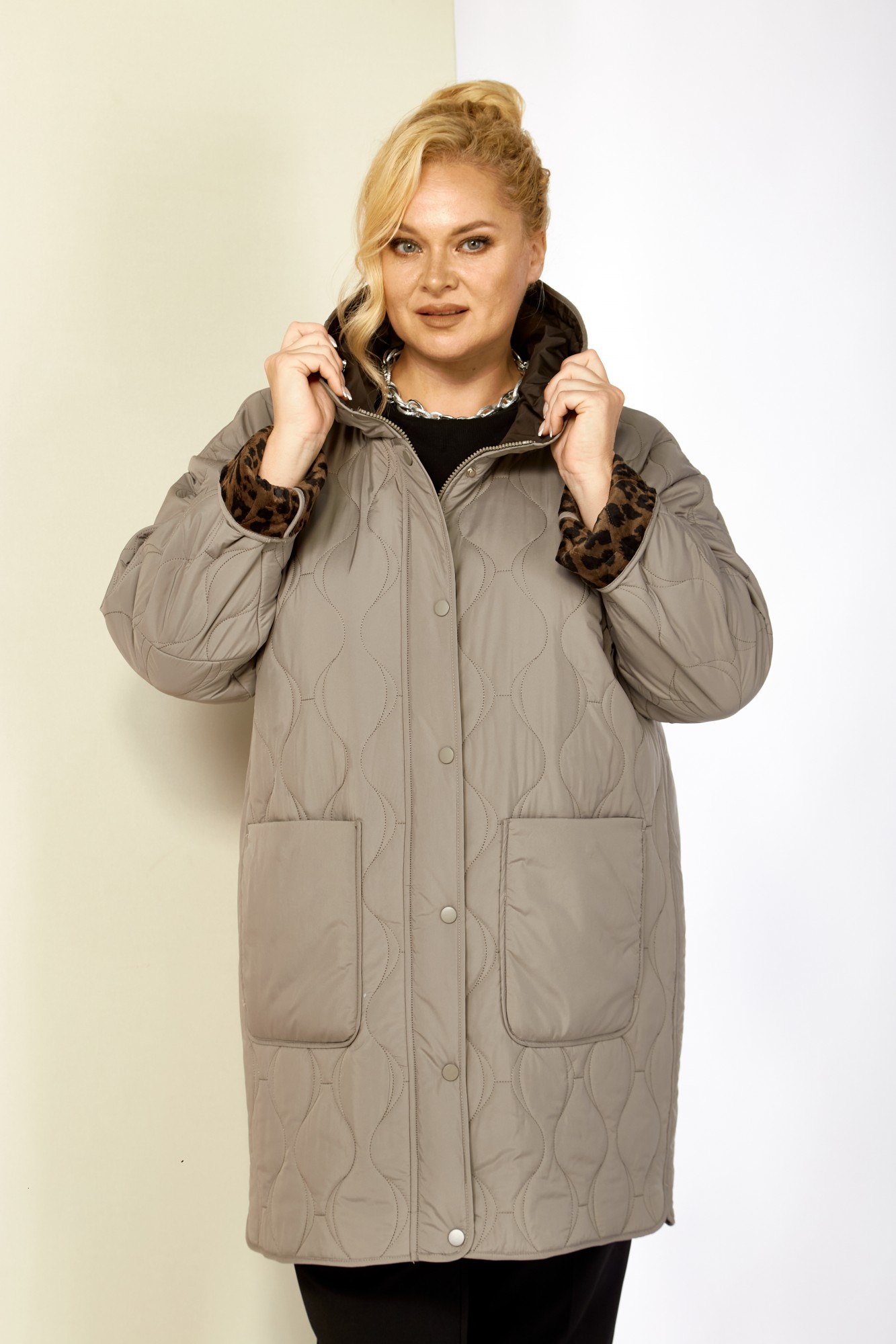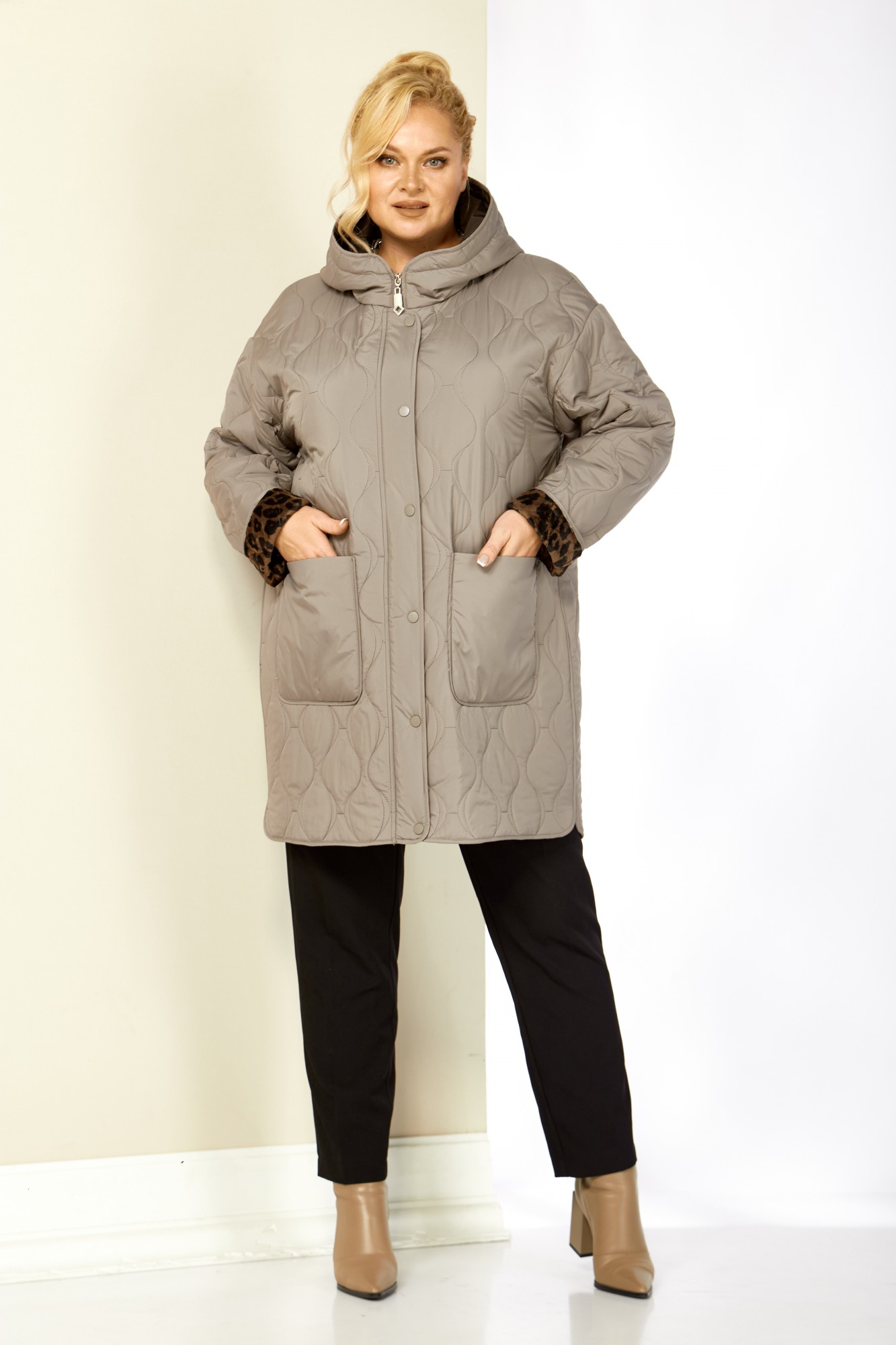 Модная утепленная демисезонная женская куртка на стеганной, мягкой плюшевой подкладке контрастного цвета. Представляет собой идеальный выбор на осень и весну для женщин, ищущих комфорт и стиль. Изделие выполнена из мягкой, матовой курточной ткани, при этом довольно легкой, с водоотталкивающей пропиткой, на тонком синтепоне. Все внутренние срезы и швы окантованы. Передняя часть куртки с накладными глубокими карманами на внутренних магнитах. Застежка центральная на двухбегунковой молнии (расстёгивается как снизу так и сверху) и планкой на металлические кнопки, имеет длину от линии низа до верхнего края воротника-стойки переходящего в капюшон. Капюшон глубокий, не съемный. Рукав со спущенной линией плеча с отворотом в тон подкладки, что придает изделию стильность. Низ боковых швов фигурный. Куртка идеально подойдет для осенних дней, обеспечит теплом и комфортом. Благодаря своему стильному дизайну и высокому качеству исполнения, эта куртка станет незаменимой вещью в гардеробе.