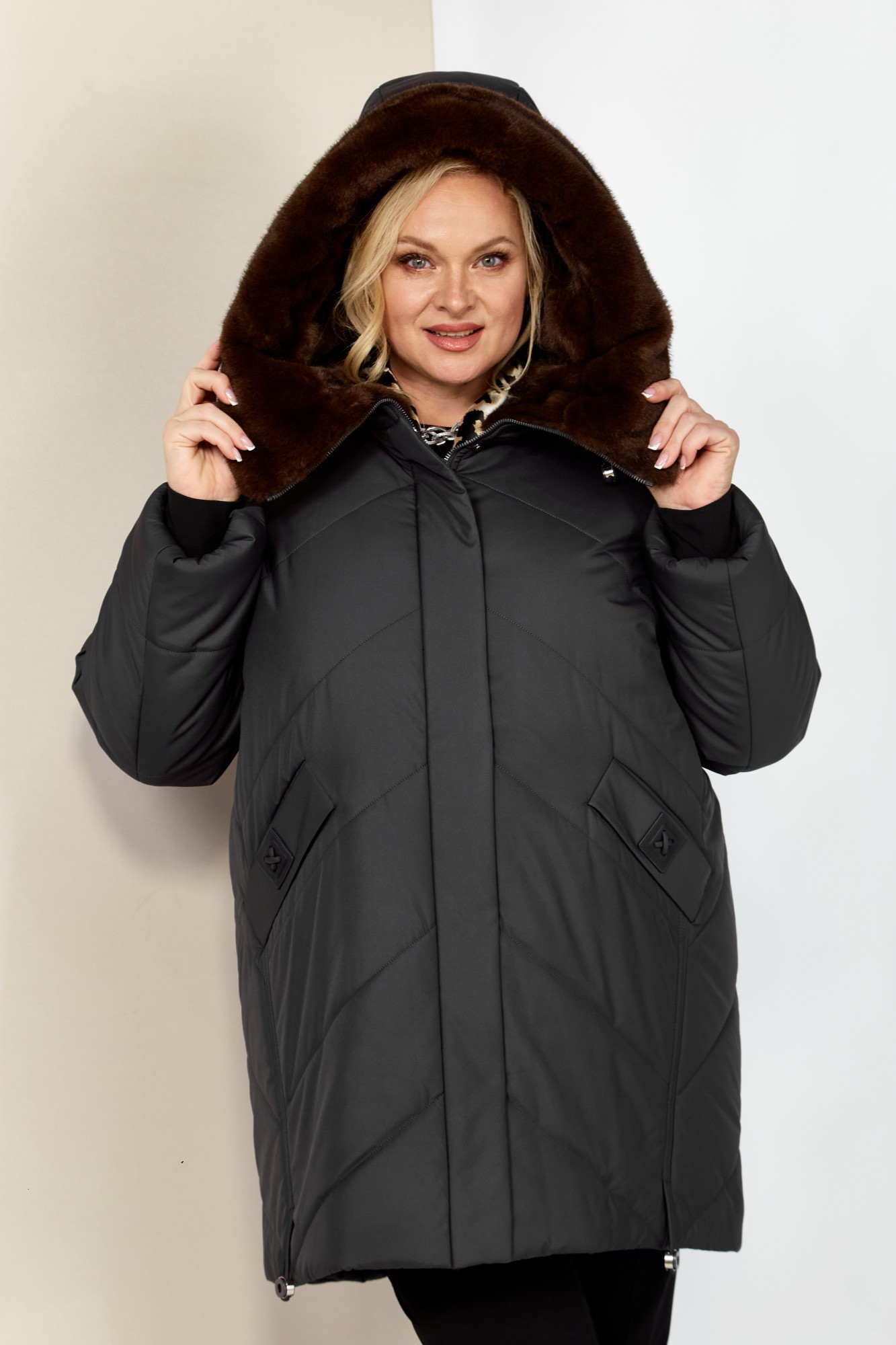 Зимняя, модная женская куртка, которая идеально подойдет для холодных дней, обеспечивая комфорт и защиту от ветра. Изделие прямого, классического стиля, выполнена из курточной матовой ткани высокого качества, непромокаемая. Утеплитель «Верблюжья шерсть» хорошо держит форму и не сбивается. По переду центральная застежка на молнии с планкой на металлические кнопки. Карманы прорезного типа на магнитах и декоративным элементом. Рукав втачной. Для защиты от ветра и мороза, рукава по низу дополнены внутренними трикотажными манжетами. Капюшон не съемный, регулируется декоративным шнуром. Внутренняя часть капюшона отделана мехом, максимально по внешнему виду приближенного к натуральному «Норка». Боковые швы оформлены декоративным шнуром. Спинка цельная. Низ изделия на регулируемой кулисе, что позволит сохранить тепло в холодное время года.