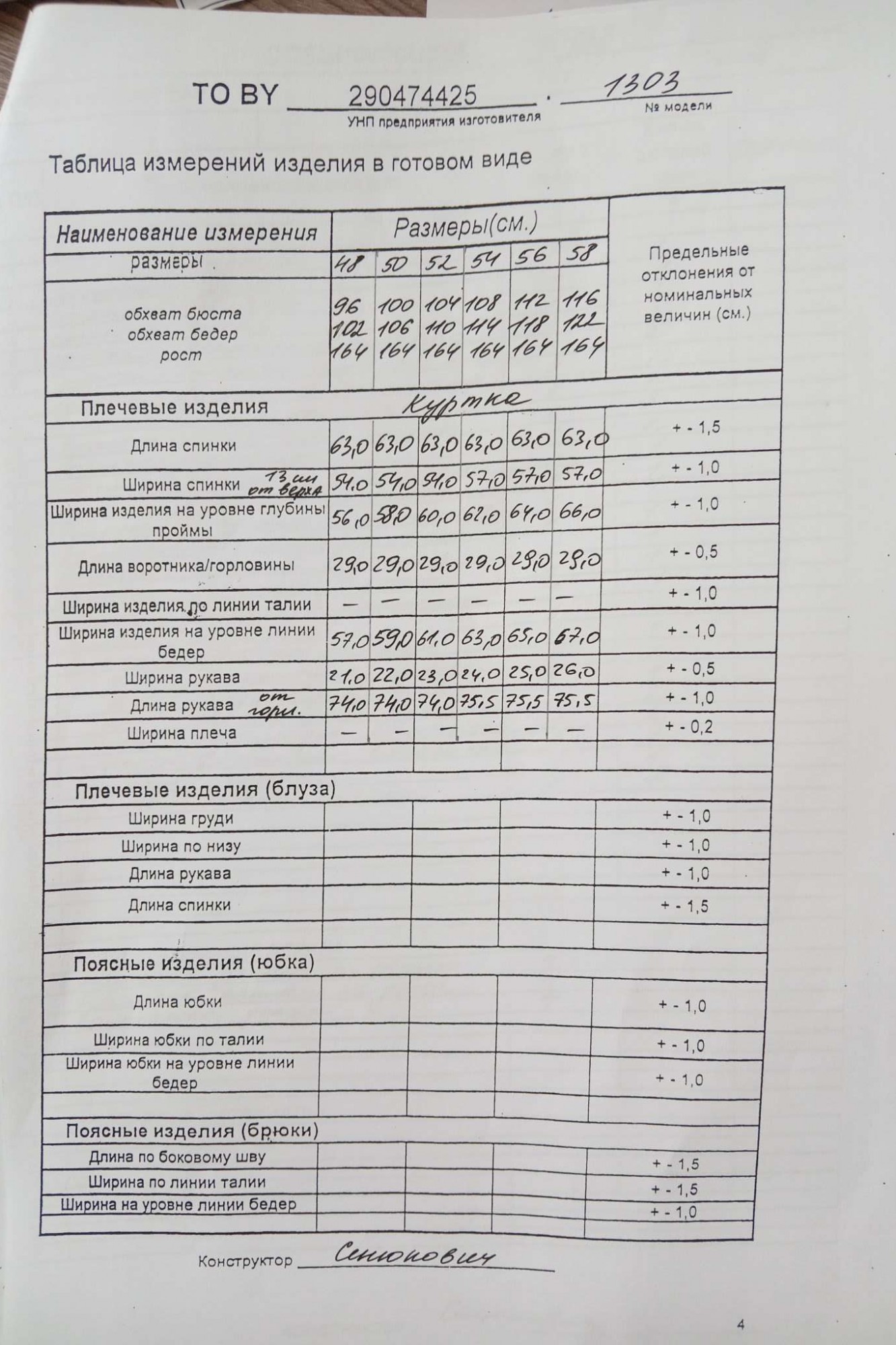 Таблица размеров